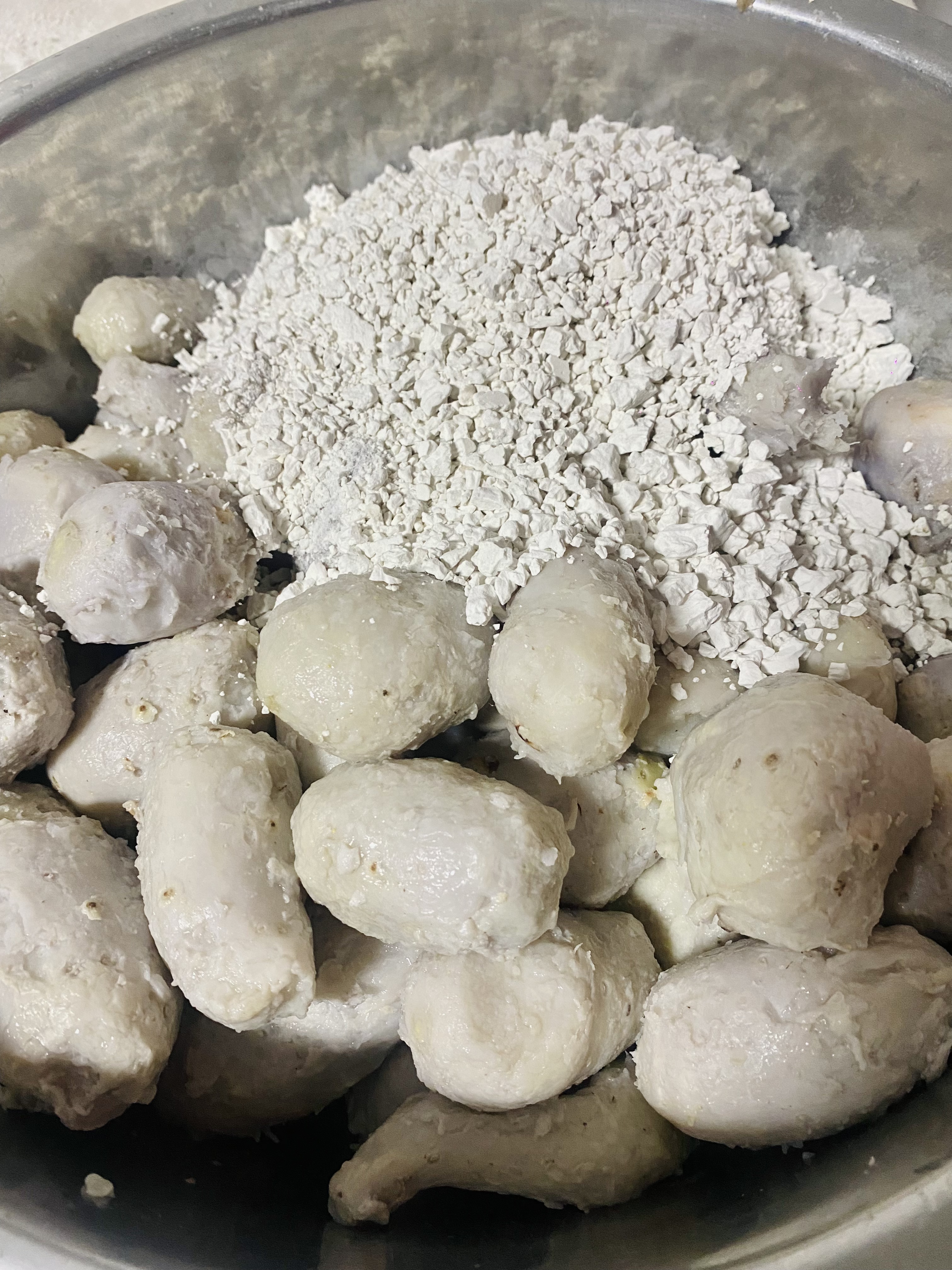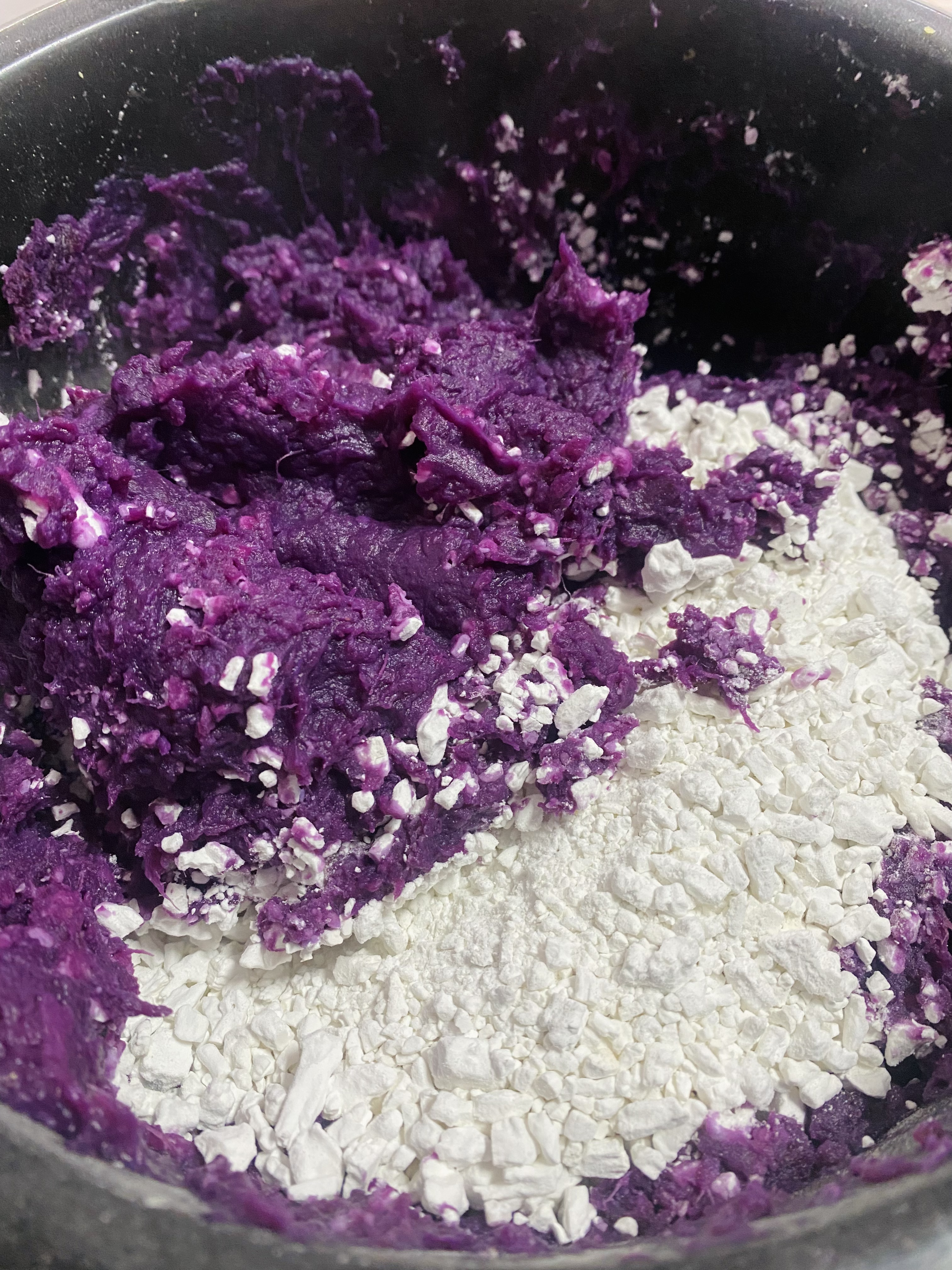 芋头每个都要挑选过,去除烂的,蒸熟剥皮做成芋泥,红薯粉要选择农家大颗粒的,这样的口感更好,分批次和芋泥搅拌在一起,不断的揉捏成团。