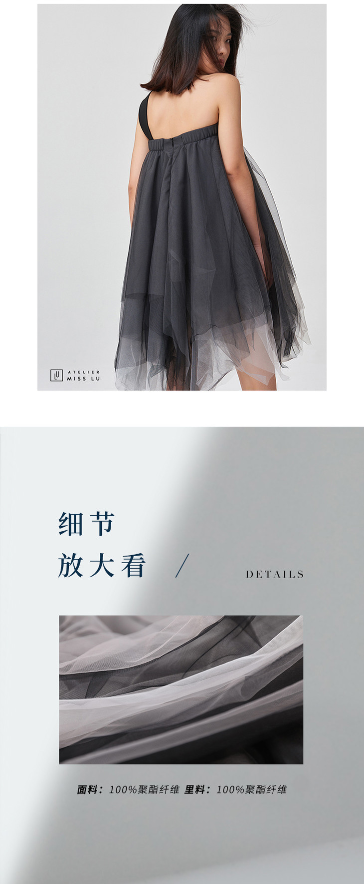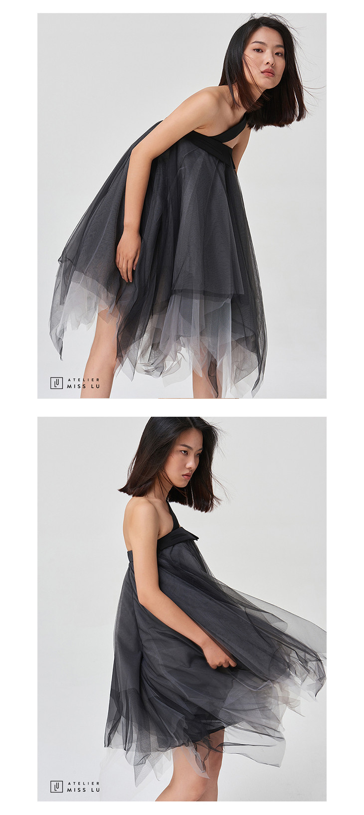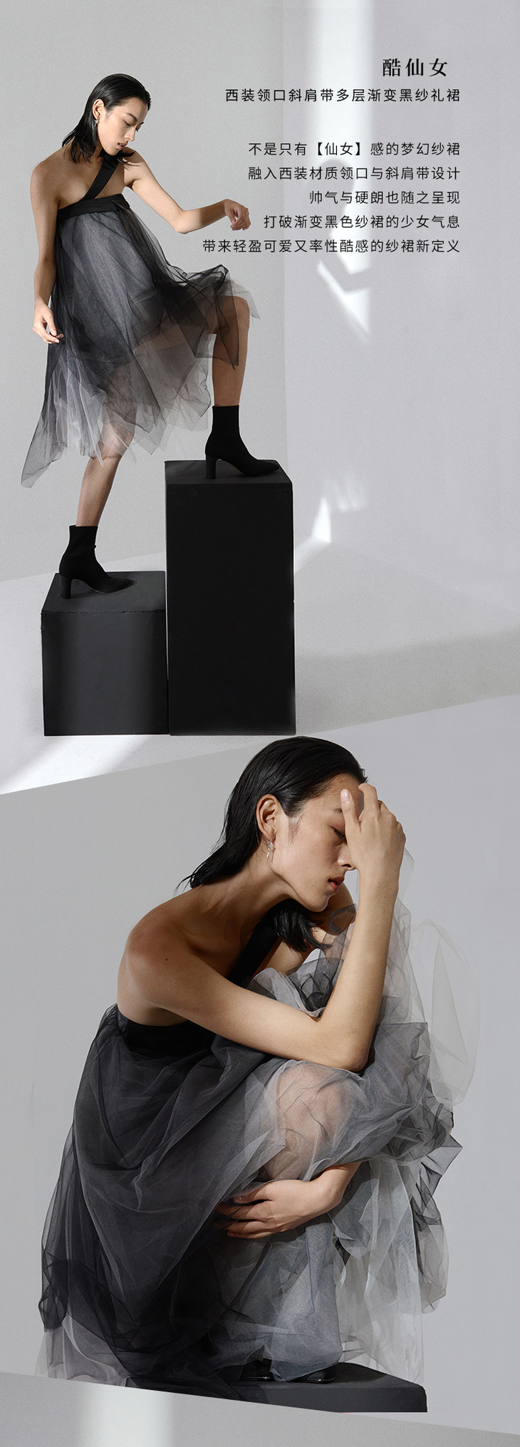 【酷仙女】西装领口斜肩带多层渐变黑纱礼裙