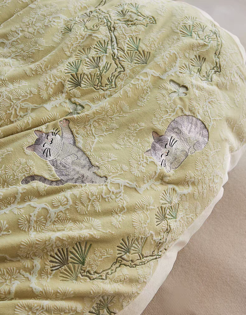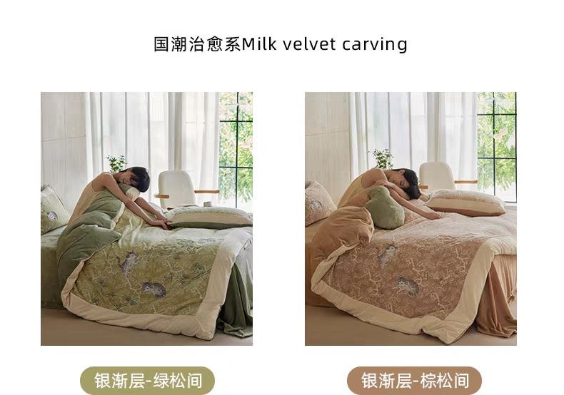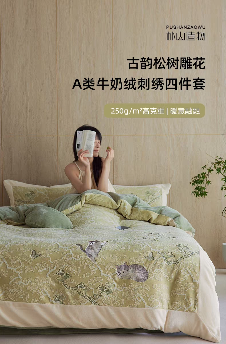 新中式A类雕花牛奶绒四件套古韵猫咪戏蝶加厚蓄热珊瑚绒三件套冬