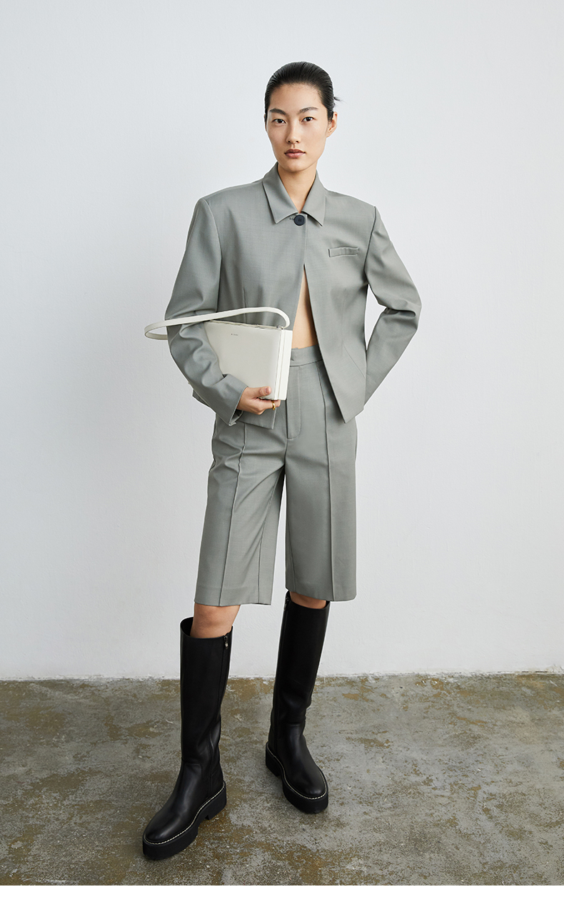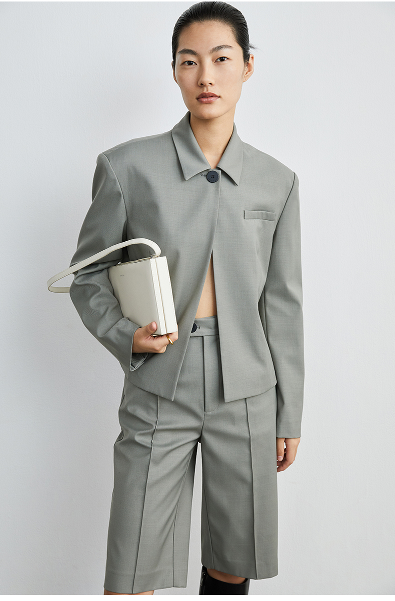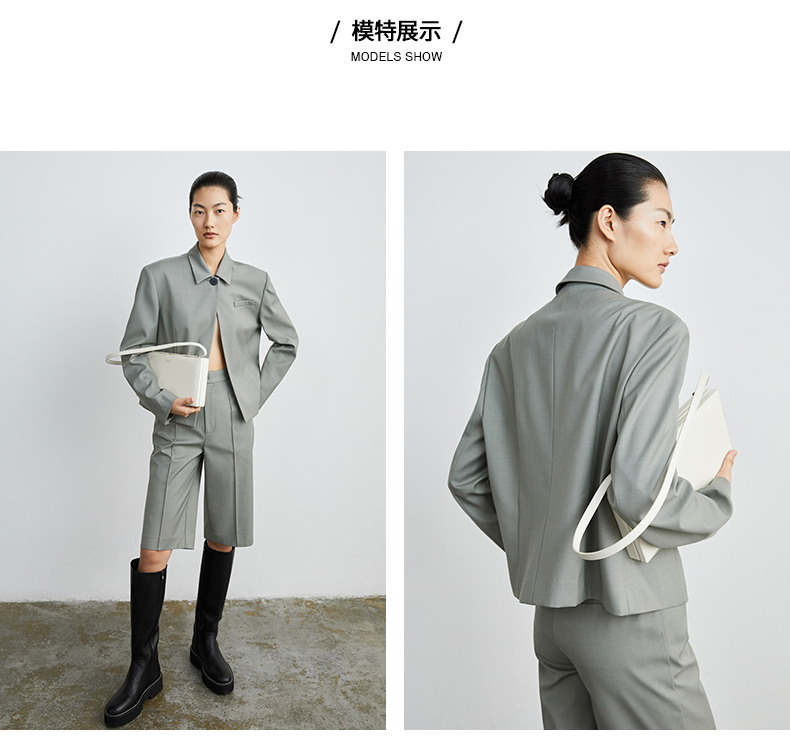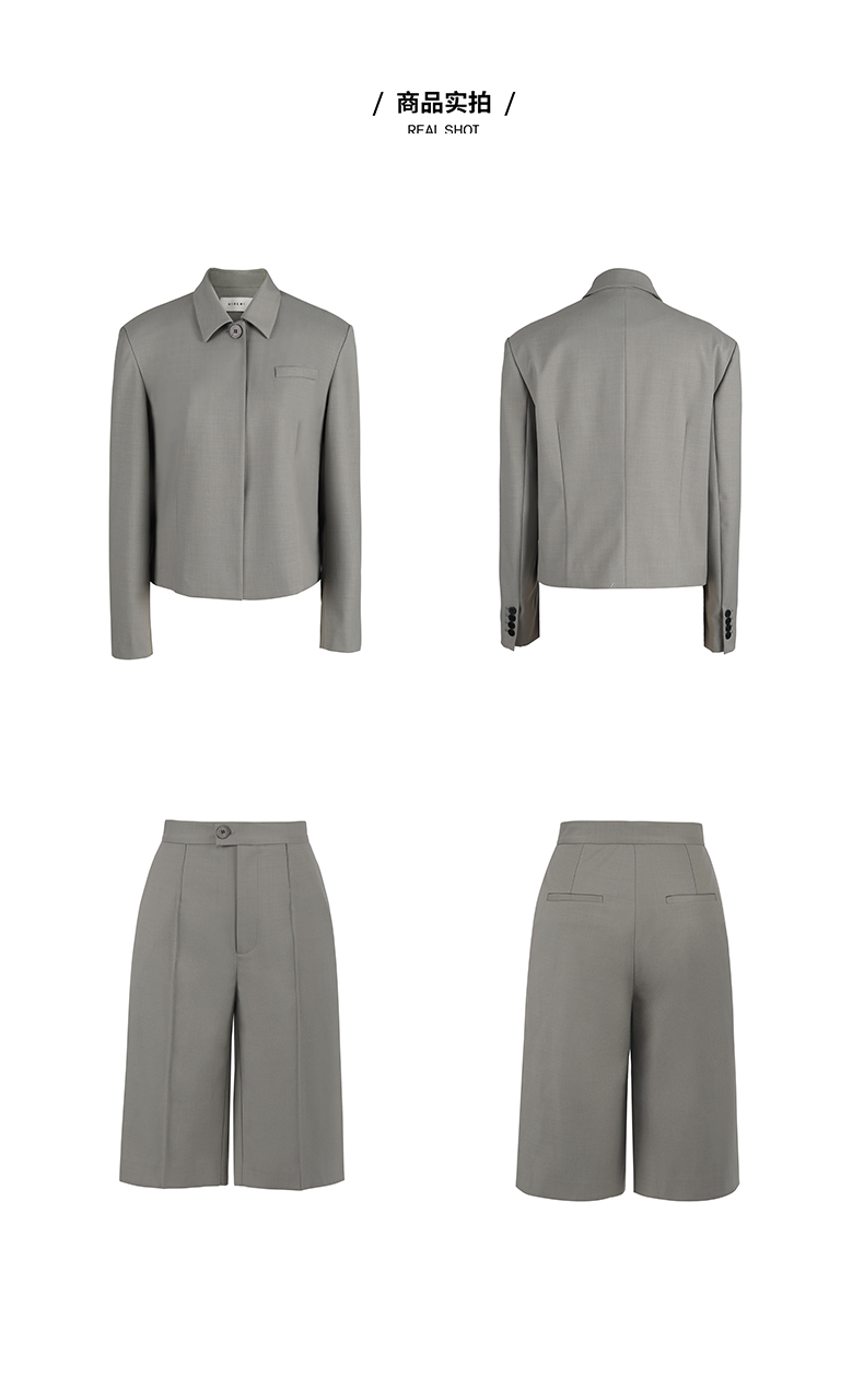 HIDEMI 斑鸠灰羊毛西装垫肩外套套装 短外套/中短裤