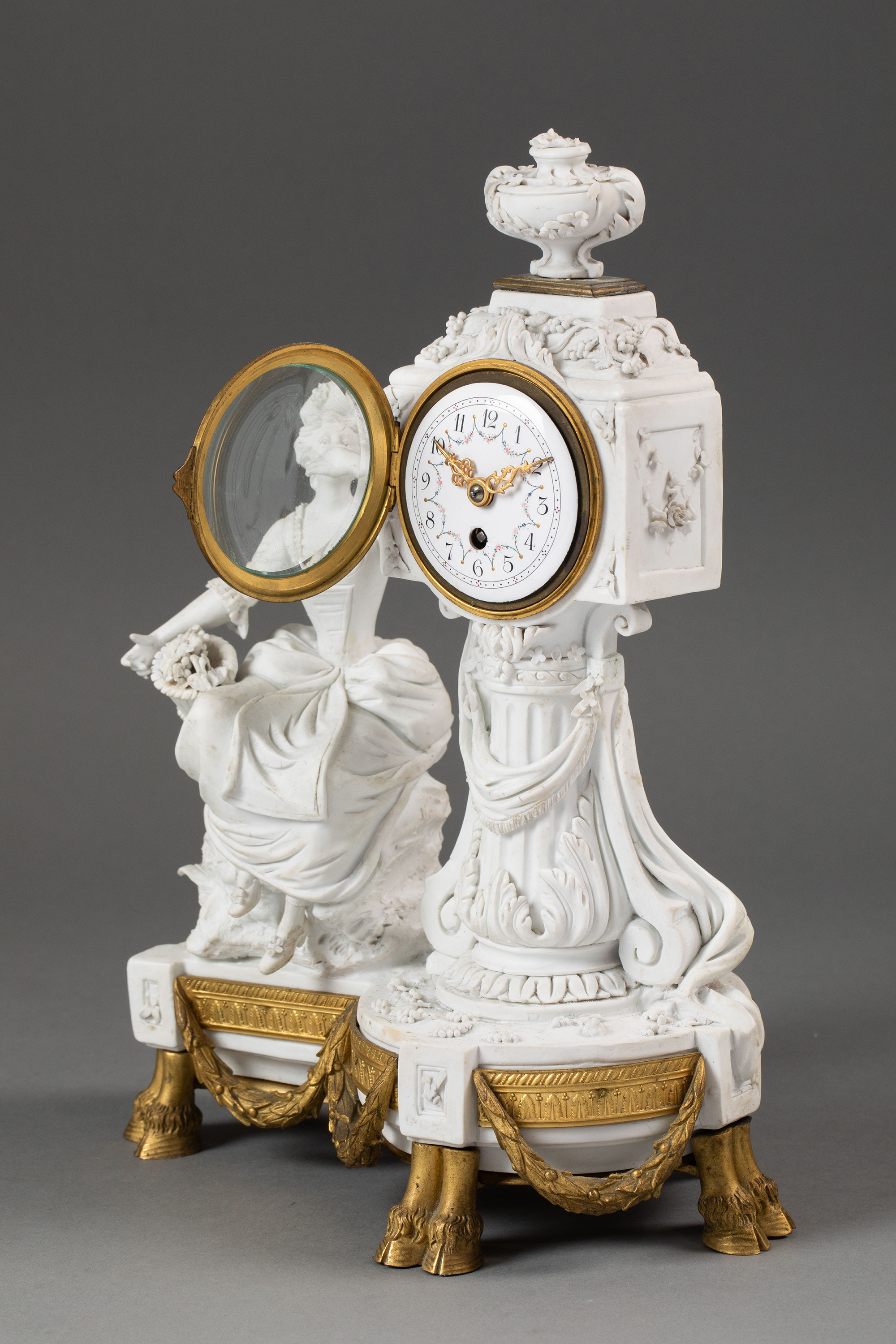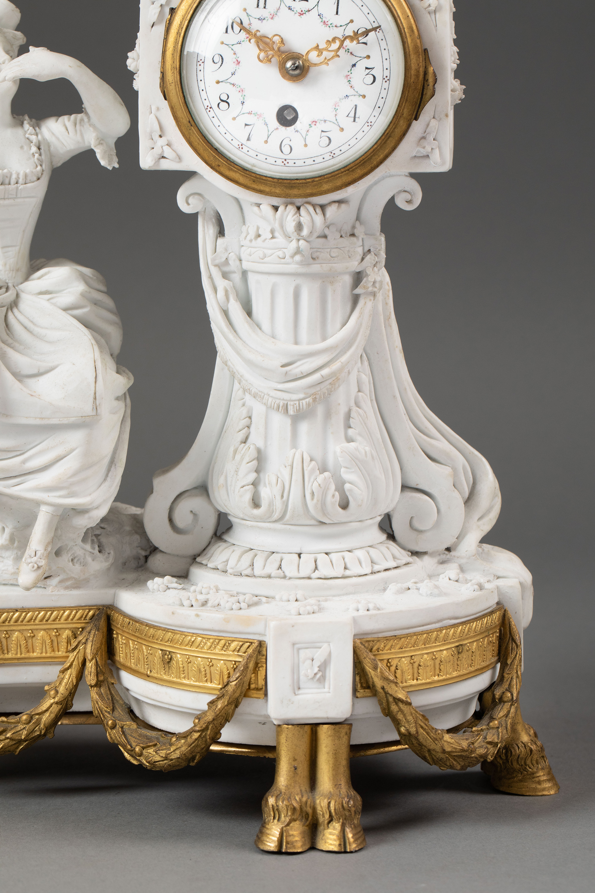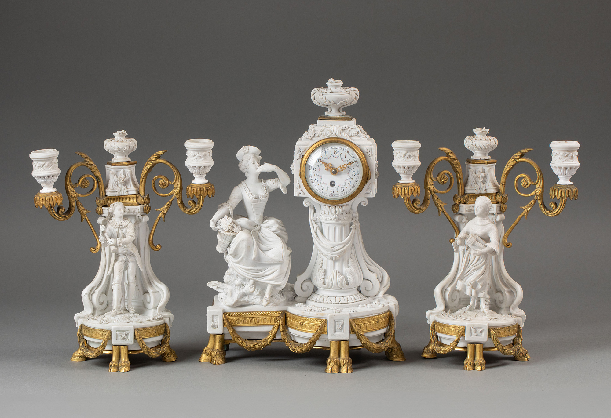 独角鹿西洋古董19世纪末法国出品卷叶纹铜鎏金精雕装饰古典人物主题素胎瓷雕座钟烛台三件套
