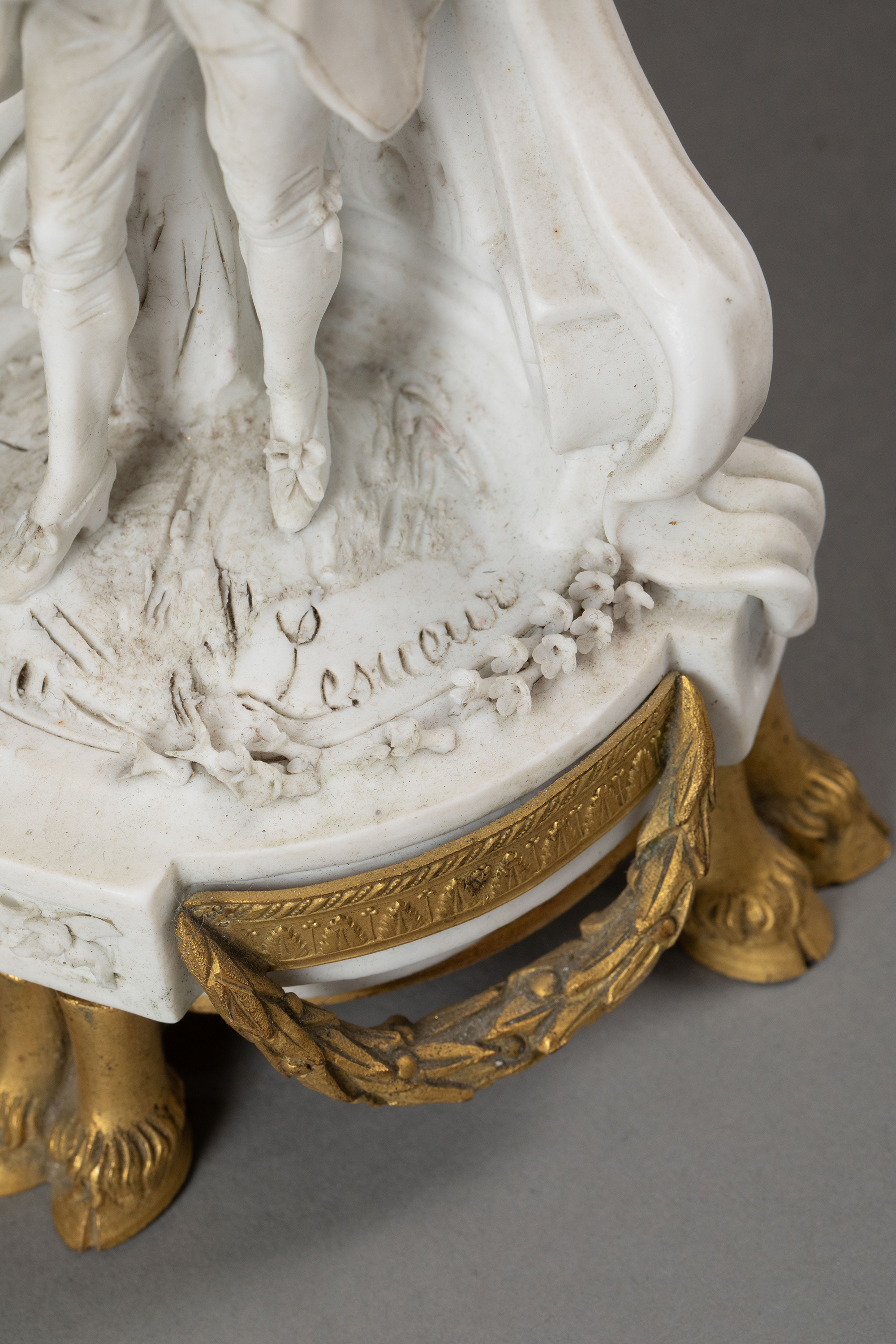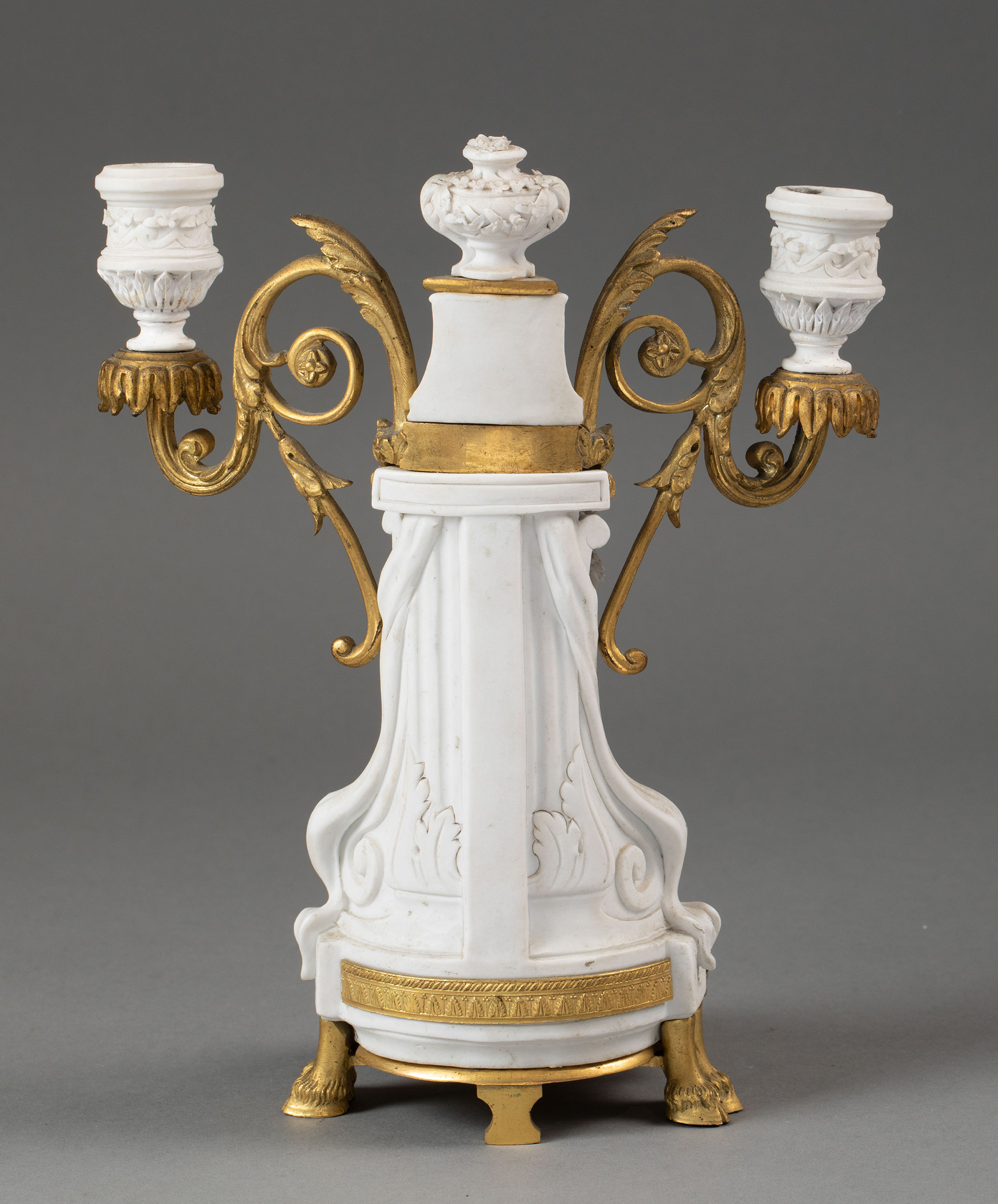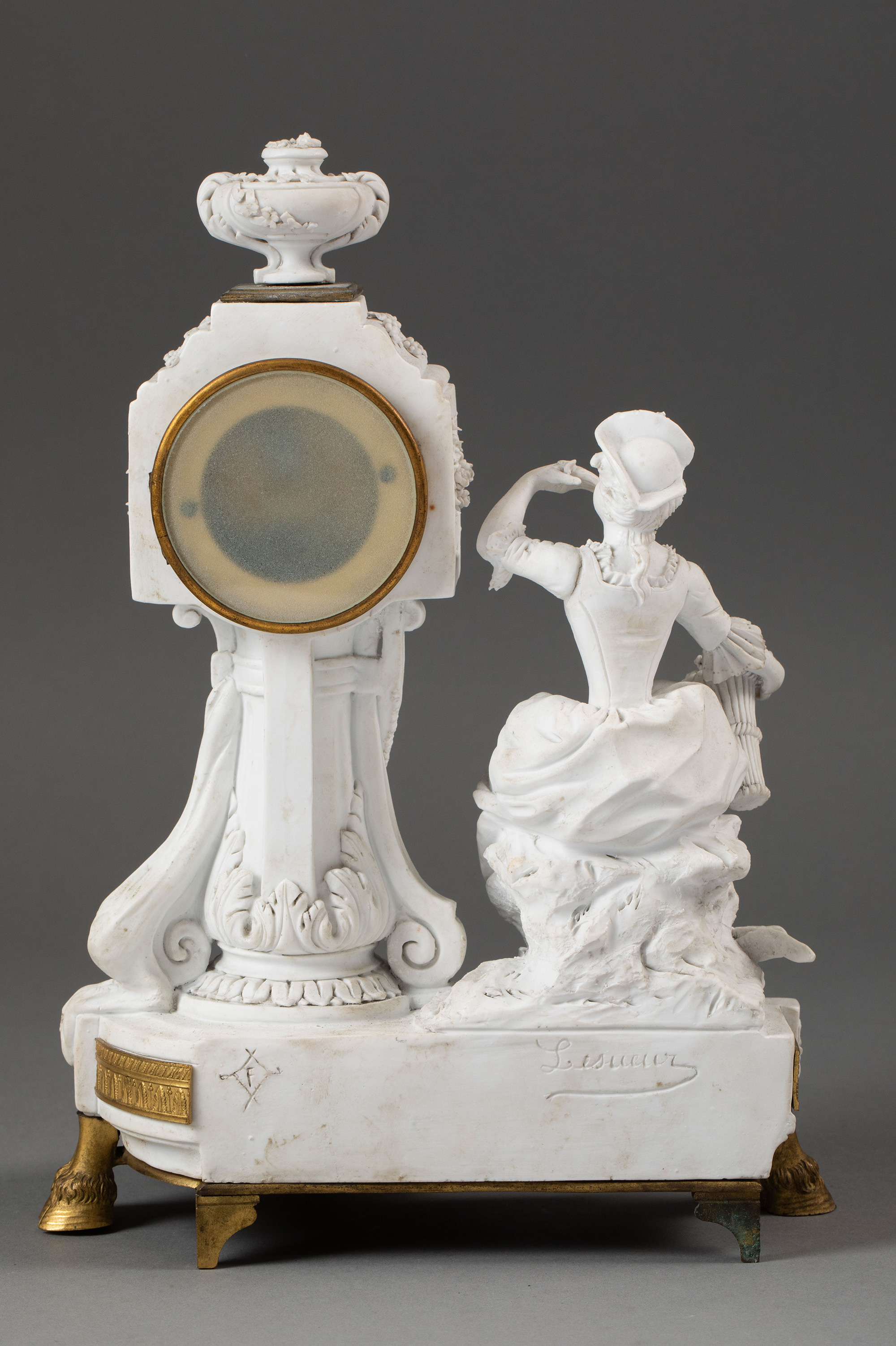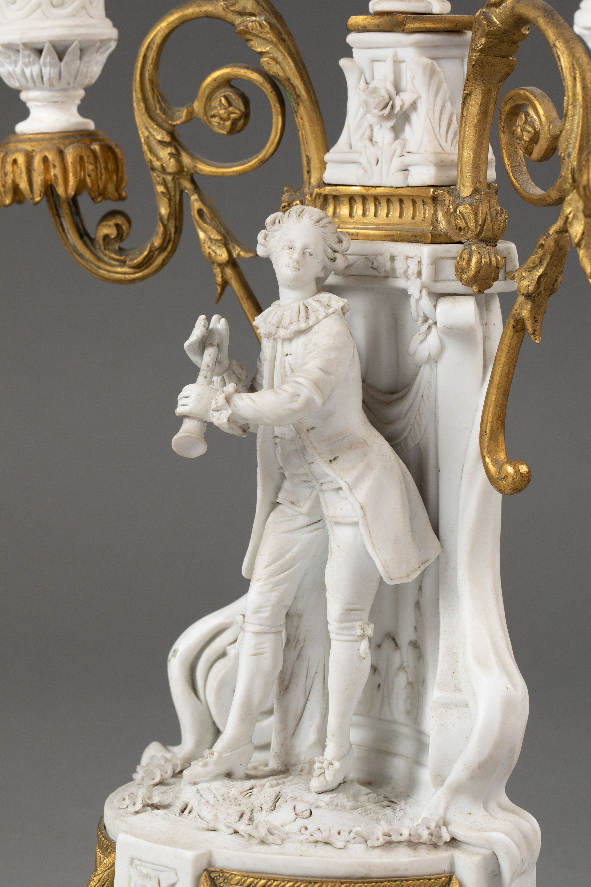 独角鹿西洋古董19世纪末法国出品卷叶纹铜鎏金精雕装饰古典人物主题素胎瓷雕座钟烛台三件套