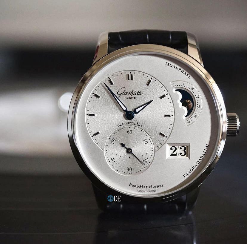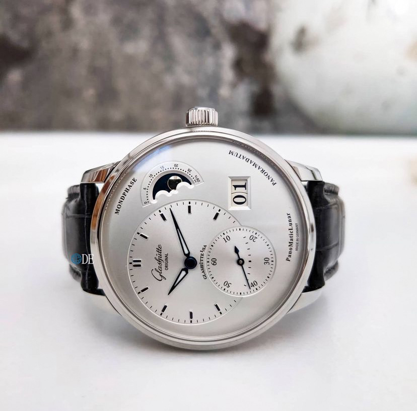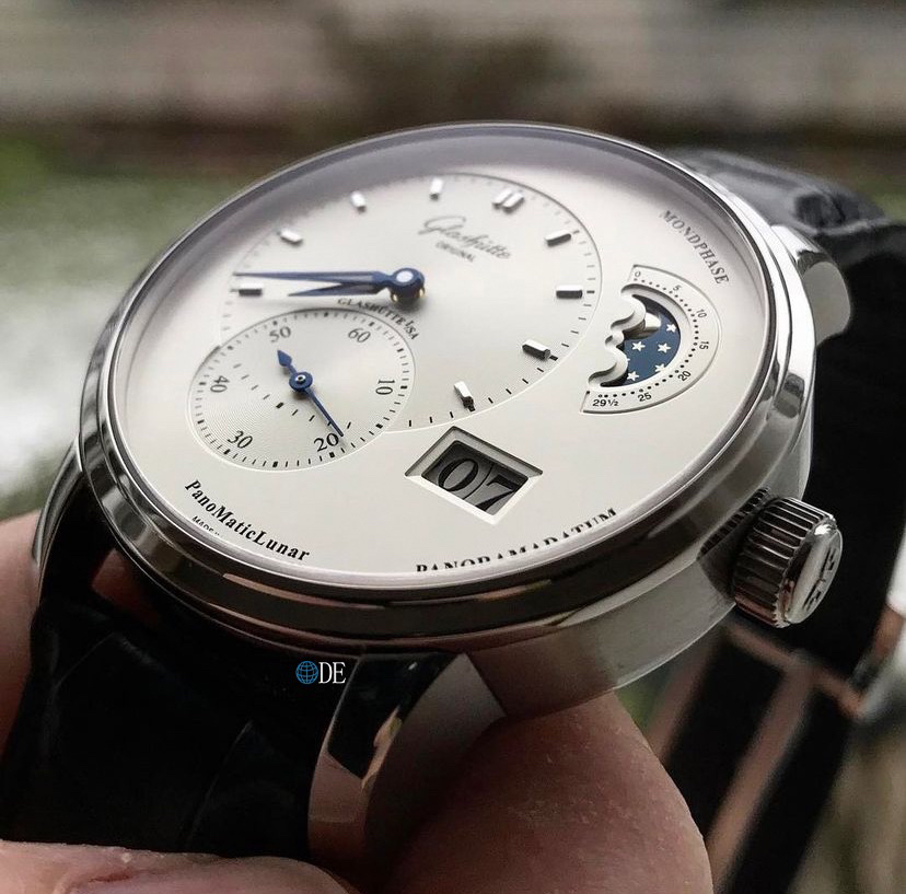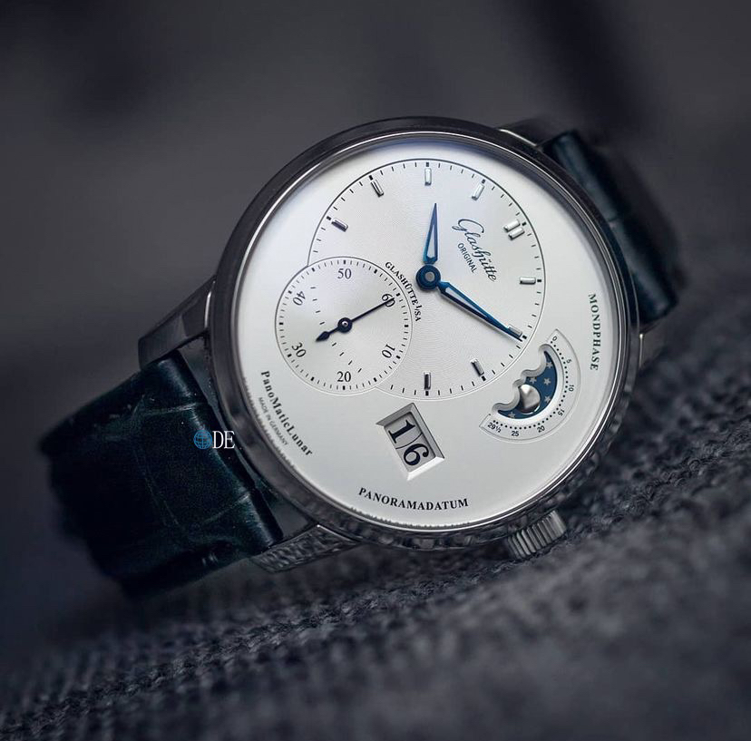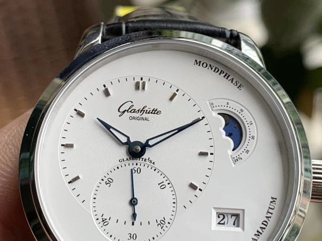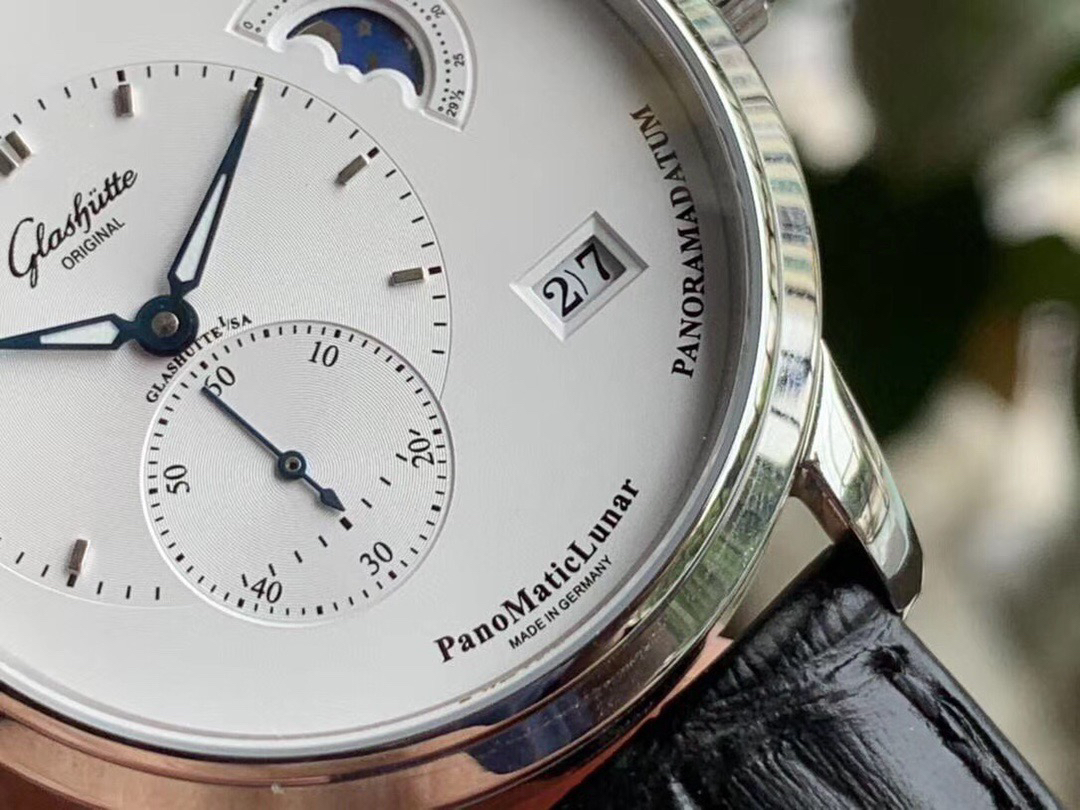 NOOB工厂最有“德味儿”的腕表———格拉苏蒂原创90偏心大日历月相,订制机芯的双跳大日历显示,日期显示的个位和十位并不在同一个日期圈上,有两个独立的显示盘,采用双模组设计