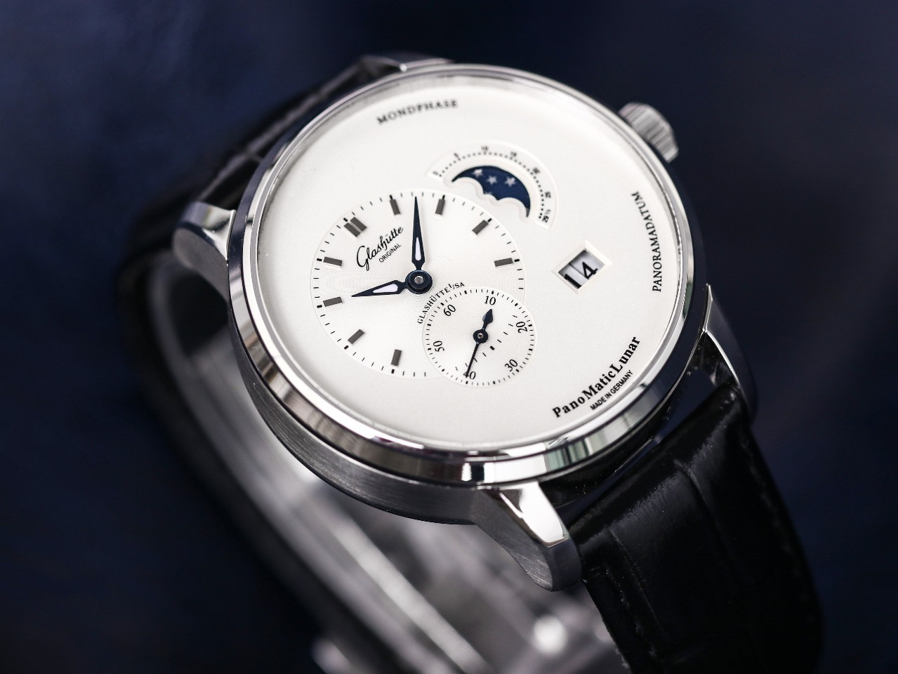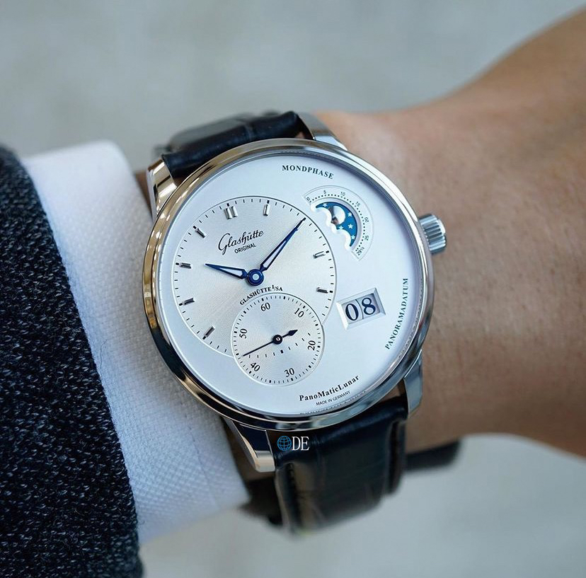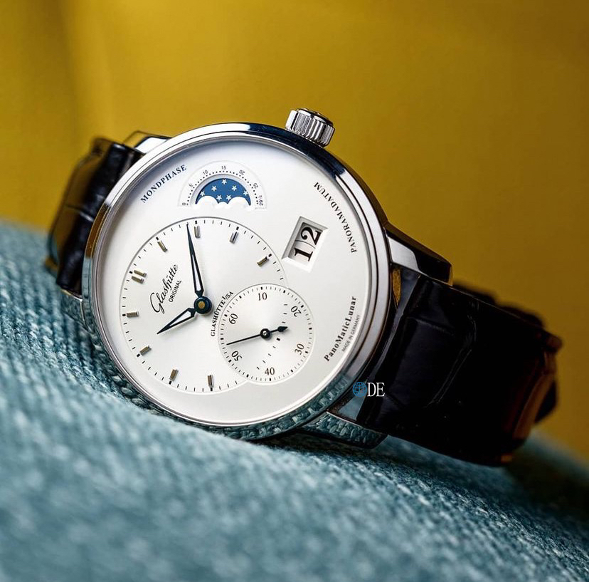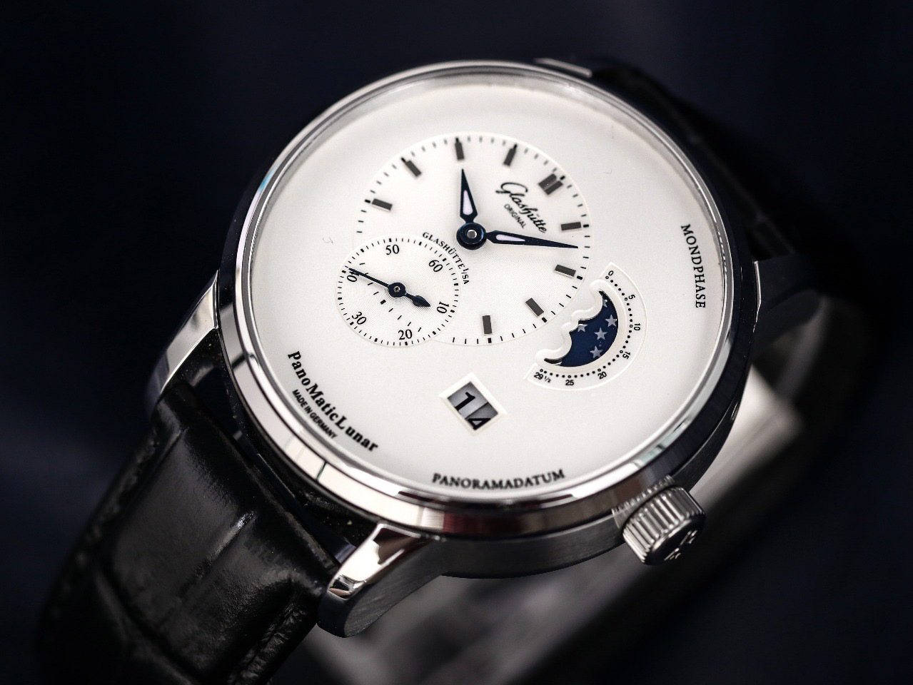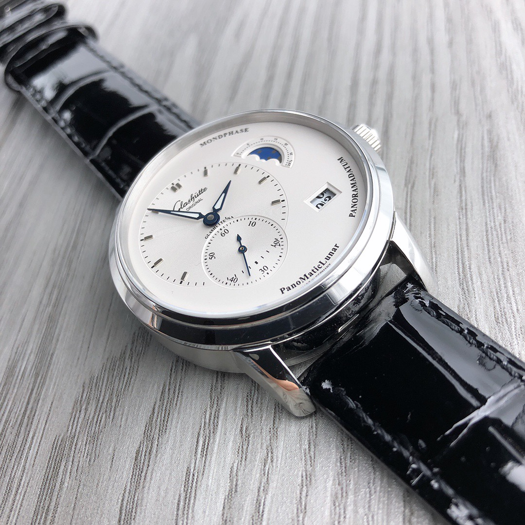 NOOB工厂最有“德味儿”的腕表———格拉苏蒂原创90偏心大日历月相,订制机芯的双跳大日历显示,日期显示的个位和十位并不在同一个日期圈上,有两个独立的显示盘,采用双模组设计