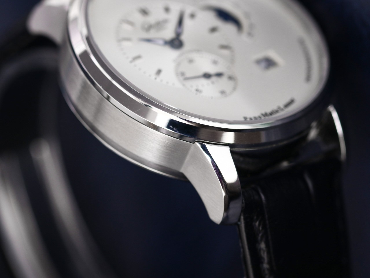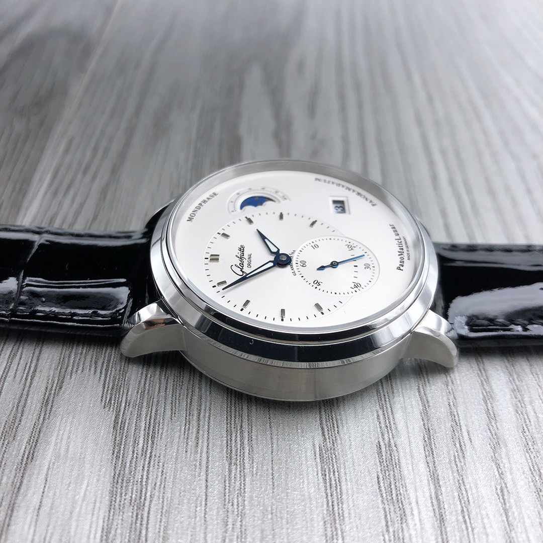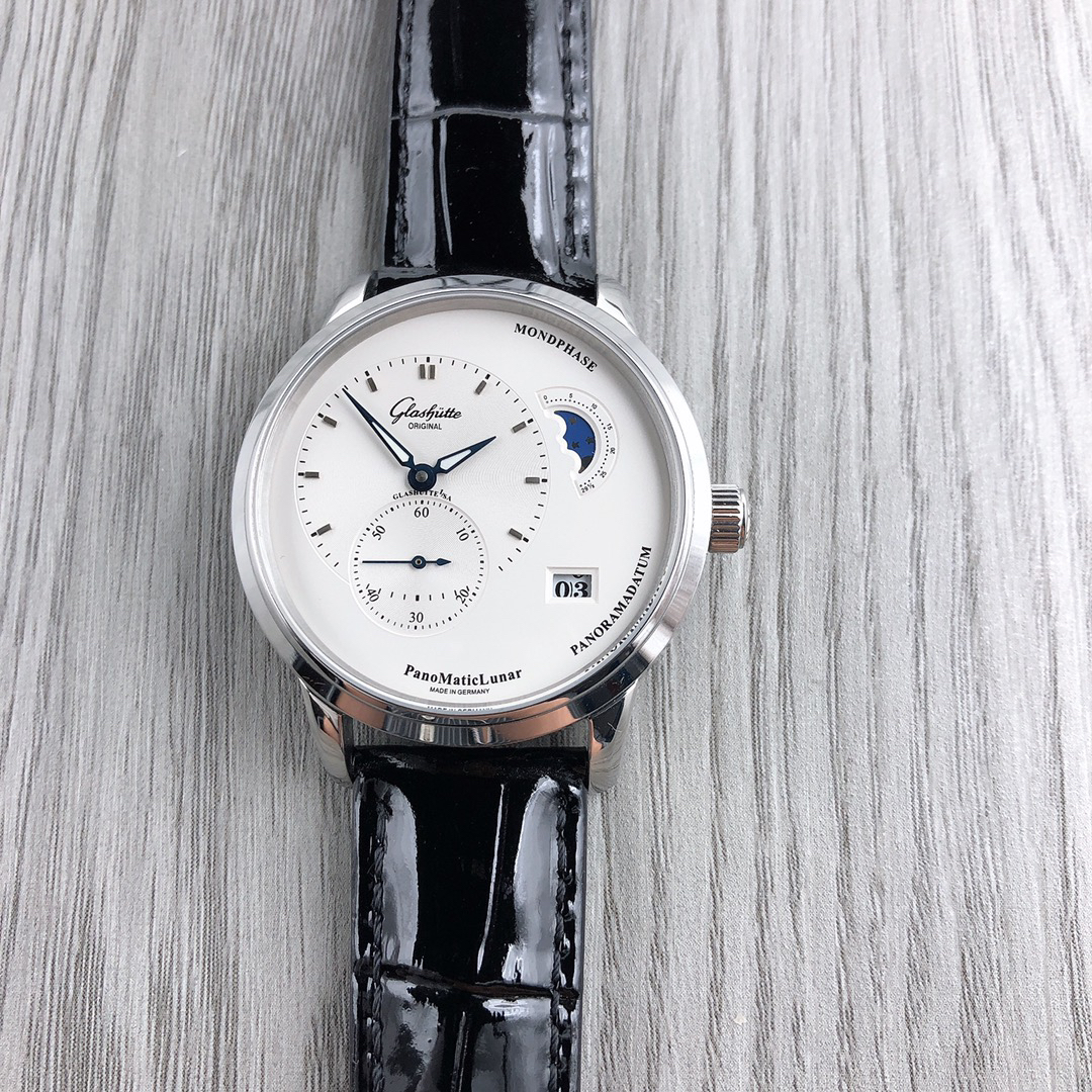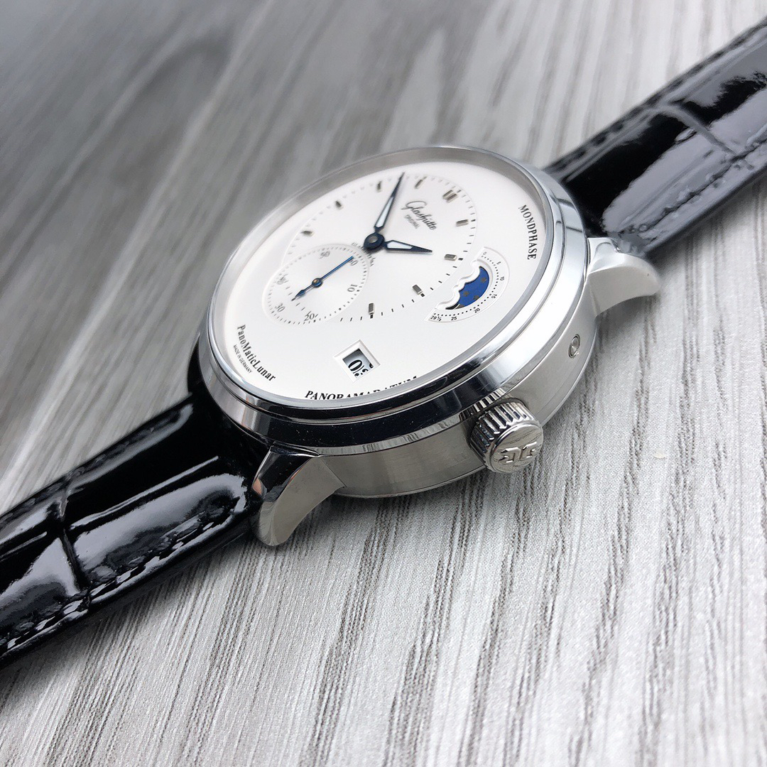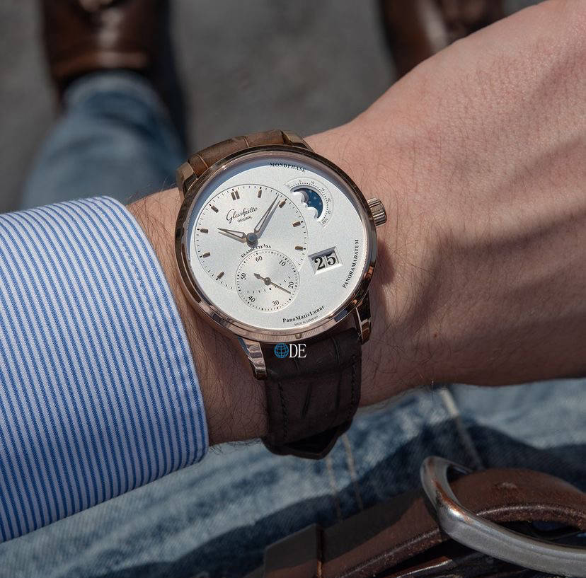 NOOB工厂最有“德味儿”的腕表———格拉苏蒂原创90偏心大日历月相,订制机芯的双跳大日历显示,日期显示的个位和十位并不在同一个日期圈上,有两个独立的显示盘,采用双模组设计