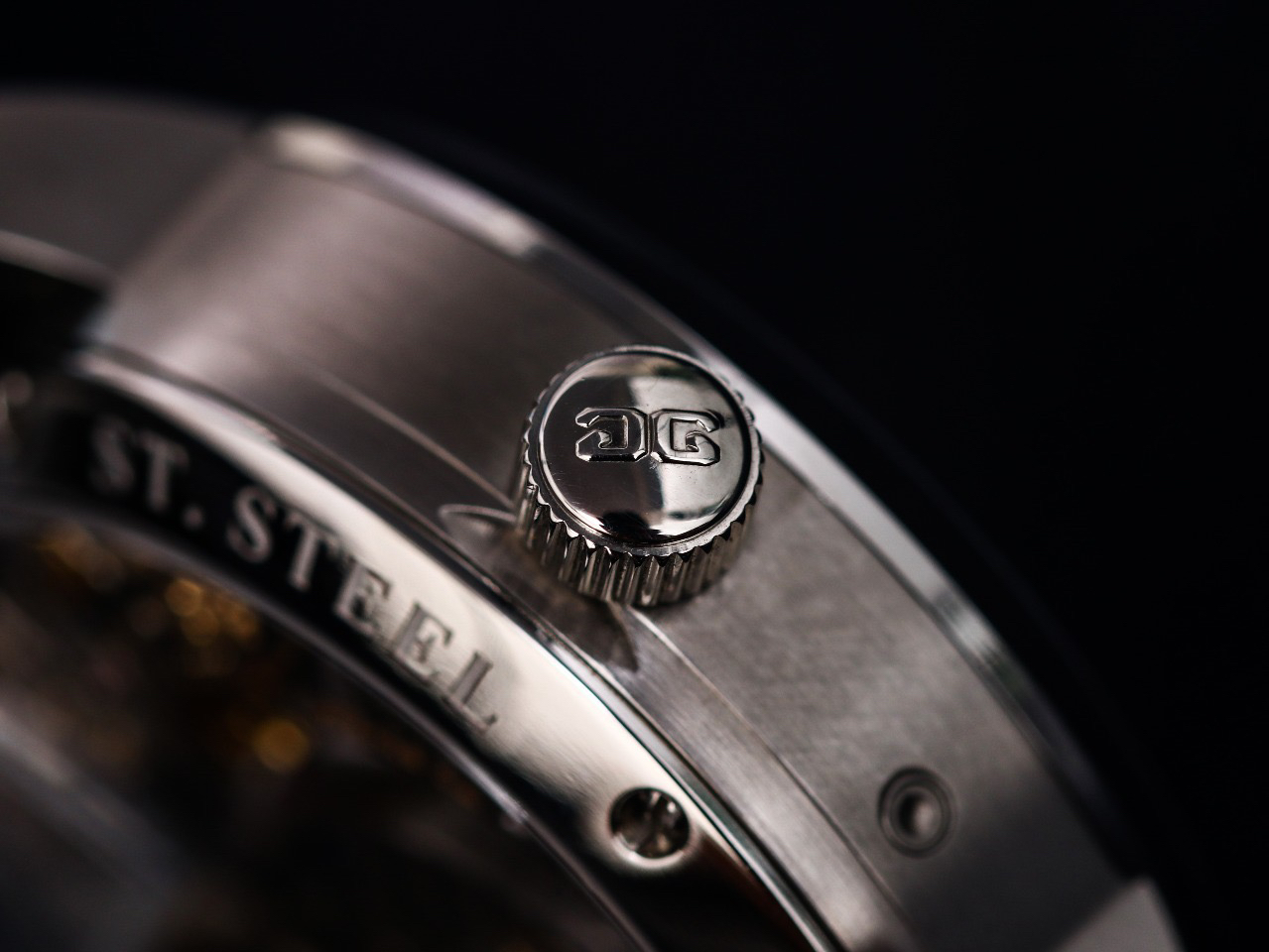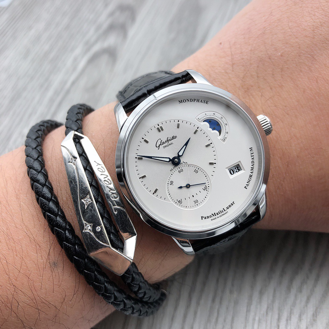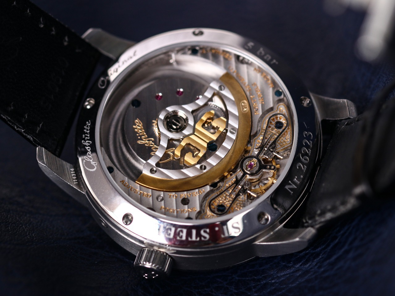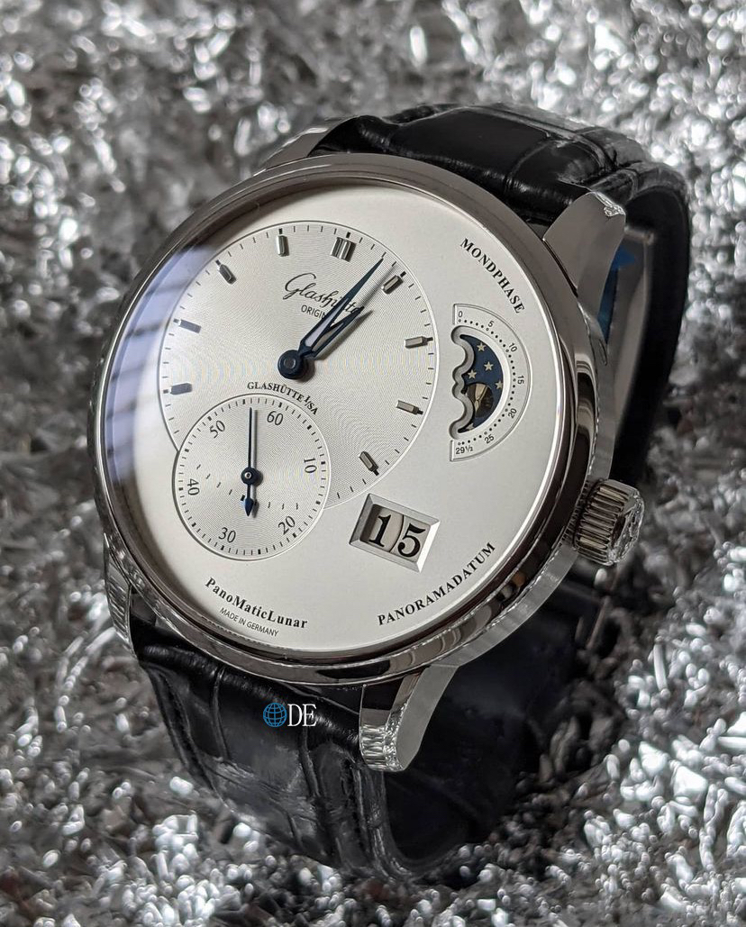 NOOB工厂最有“德味儿”的腕表———格拉苏蒂原创90偏心大日历月相,订制机芯的双跳大日历显示,日期显示的个位和十位并不在同一个日期圈上,有两个独立的显示盘,采用双模组设计