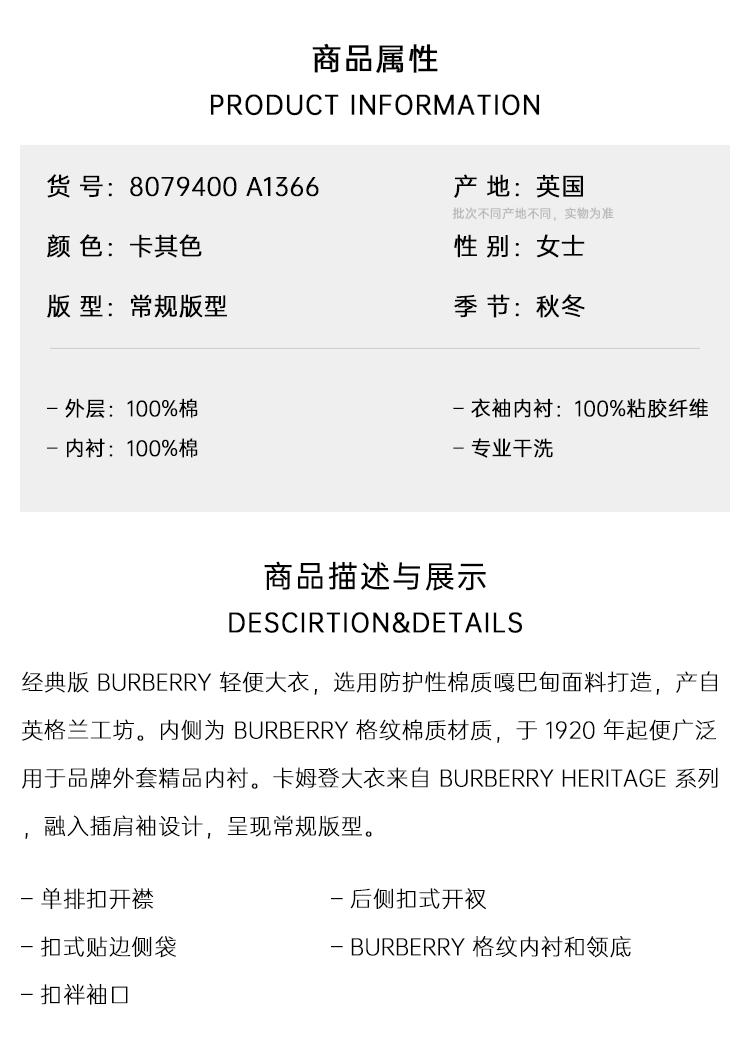 【五】BURBERRY 巴宝莉 女士中长款 Camden Heritage 轻便风衣 卡其色 8079400 A1366