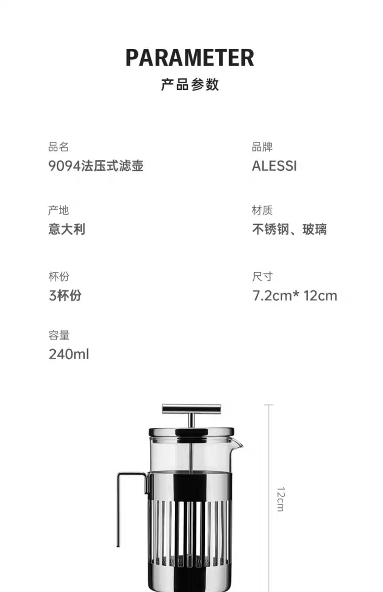 ALESSI/9094法压壶不锈钢咖啡壶手冲玻璃咖啡器具