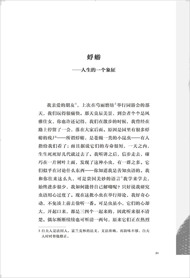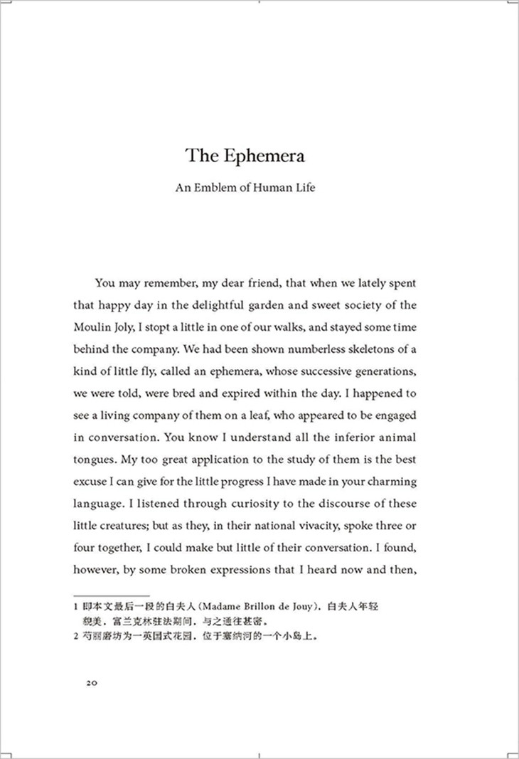 梭罗是个“怪物”。他对于政治的兴趣虽然很广,但我们所选的只是他描写自然界生活的两篇文章。他彻头彻尾地追求浪漫的理想;他在荒野森林里面,可以看出宇宙人生的真理。