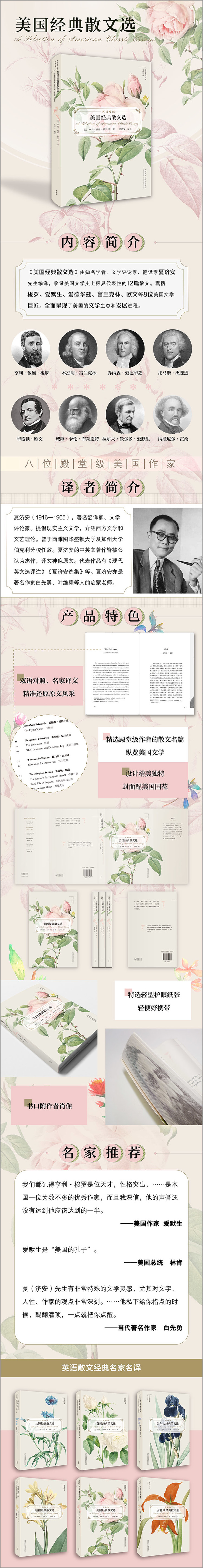 我们所选各文,大致普通选集中都有,在美国都可以说是家喻户晓之作,因此编选工作并不费事。所选之文,除了应有的记事文与论说文之外,我们还特别注意“作家研究”。编者于编译本书时,曾得王镇国先生助力甚多,特此志谢。