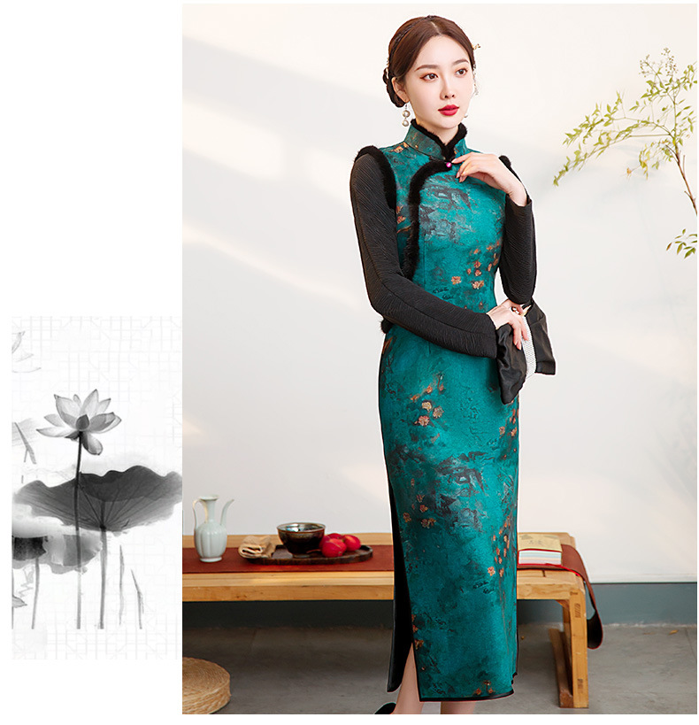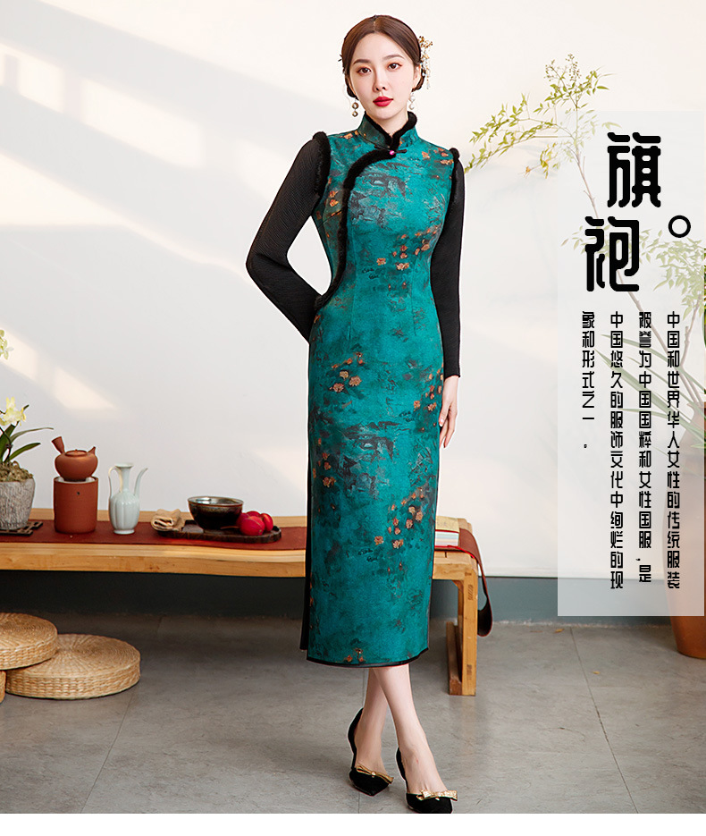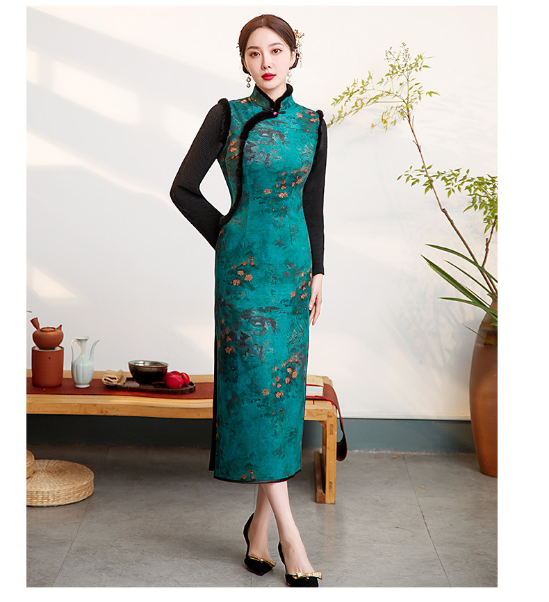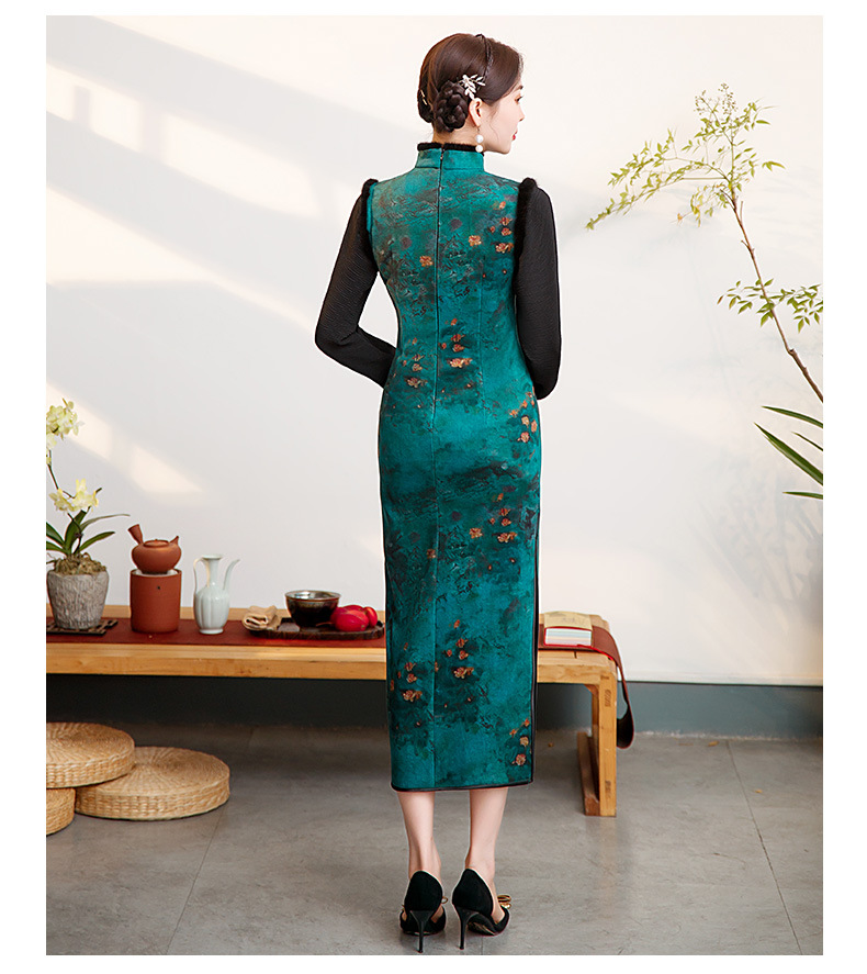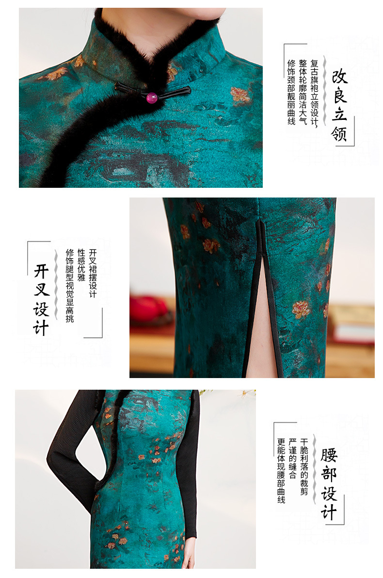 冬季加厚加绒长款旗袍澳绒复合真绒长袖保暖连衣裙GSJ-8501