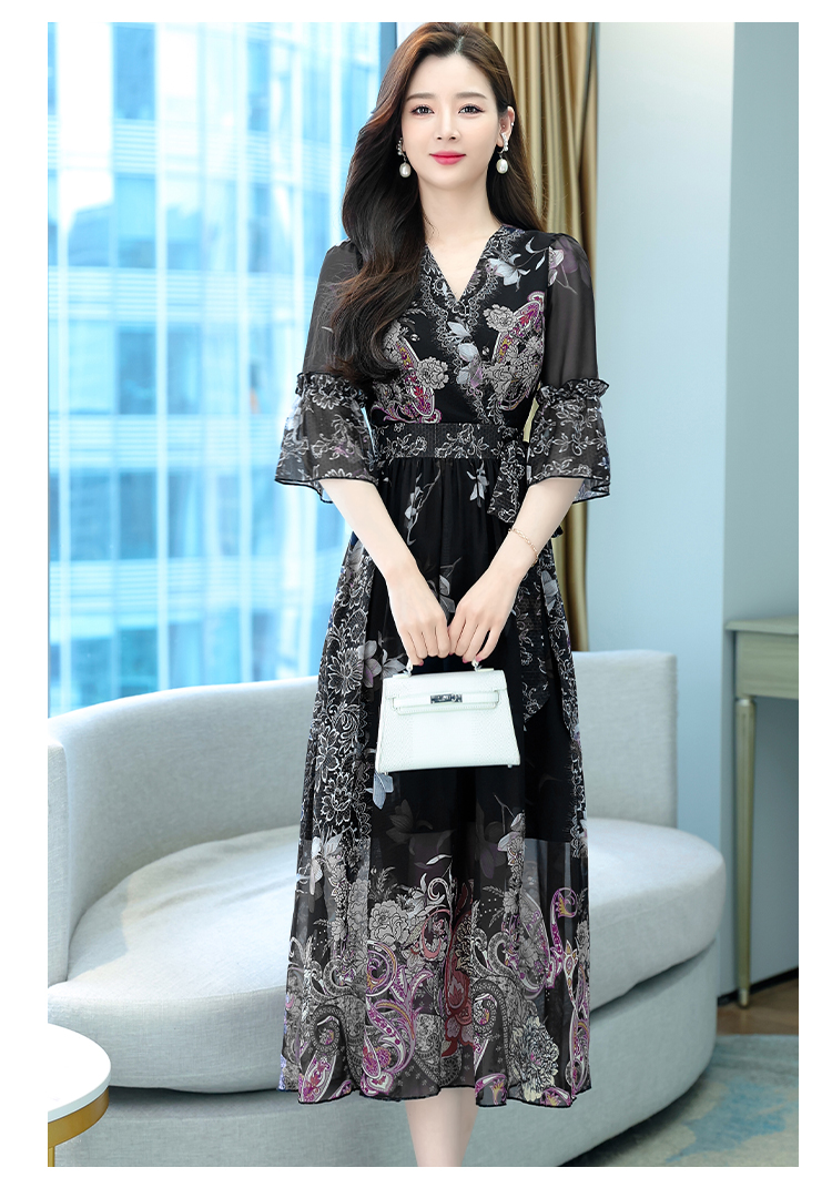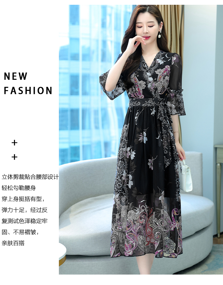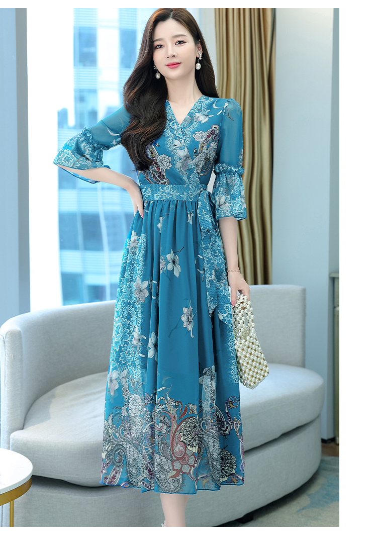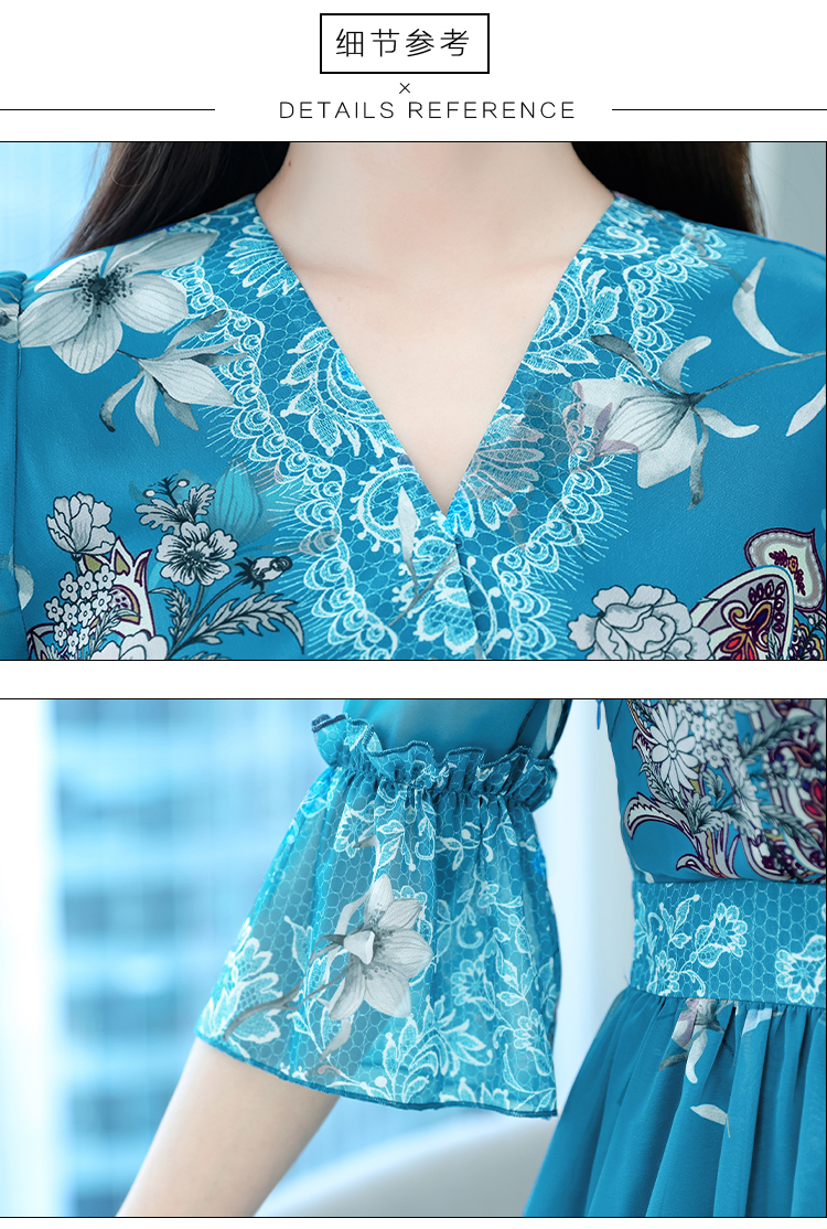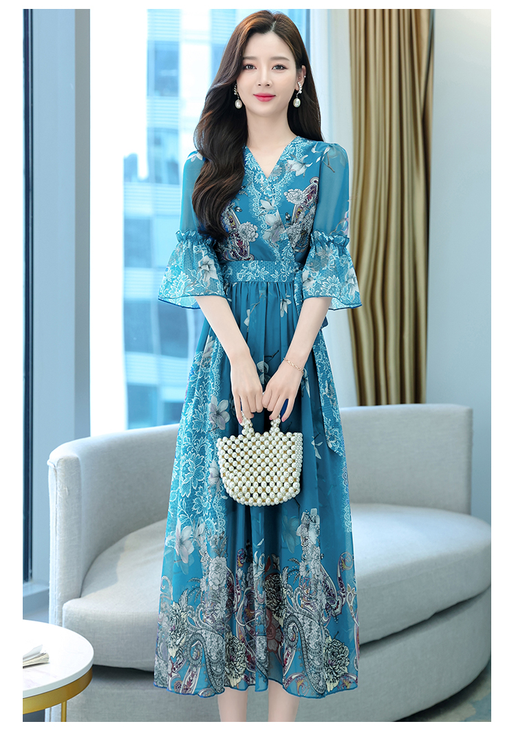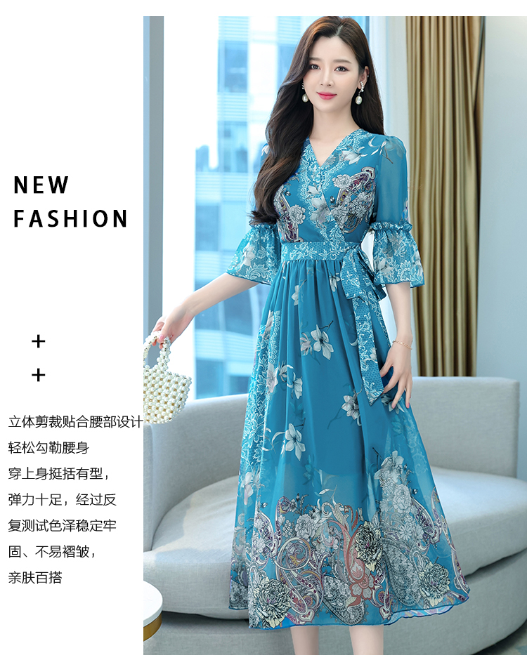 2022夏季新款气质V领荷叶边袖口收腰印花雪纺连衣裙 XYX3567