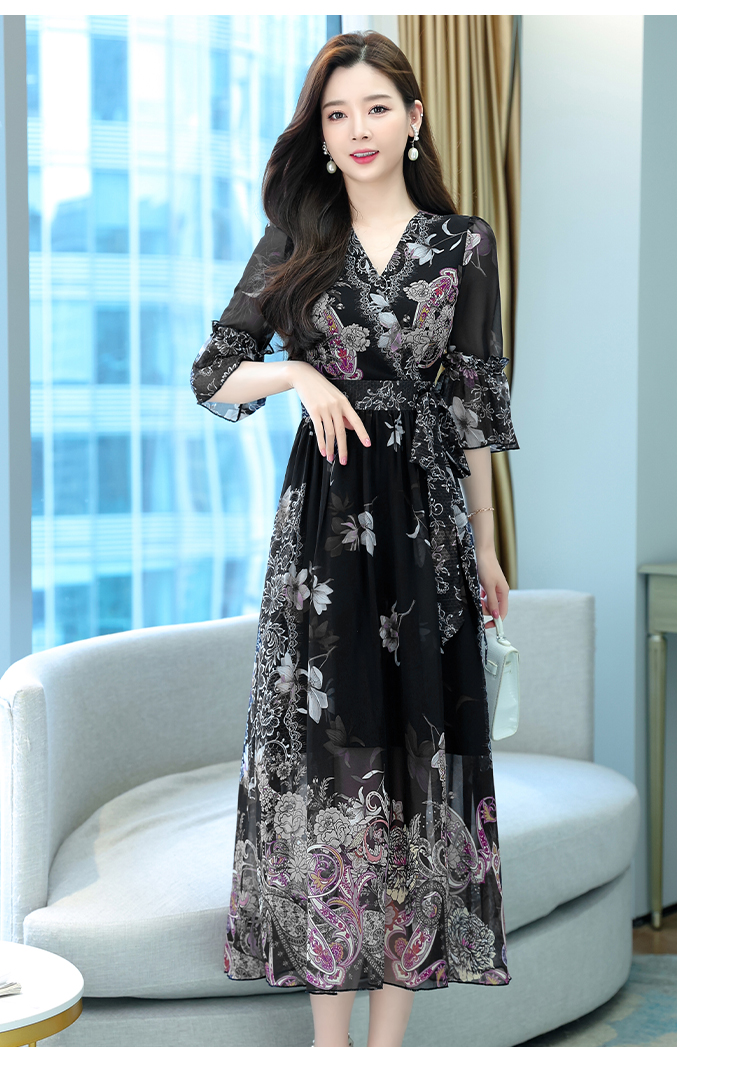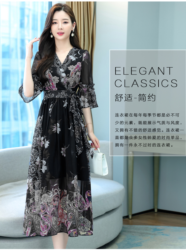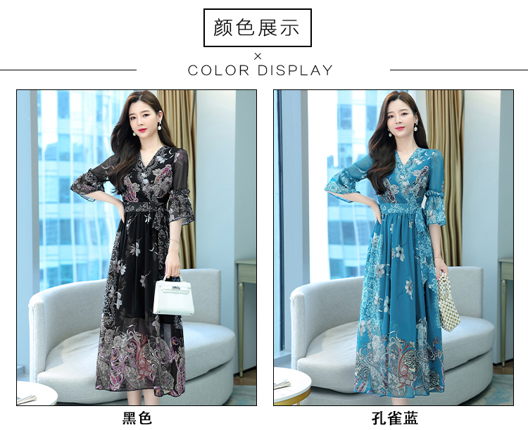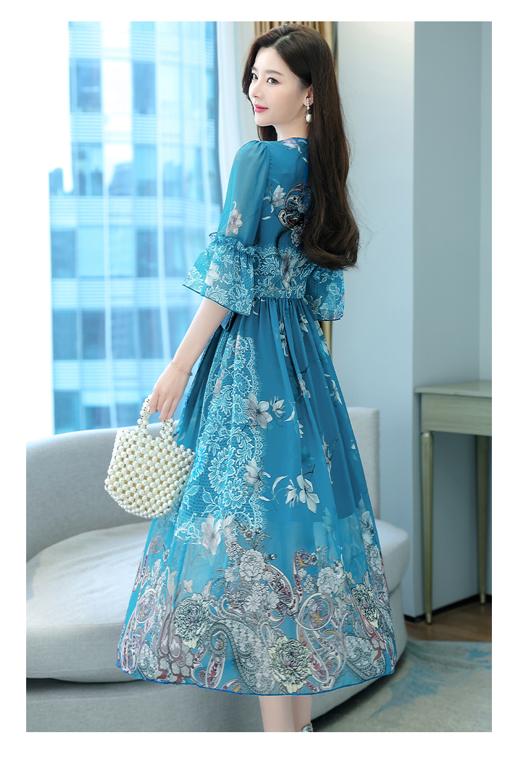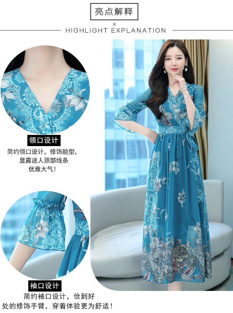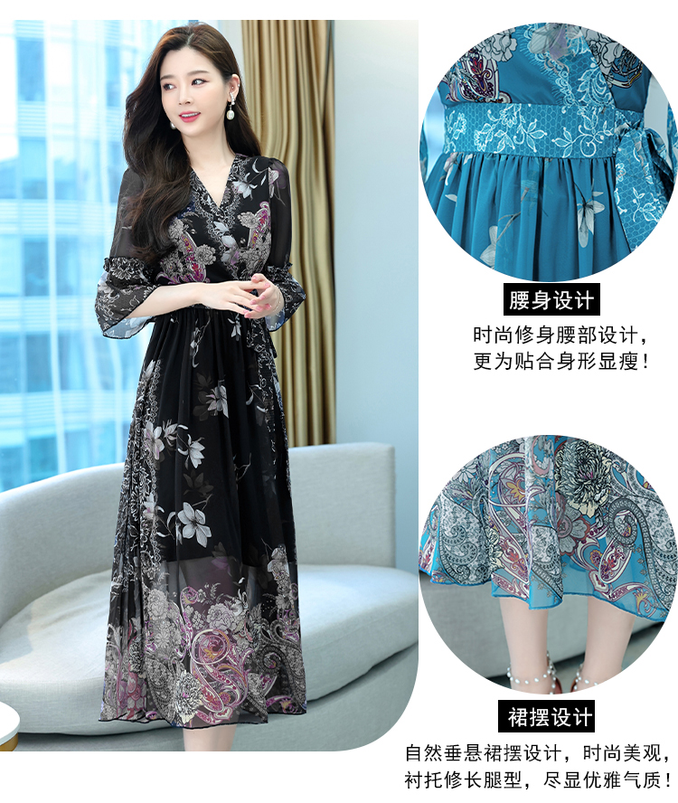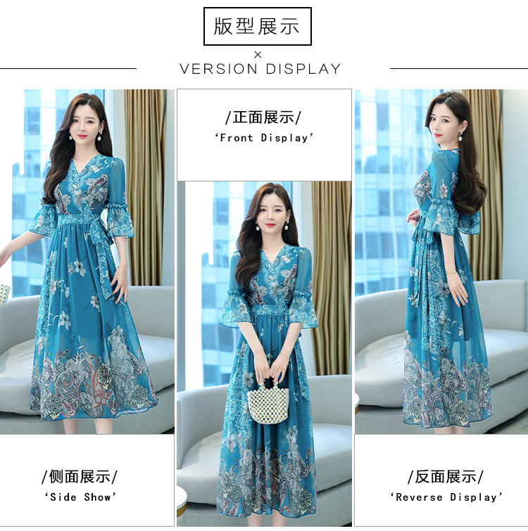 2022夏季新款气质V领荷叶边袖口收腰印花雪纺连衣裙 XYX3567