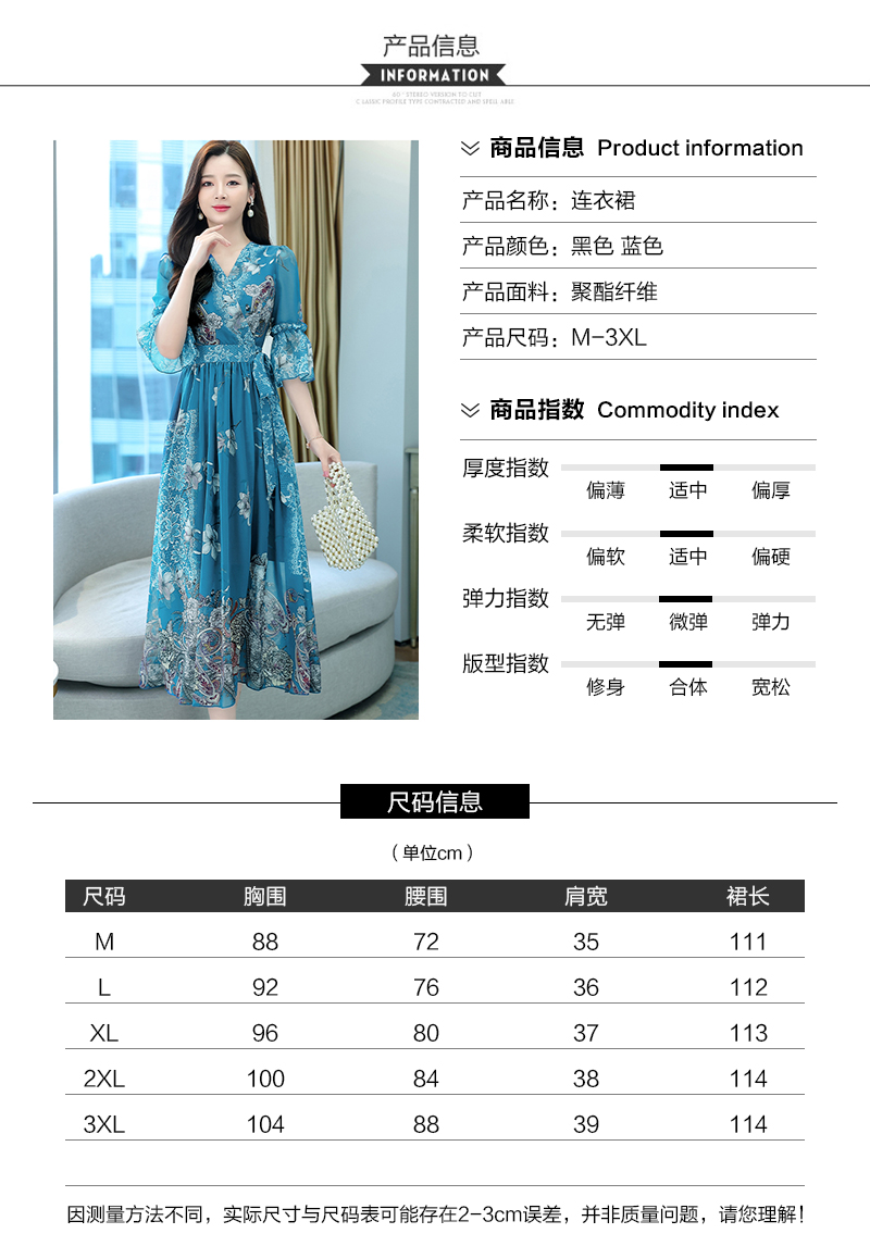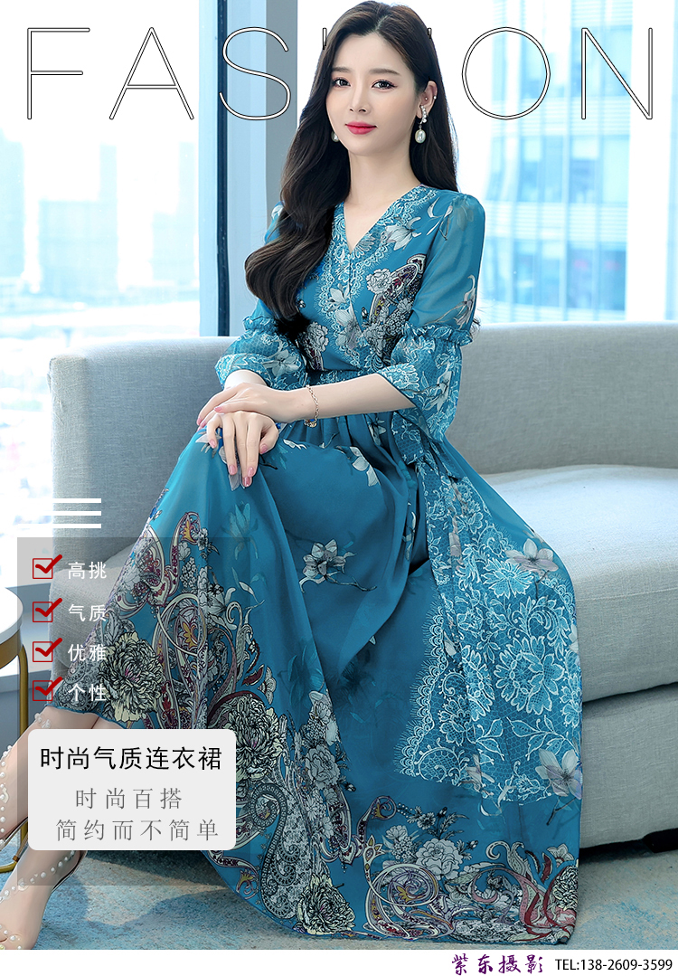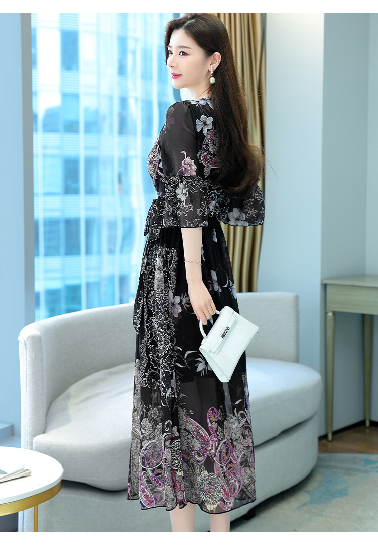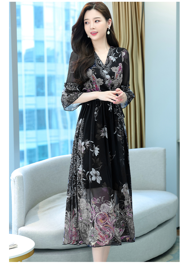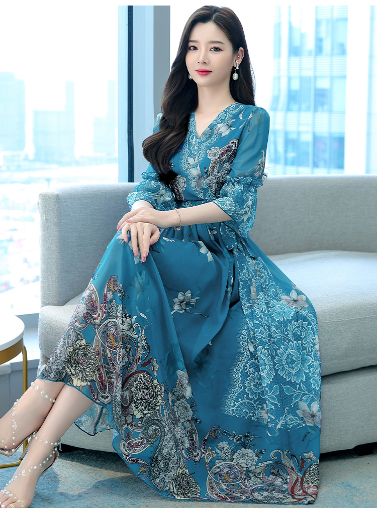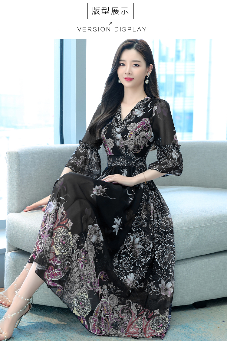 2022夏季新款气质V领荷叶边袖口收腰印花雪纺连衣裙 XYX3567