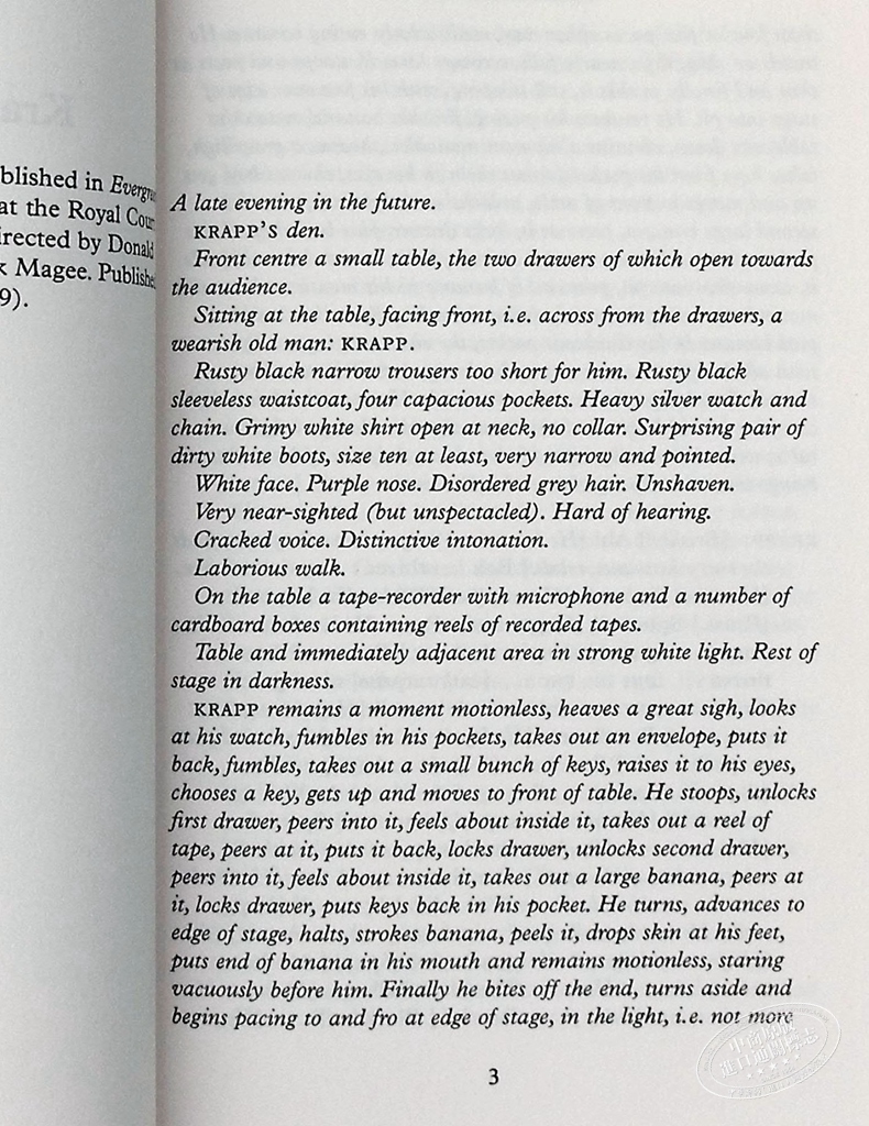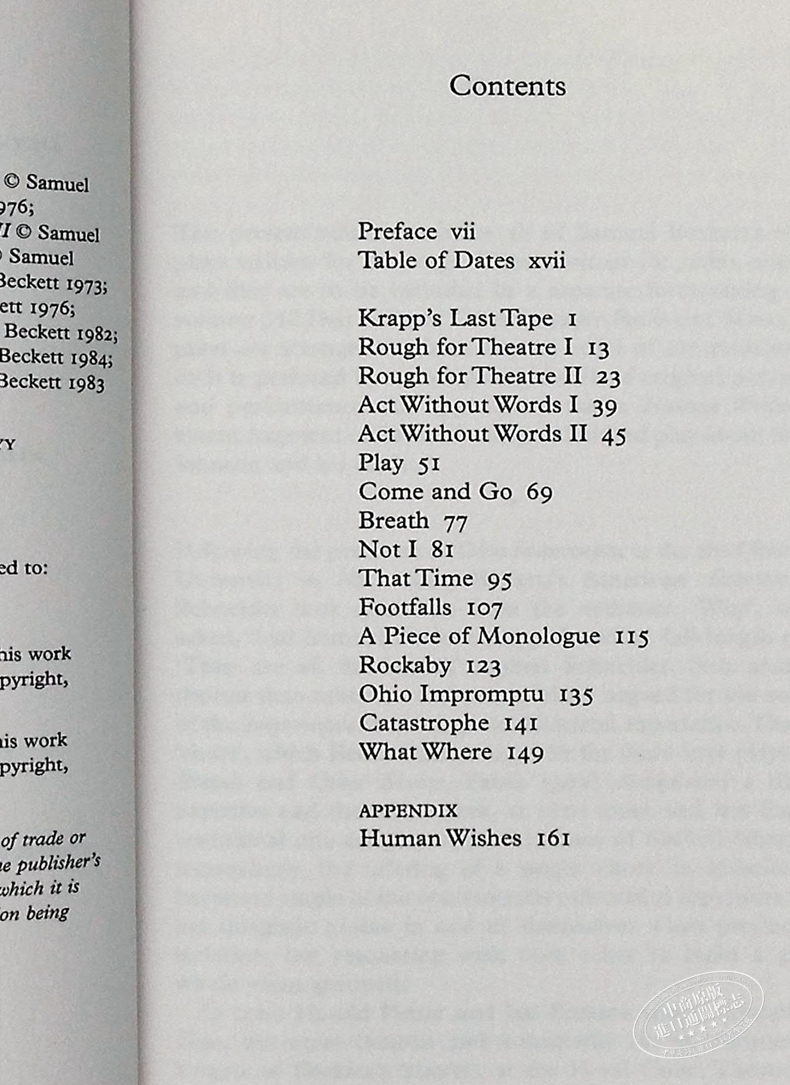 本卷汇集了《克拉普的最后一卷录音带》和贝克特为舞台创作的其他短篇作品或 "戏剧"。它将由即将出版的Faber版本的为广播和银幕创作的戏剧作品补充。