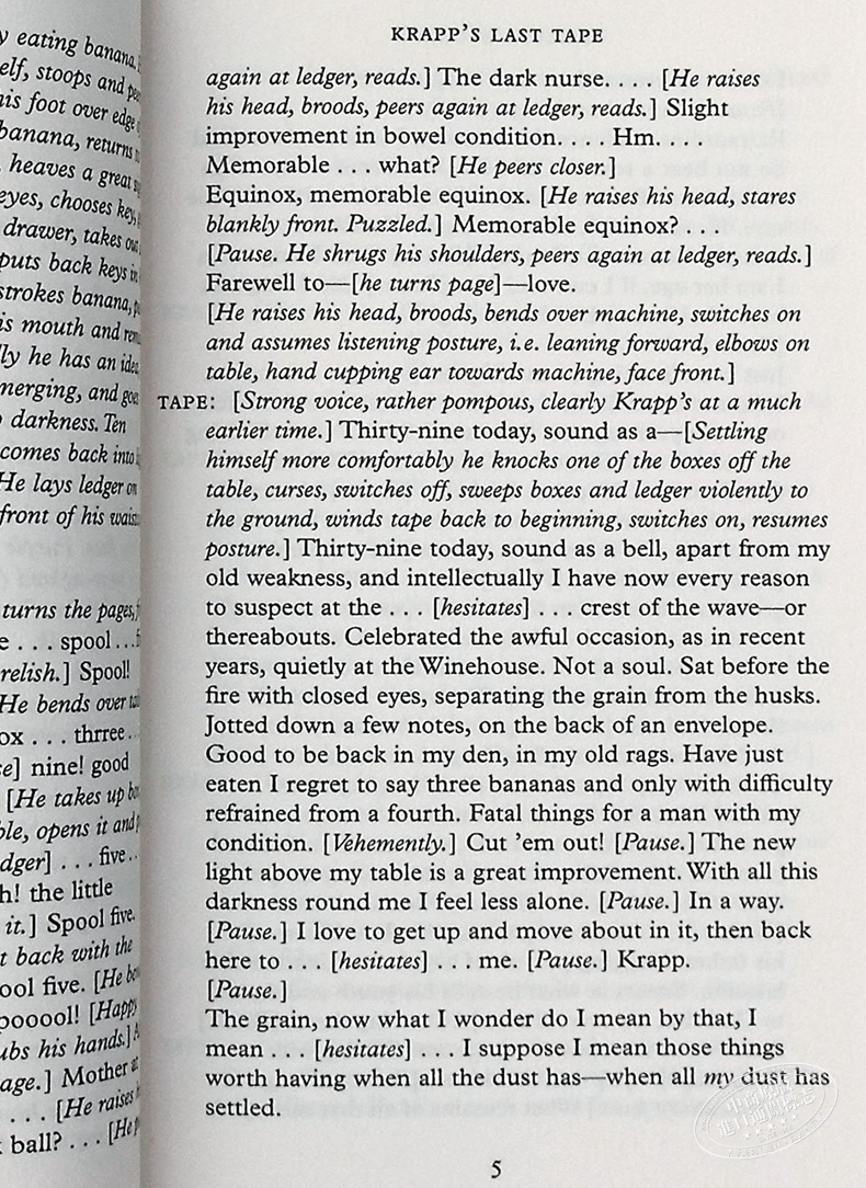 克拉普:"我在这里结束这个卷轴。盒子--[停顿]--三,卷轴--[停顿]--五。[停顿]也许我最好的年华已经过去。当有机会获得幸福的时候 但我不希望它们回来。现在我心里有了火。是的,我不希望他们回来。在他面前一动不动地盯着。