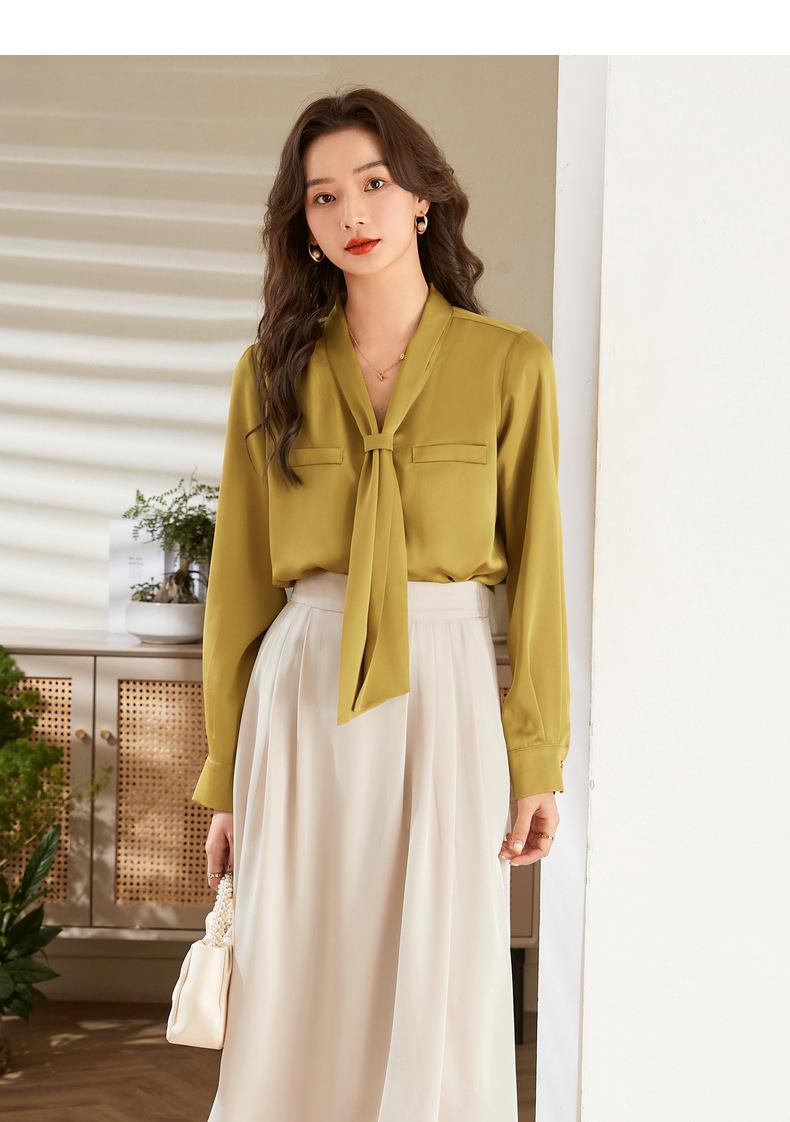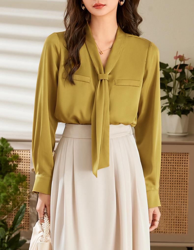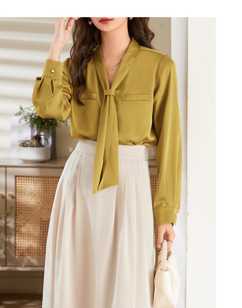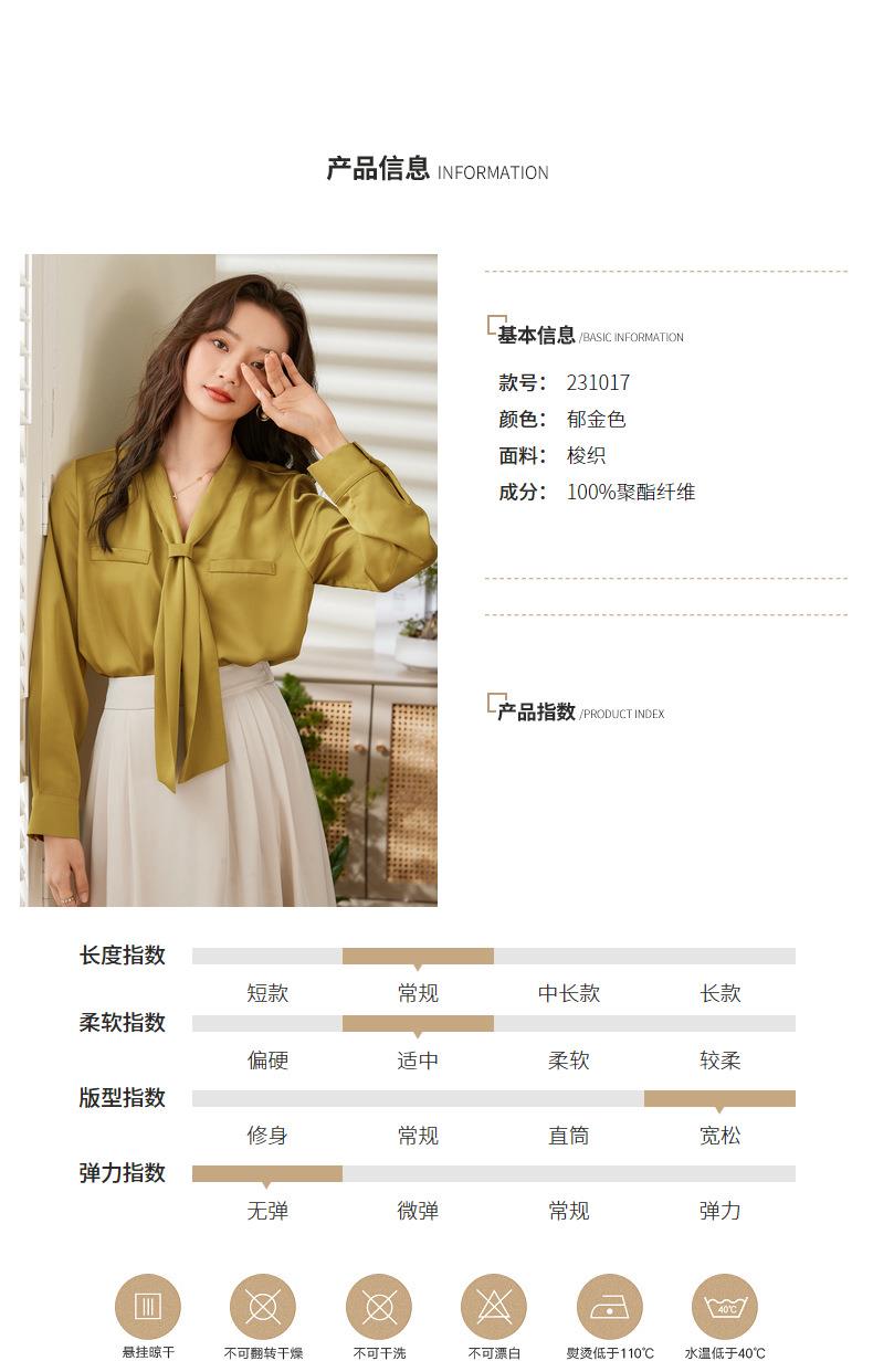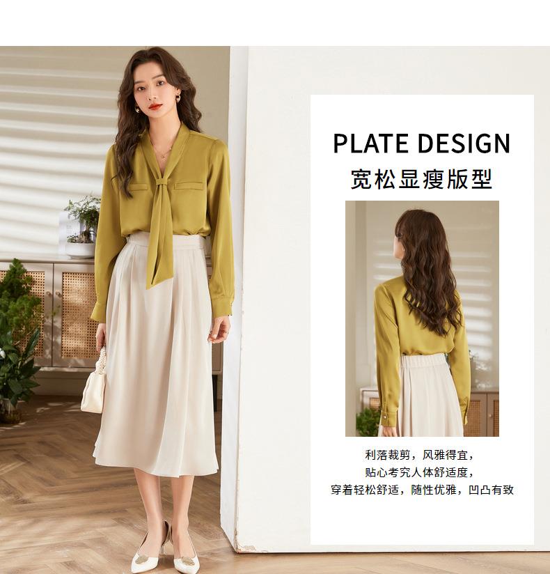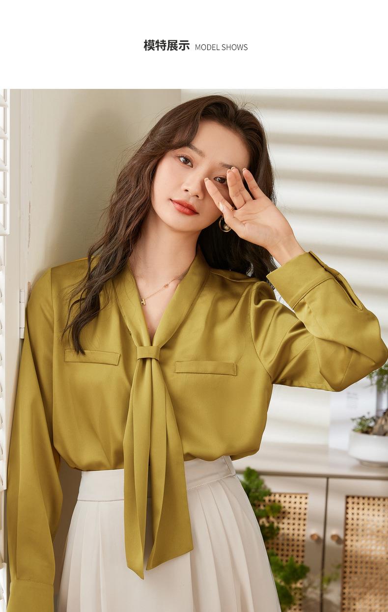 百姿 领带长袖衬衫女2023春季新款韩版都市时尚假口袋雪纺衬衣