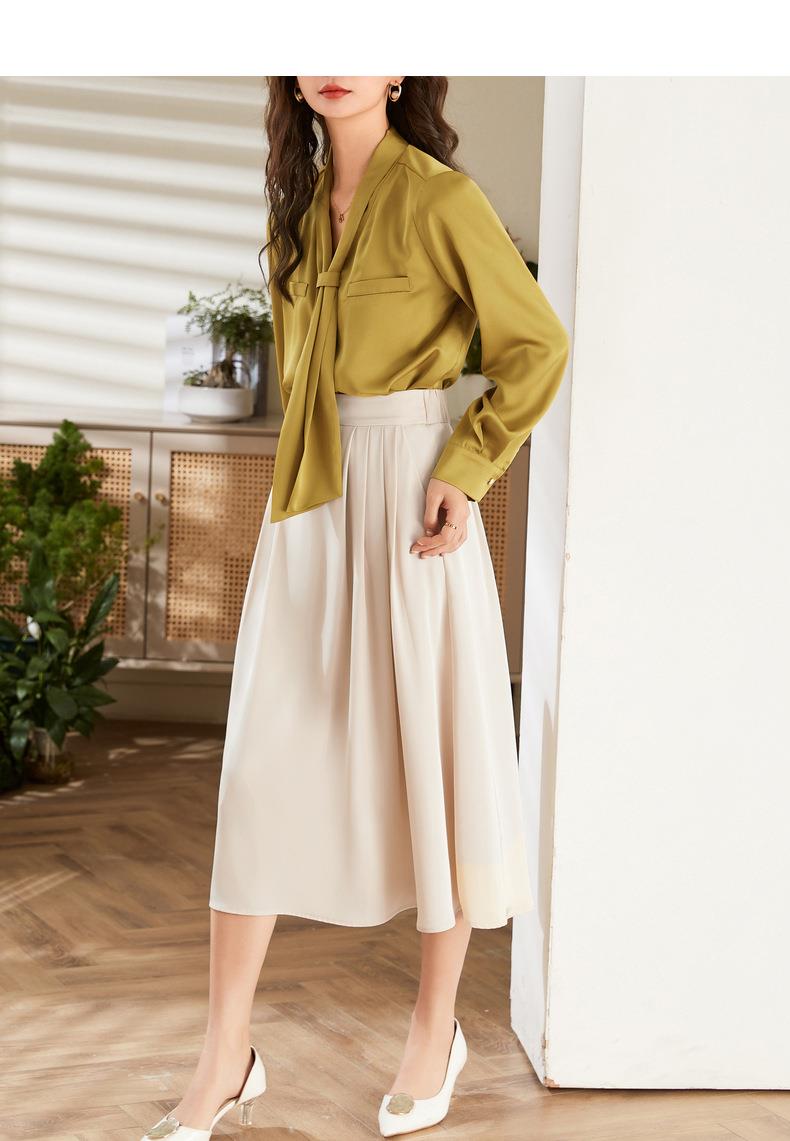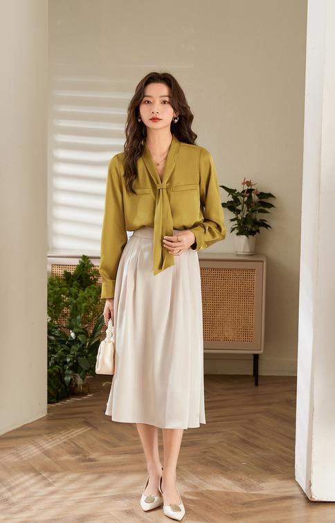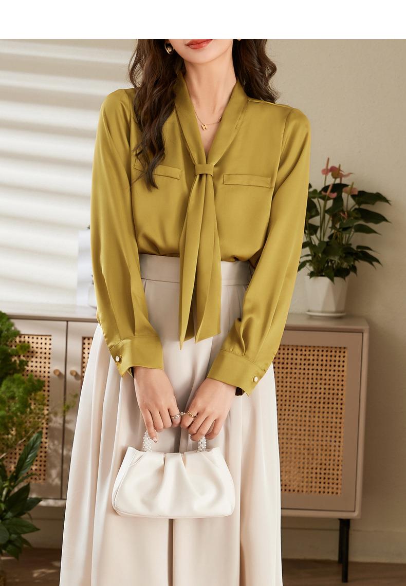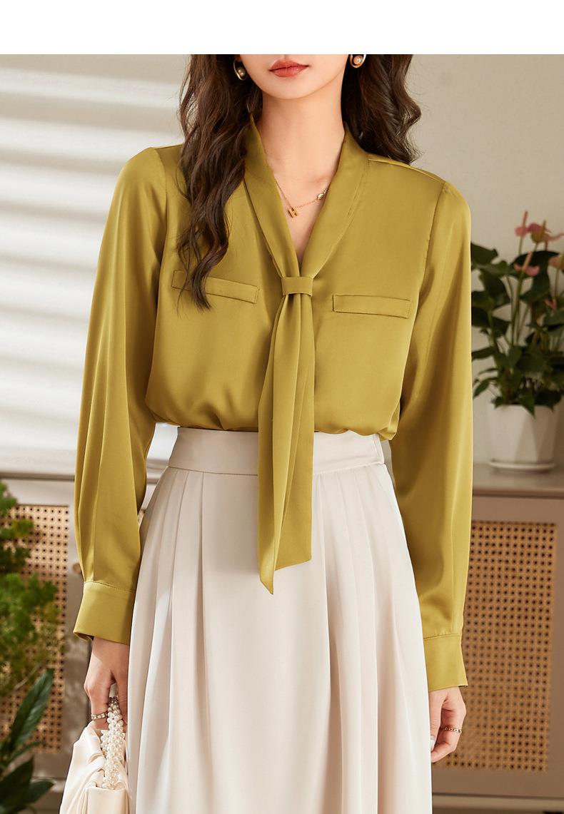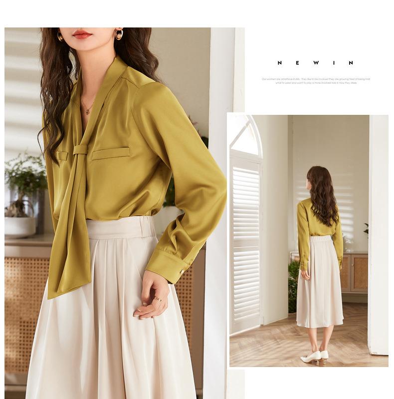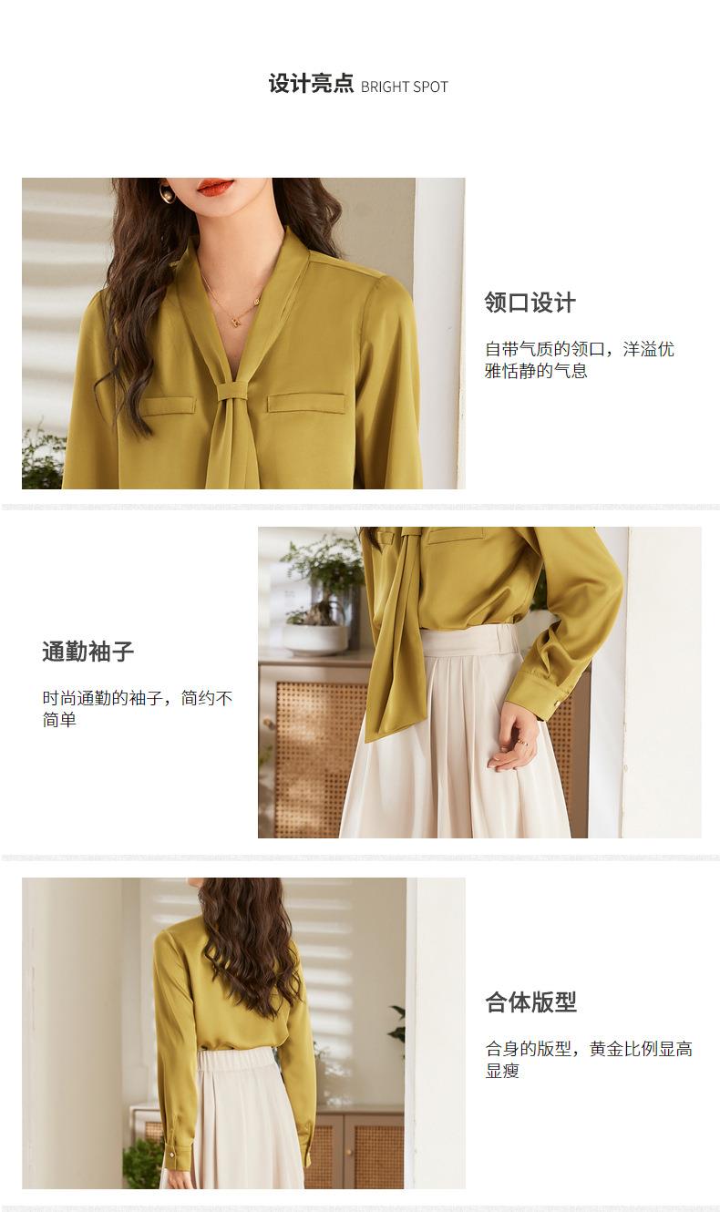 百姿 领带长袖衬衫女2023春季新款韩版都市时尚假口袋雪纺衬衣