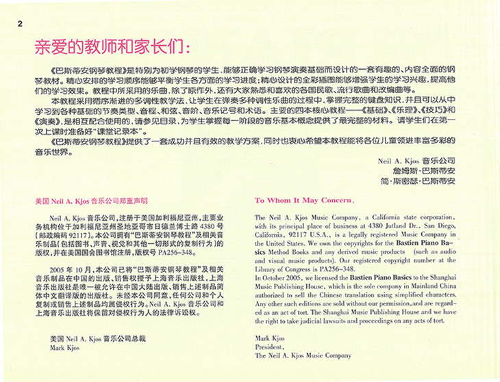 《巴斯蒂安钢琴教程》是根据儿童生理、心理特征编写的一套最易学习、最具趣味性,并附有引导性详解的钢琴基础教程。它倡导快乐学习的理念,能够让学生快速、轻松地掌握弹奏、伴奏、轻松地掌握弹奏、伴奏、弹唱的技巧,增加学习自信心,引发学习动机,满足成就感。因此,已被译成多国文字版本,成为世界各国儿童普遍欢迎的钢琴教材。