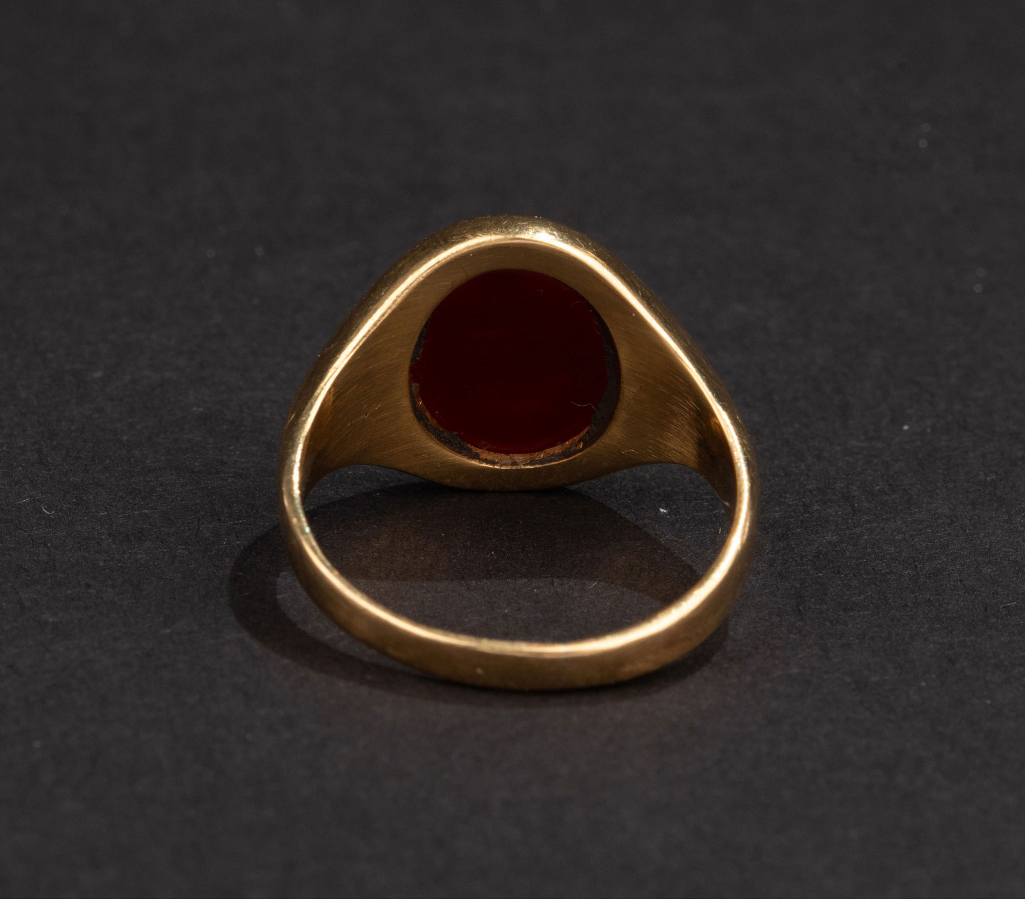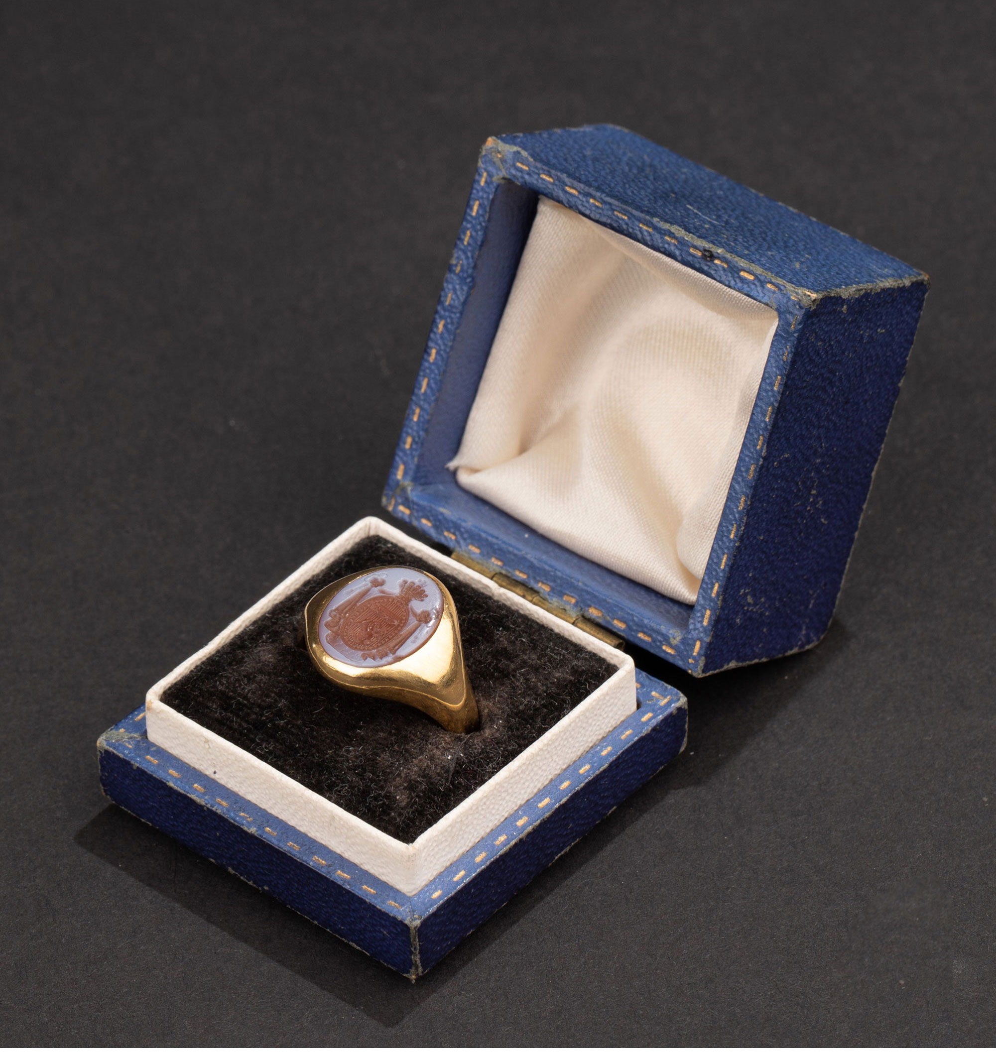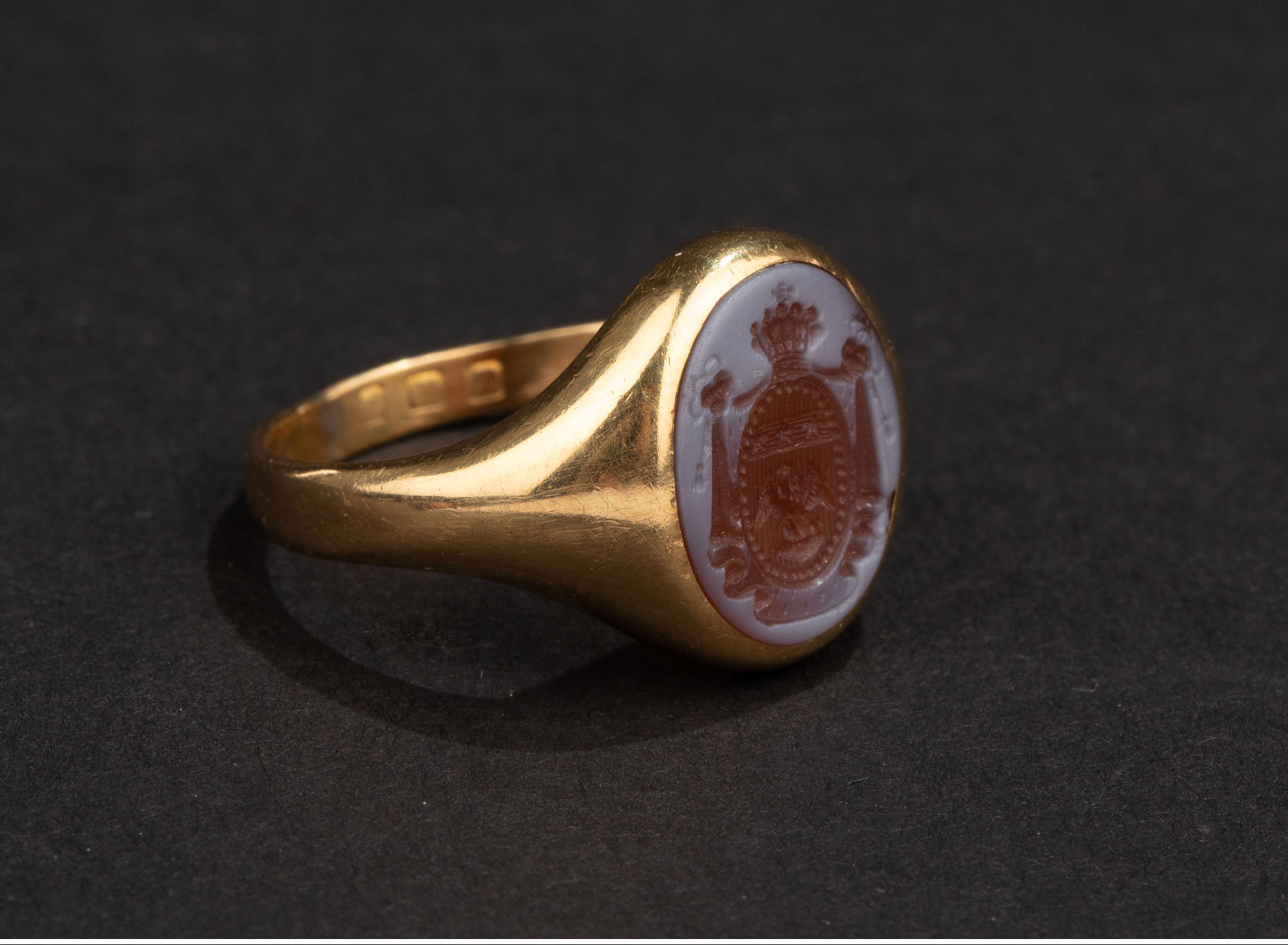 1870-1880年英国出品18K黄金镶嵌玛瑙侯爵贵族纹章主题凹雕印章戒指