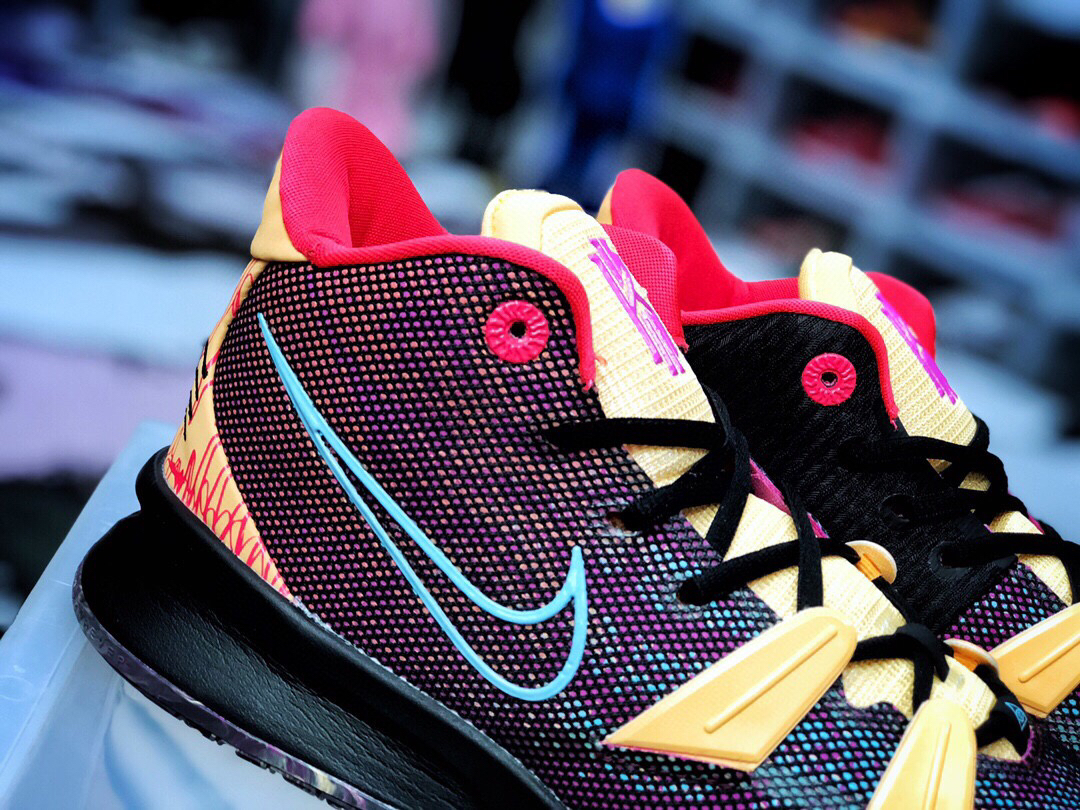 夏日特惠💰430 GC原鞋 Nike Kyrie 7 PH EP Soundwave 音乐主题 棕色 此配色最大的特点是将 Travis Scott标志性的褐色注入设计。黑色鞋面映衬岀蓝、红色调,象征播放器液晶屏所展现的声波频率,后跟直击主题 前掌内嵌 Zoom turbo气垫,提供灵敏的启动相应。外底采用XDR加持,进一步完善外场实战的耐久性。