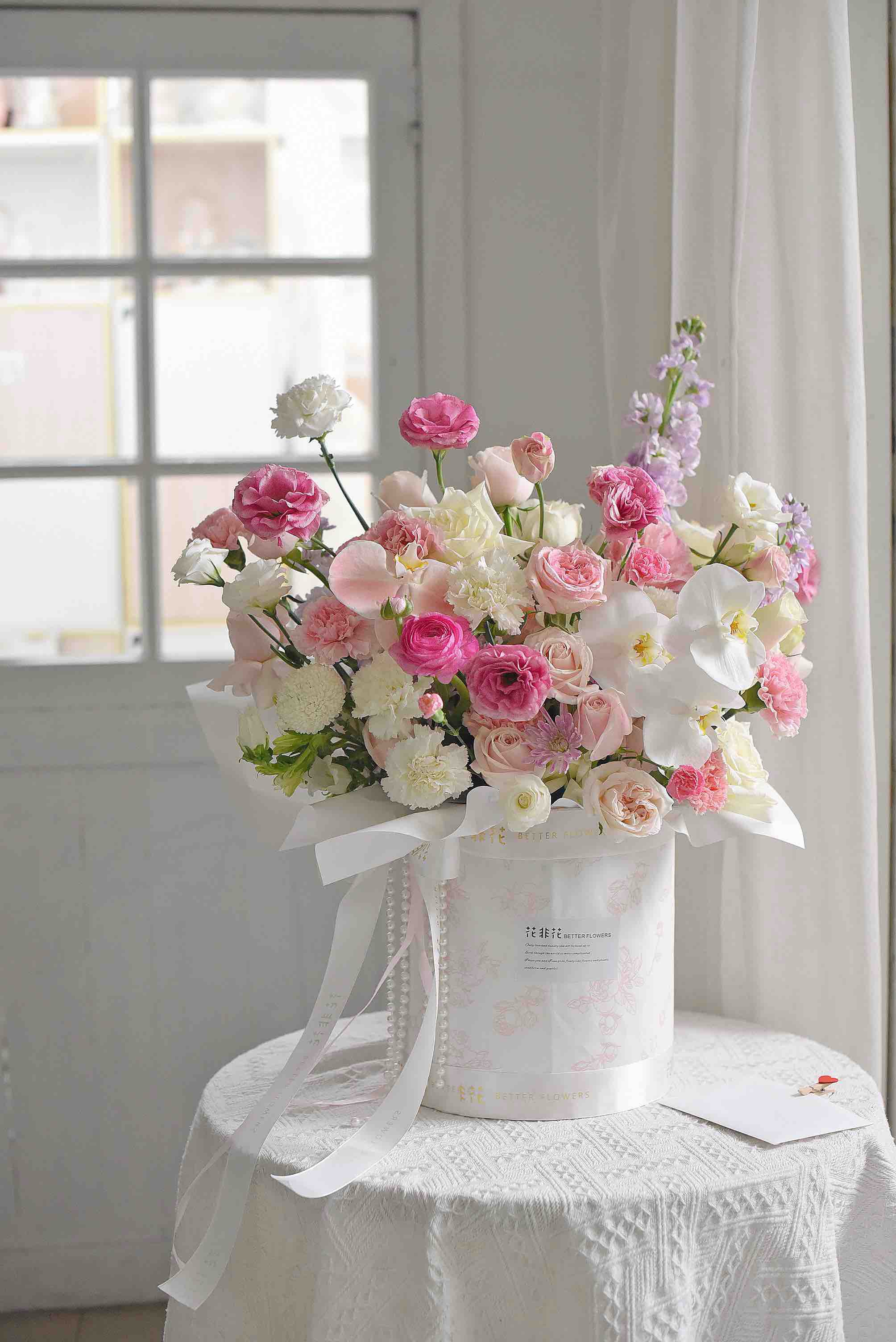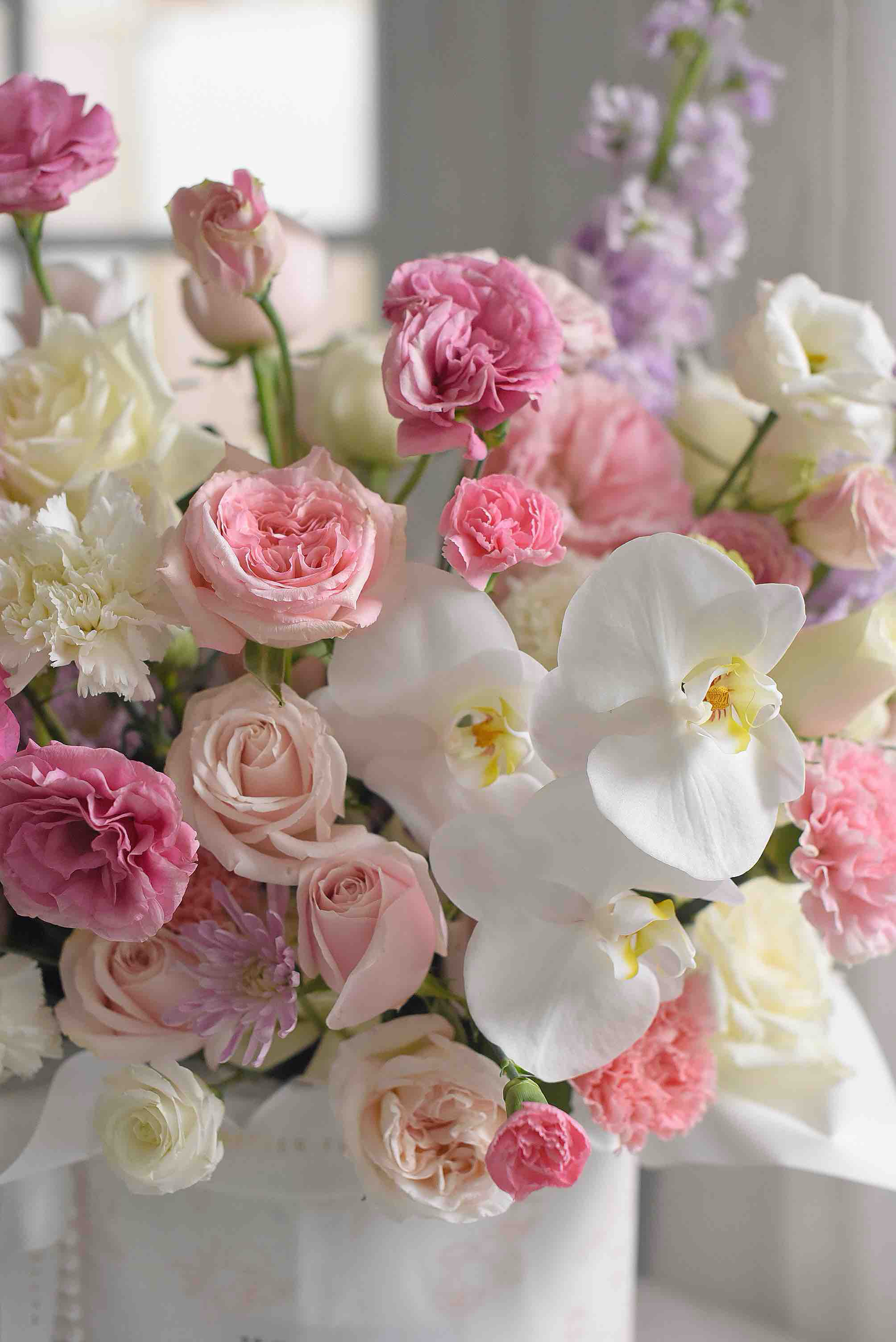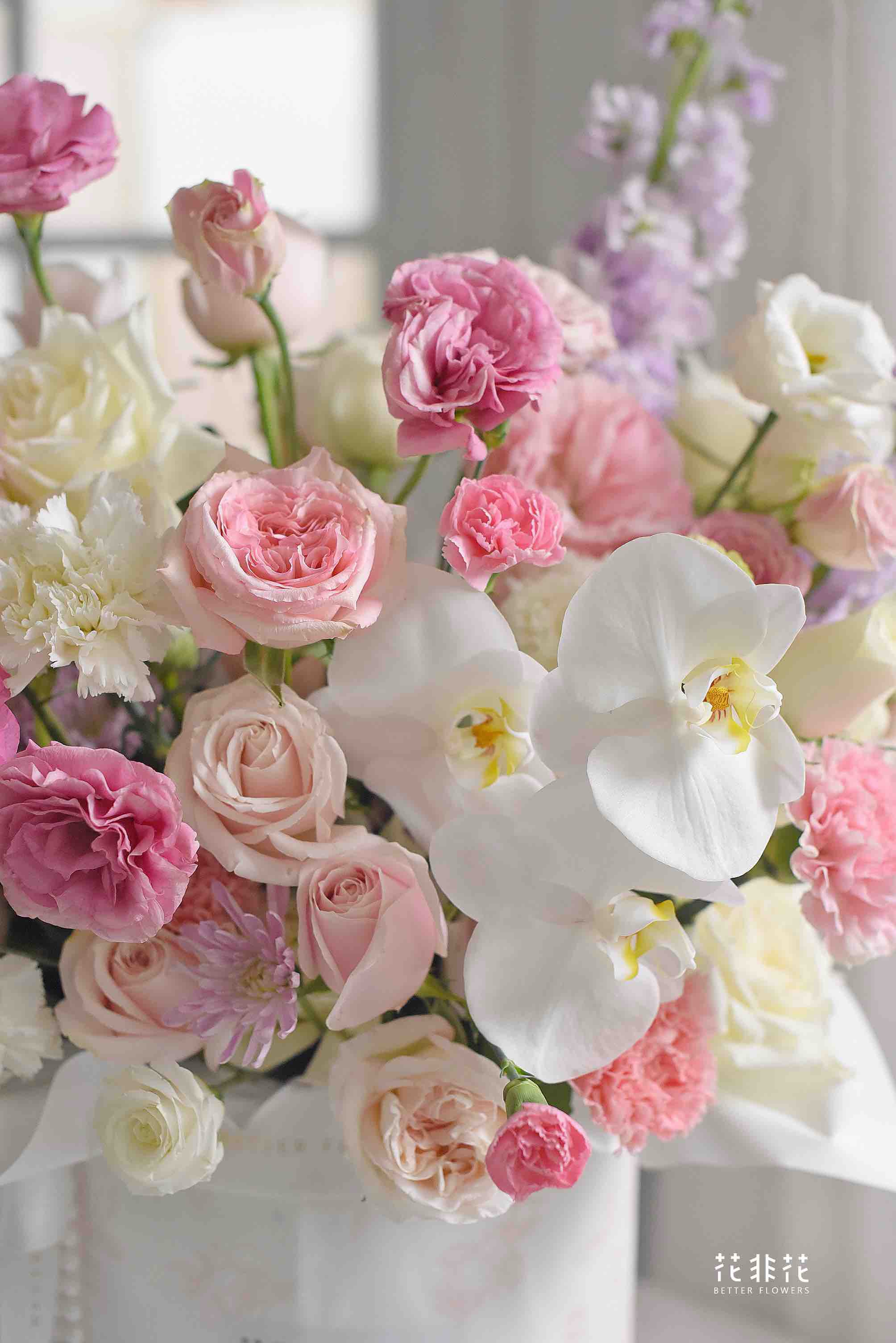 《春之梦境》蝴蝶兰粉雪山玫瑰粉白色系大号抱抱桶