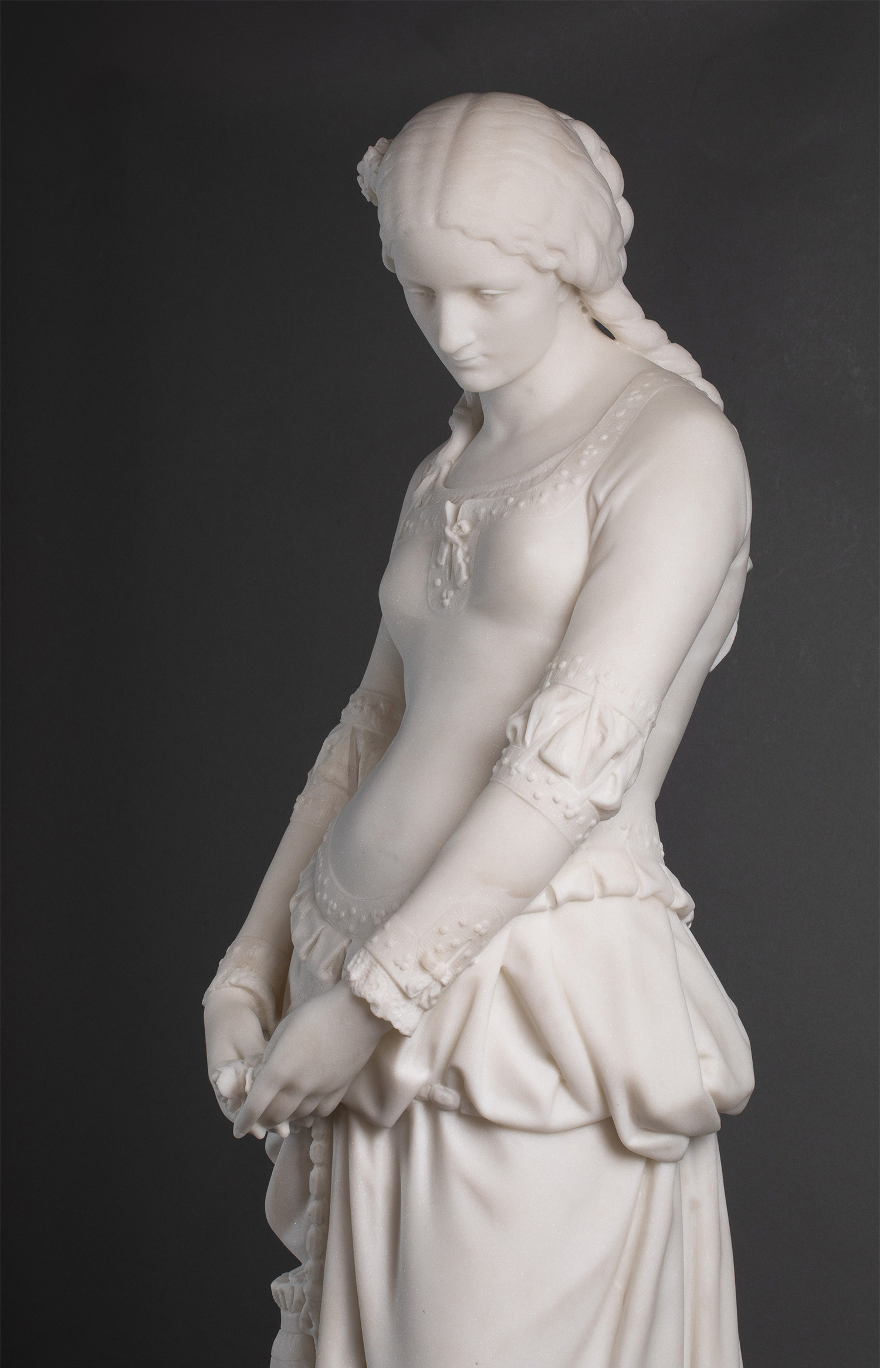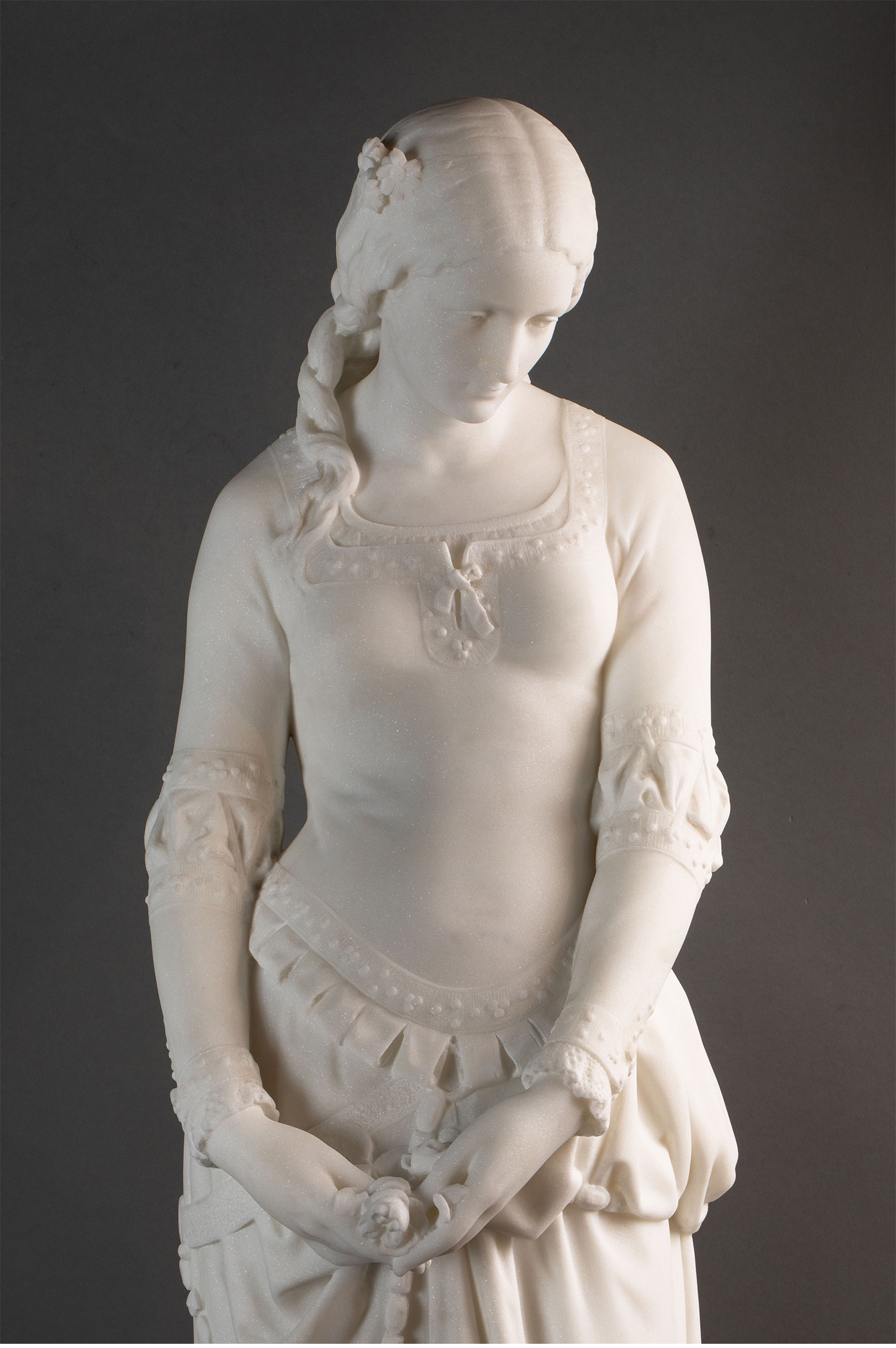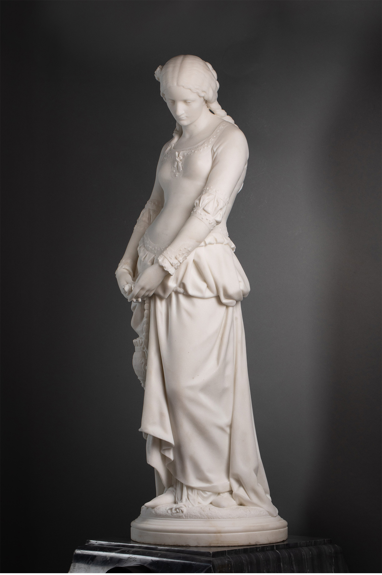 1870年代法国雕塑家Emile BOISSEAU签名创作大理石底座嵌梅菲斯特头像青铜精雕装饰人物主题卡拉拉大理石雕塑作品《玛格丽特》