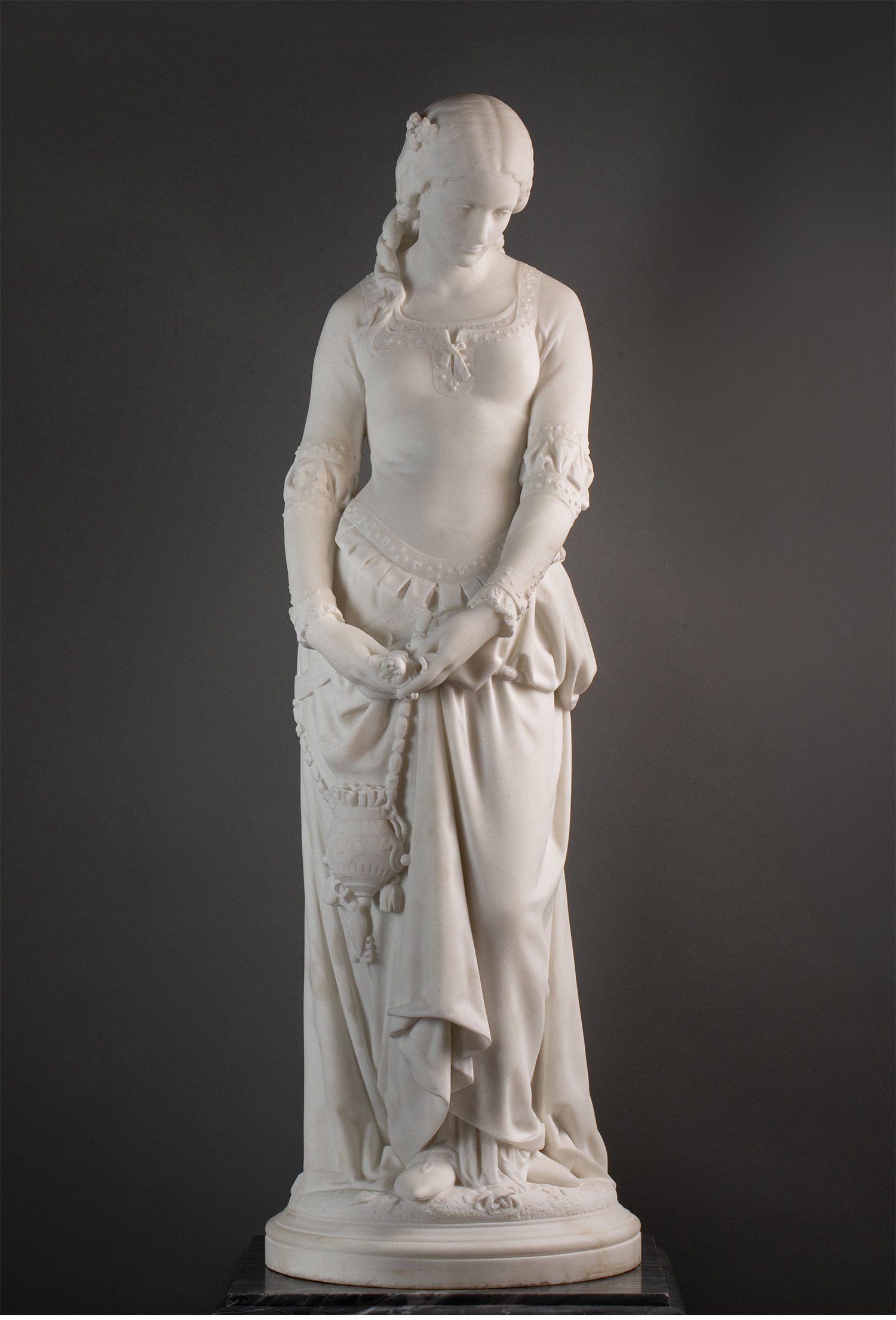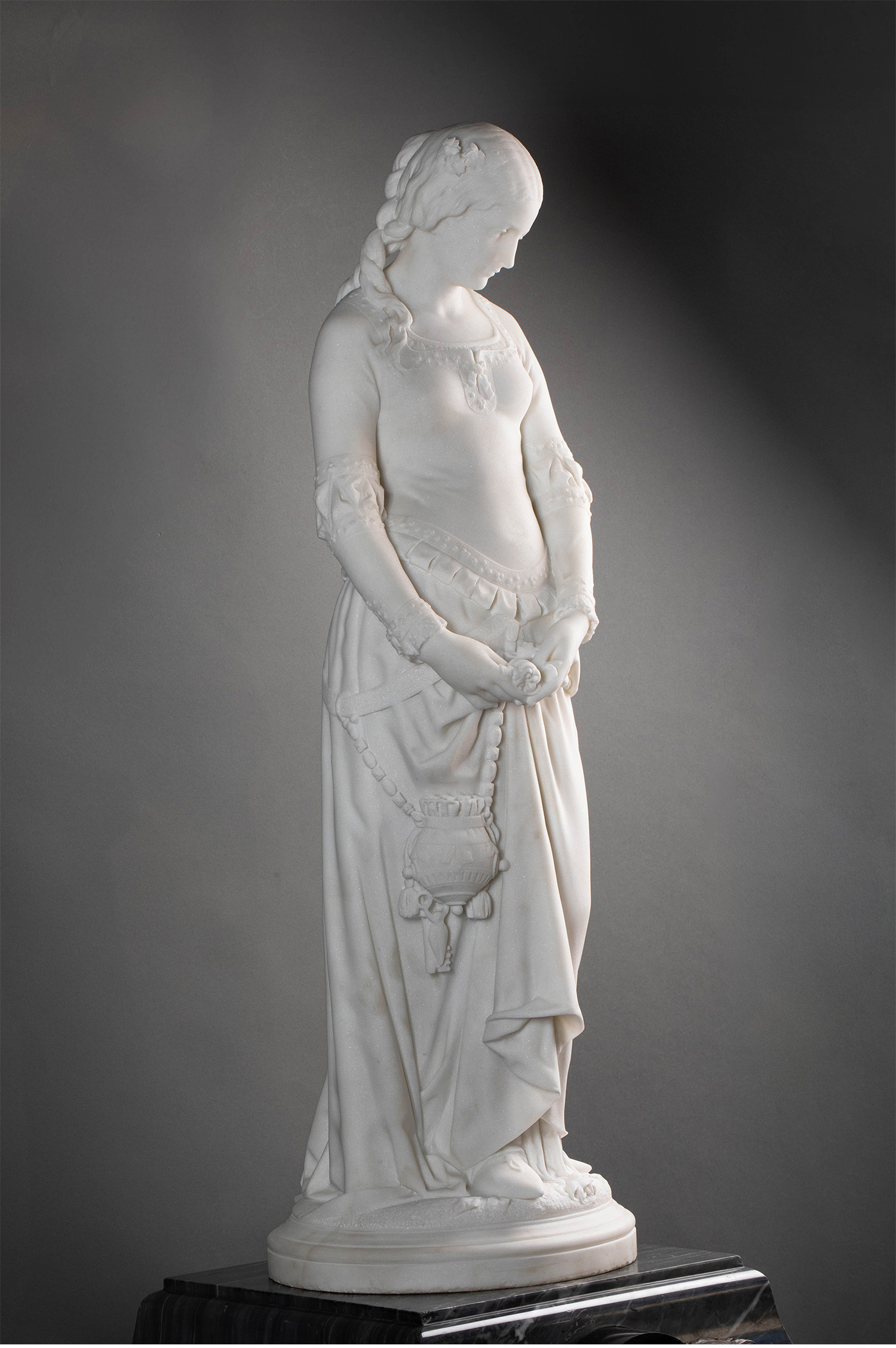 独角鹿西洋古董1870年代法国雕塑家Emile BOISSEAU签名创作大理石底座嵌梅菲斯特头像青铜精雕装饰人物主题卡拉拉大理石雕塑作品《玛格丽特》