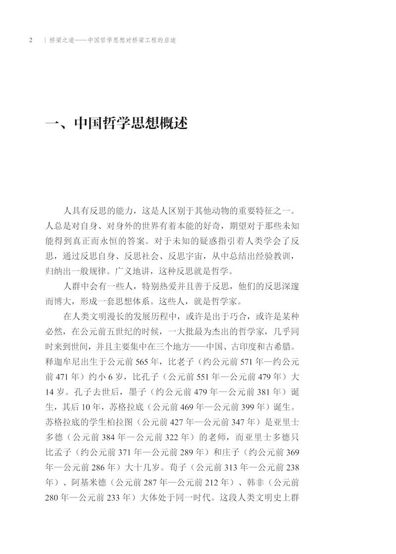 作为世界三大哲学体系之一的中国哲学,如同中国艺术一样,充满了东方特有的美感。或许在概念明晰、逻辑缜密方面,中国哲学不如西方哲学,但是对于天地本质的直觉、人生的意义以及哲学的温情与美感方面,中国哲学有时则更胜一筹。中国哲学思想是一座内涵丰富的宝库,其中闪耀的智慧光芒,既是我们民族的灵魂,也指导着中华文化前进的方向,桥梁工程师从中国哲学当中可以获得莫大的启迪。