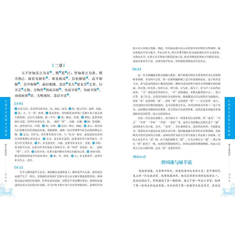 ??在编纂本书时,我们为绝大部分章节设置了“注释”“译文”“精读”“典故启示”等四个板块,力求用透彻的解读传达先哲的智慧,并用历史上生动的案例予以佐证。我们衷心希望青少年朋友能够借由本书,领悟老子思想的精髓,从而开启智慧美好的人生。