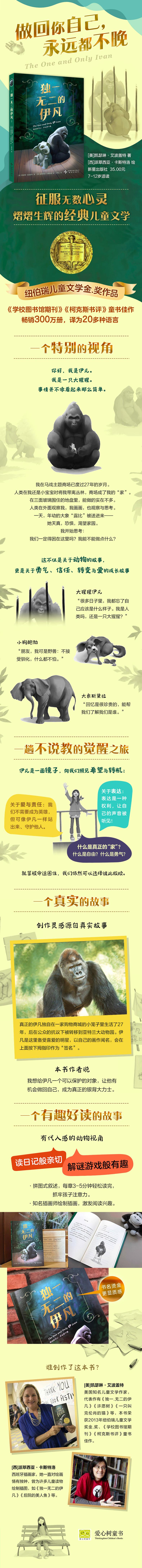 我叫伊凡,是一只银背大猩猩,在这家马戏主题商场已经度过了二十七年的岁月。人类在我还是小宝宝时将我带离丛林故土,这里成了我的“家”——一个被玻璃墙围住的地盘。人类在外面观察我,我画画,也观察与思考。大家叫我高速公路大猩猩、8号出口的大猿、银背大力士。这些名字都属于我,但不等同于我。我是伊凡,独一无二的伊凡。