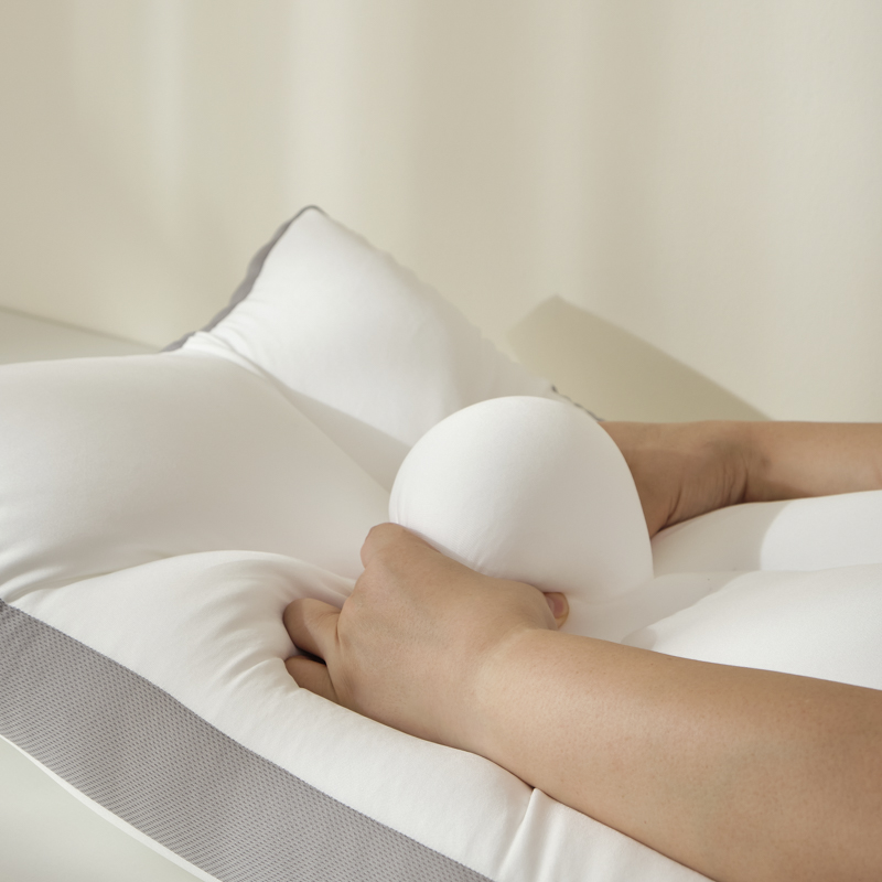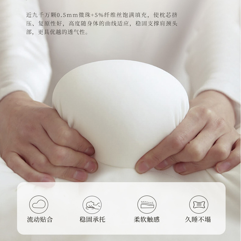 近九千万颗0.5mm微珠+5%纤维丝饱满填充,使枕芯挤压、复原性好,高度随身体的曲线适应,稳固支撑肩颈头部,更具优越的透气性。