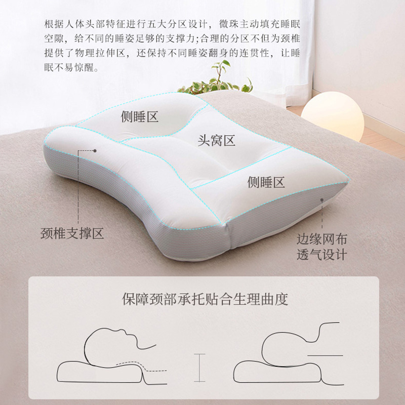 根据人体头部进行五大分区设计,分区填充设计,微珠主动填充睡眠空隙,可根据需要调整粒子位置来符合高低需求,给不同的睡姿足够的支撑力。