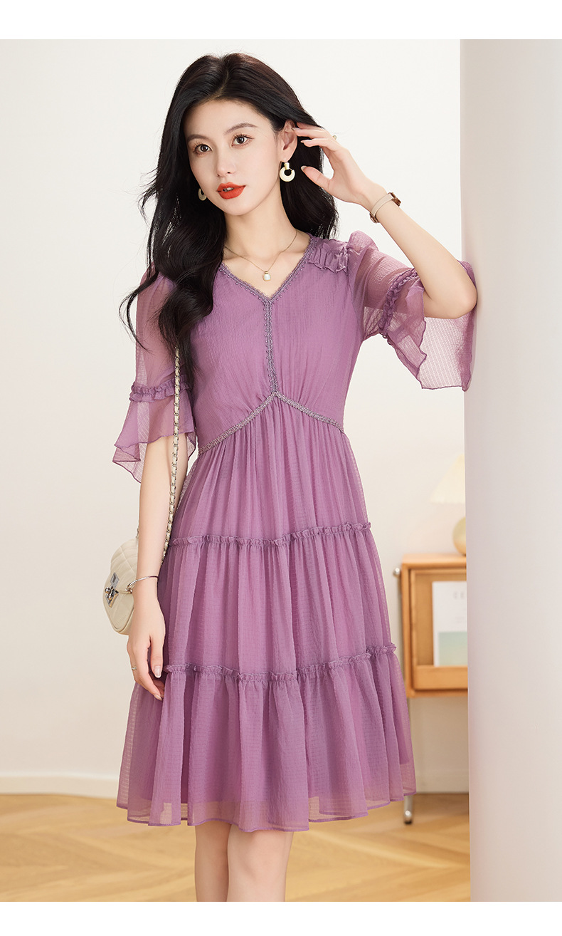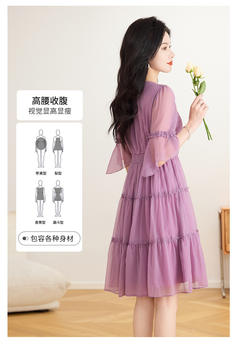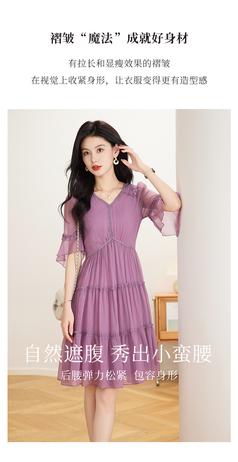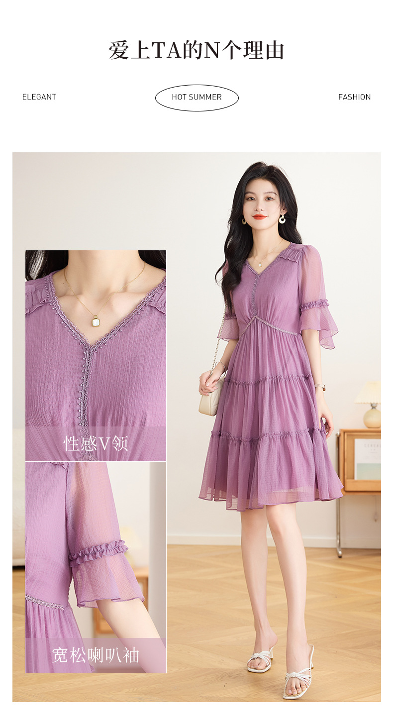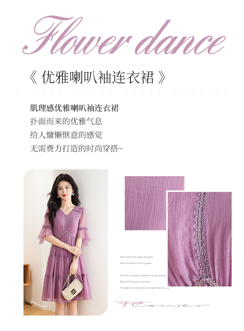喇叭袖短袖连衣裙,气质V领木耳边拼结中长款A字裙QYM-TB-40110-1-Y
