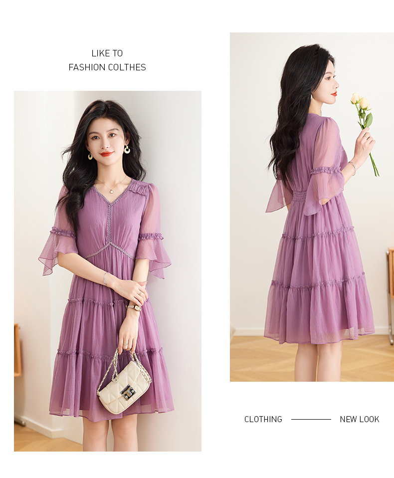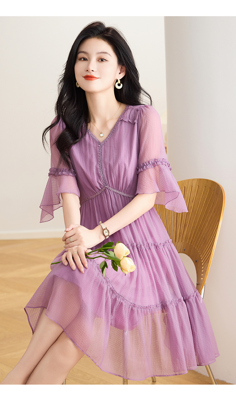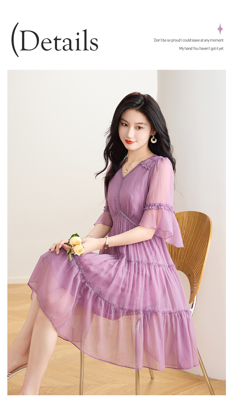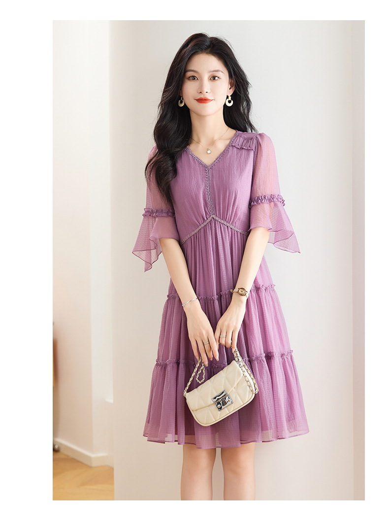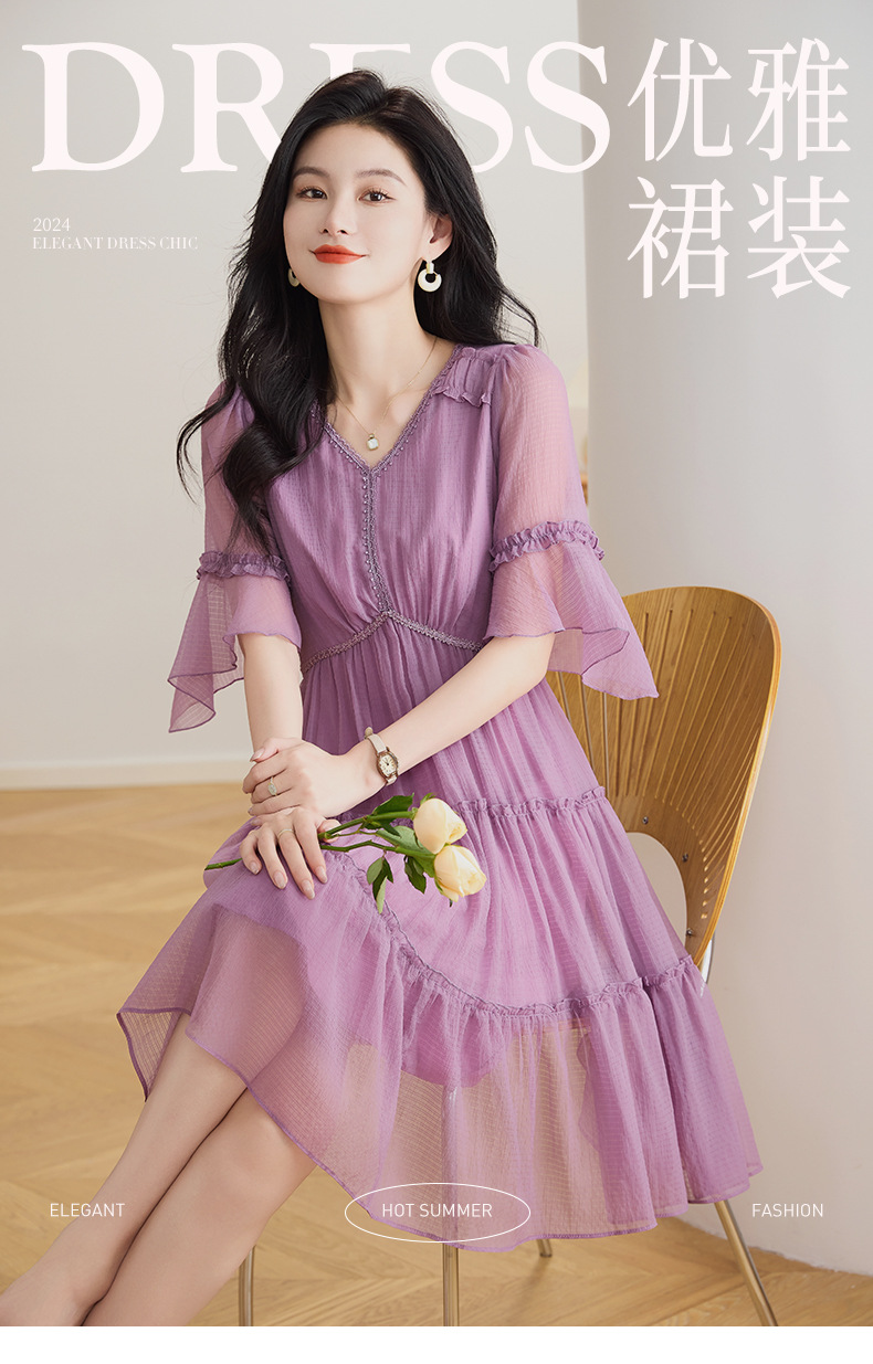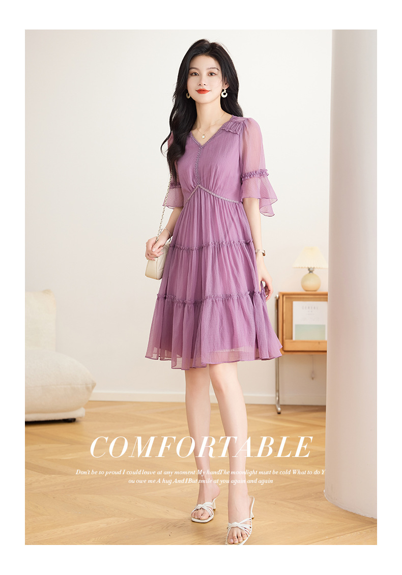 喇叭袖短袖连衣裙,气质V领木耳边拼结中长款A字裙QYM-TB-40110-1-Y