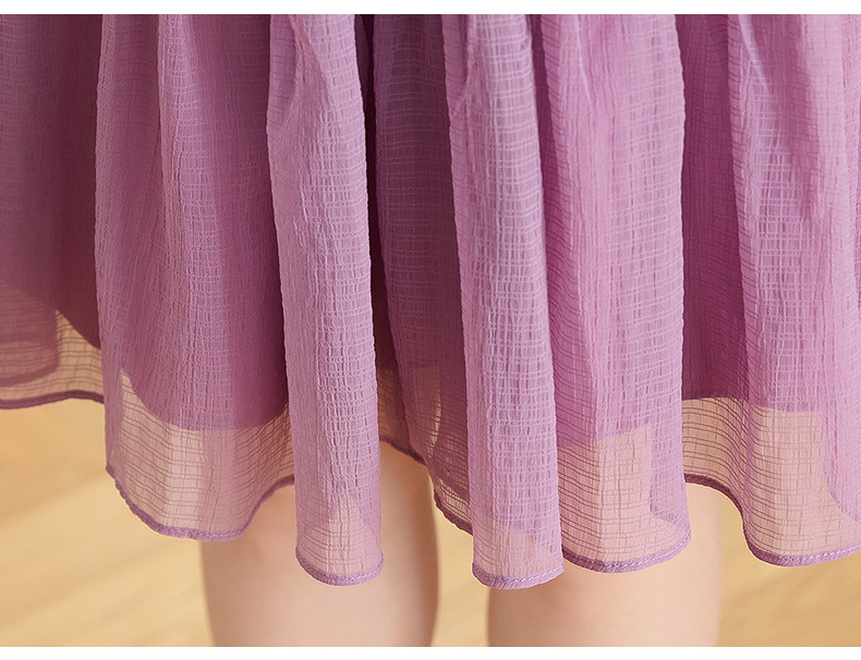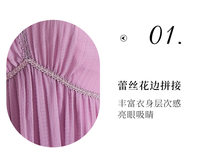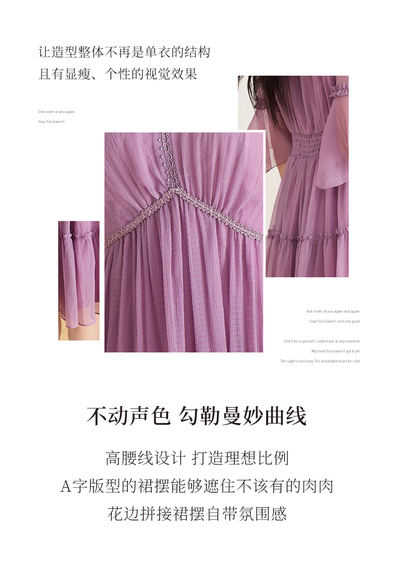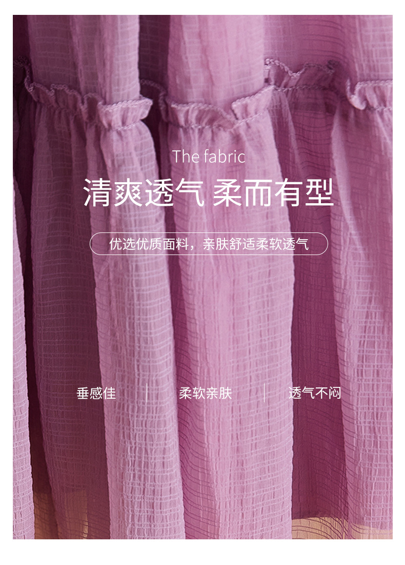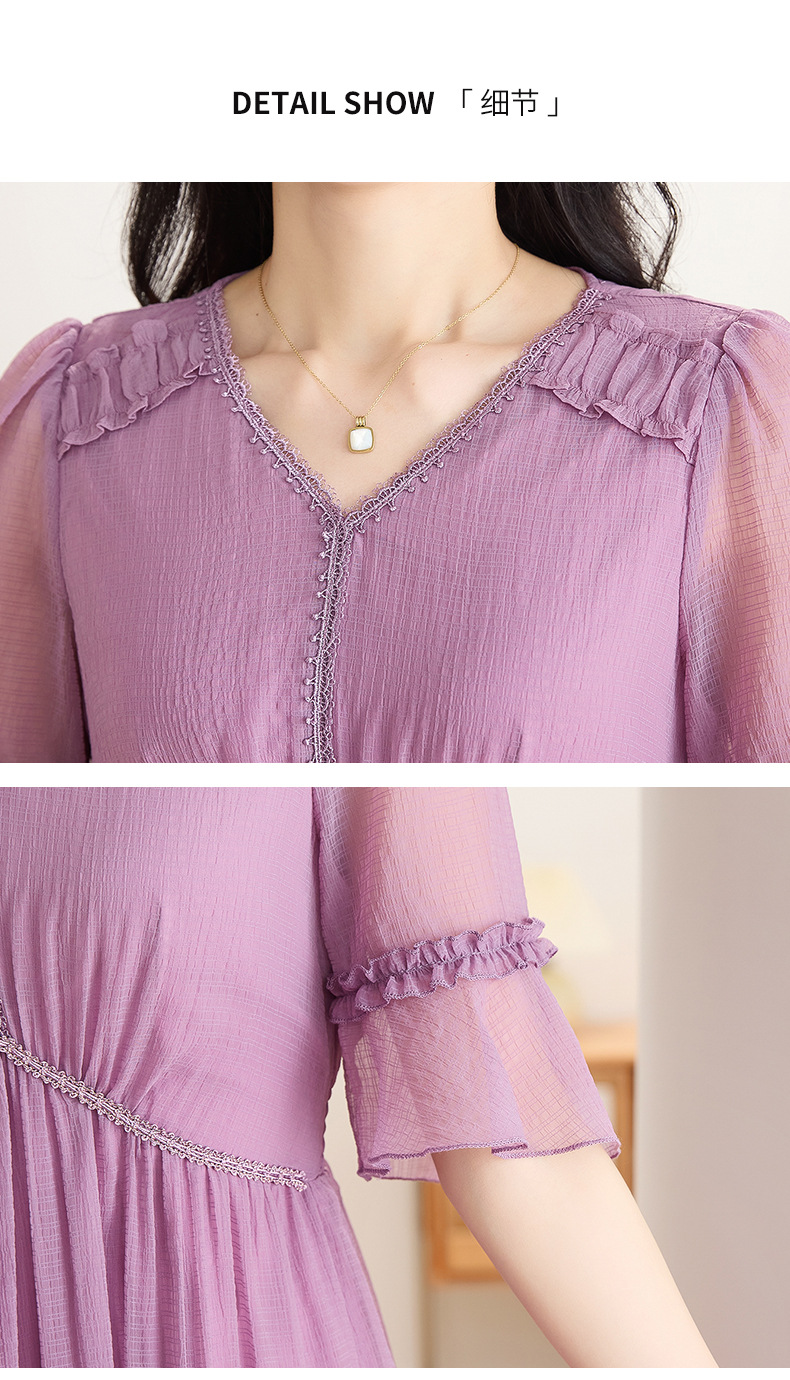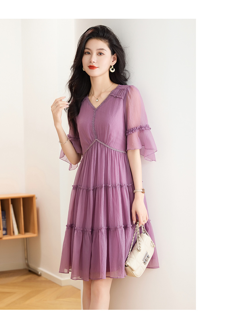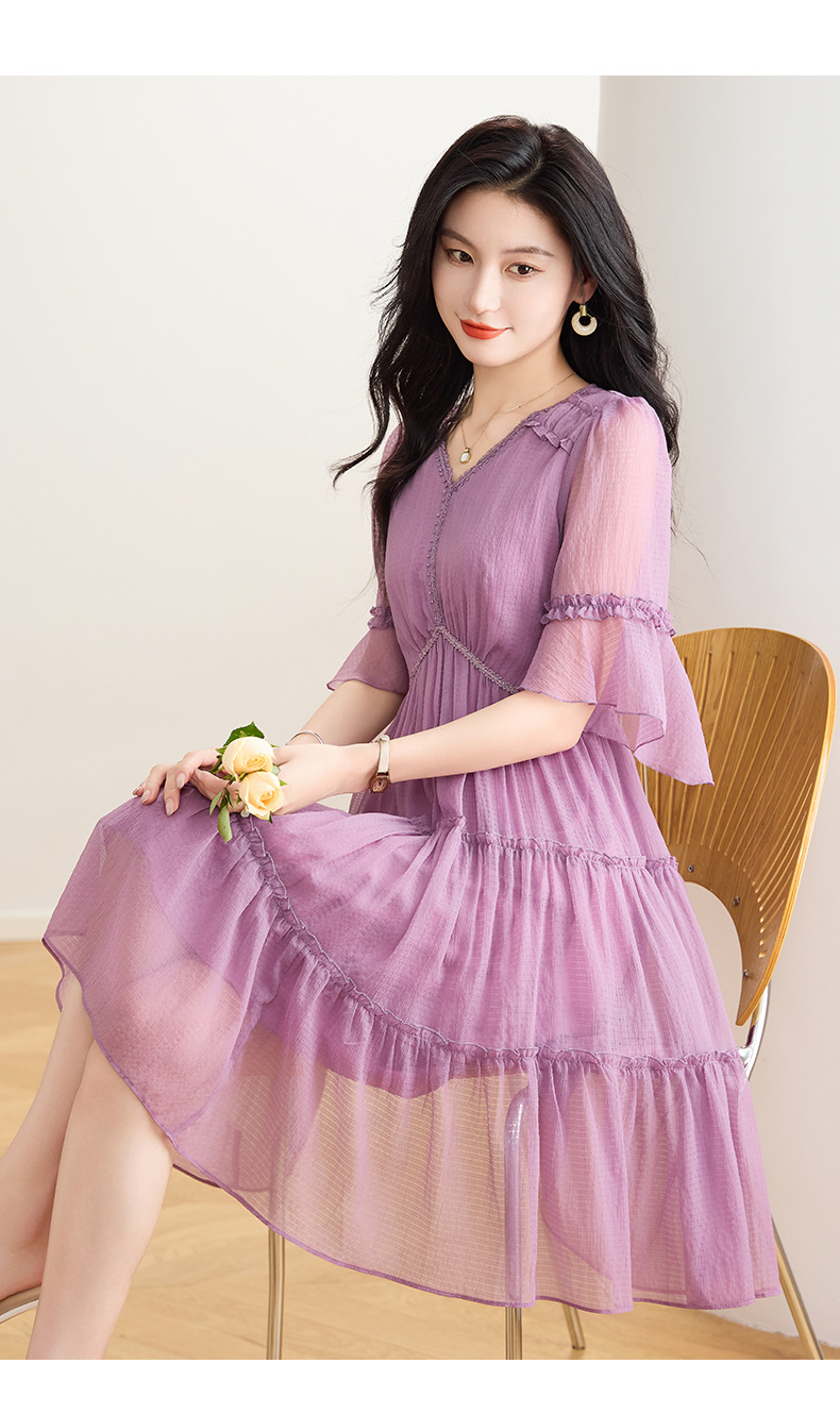 喇叭袖短袖连衣裙,气质V领木耳边拼结中长款A字裙QYM-TB-40110-1-Y