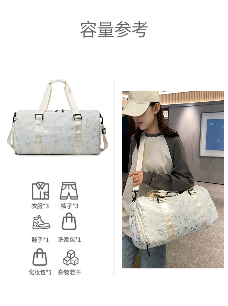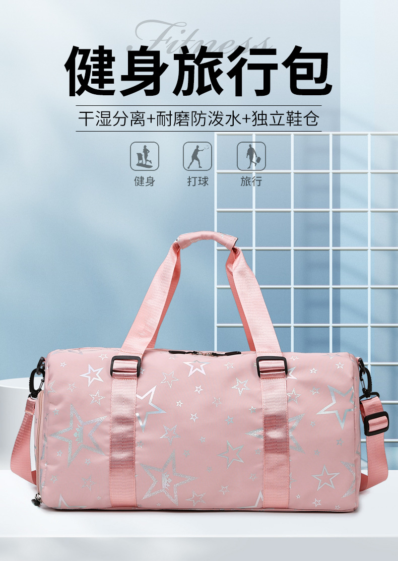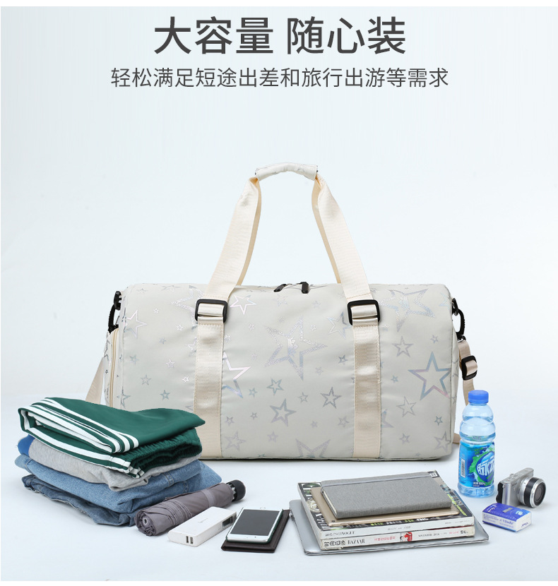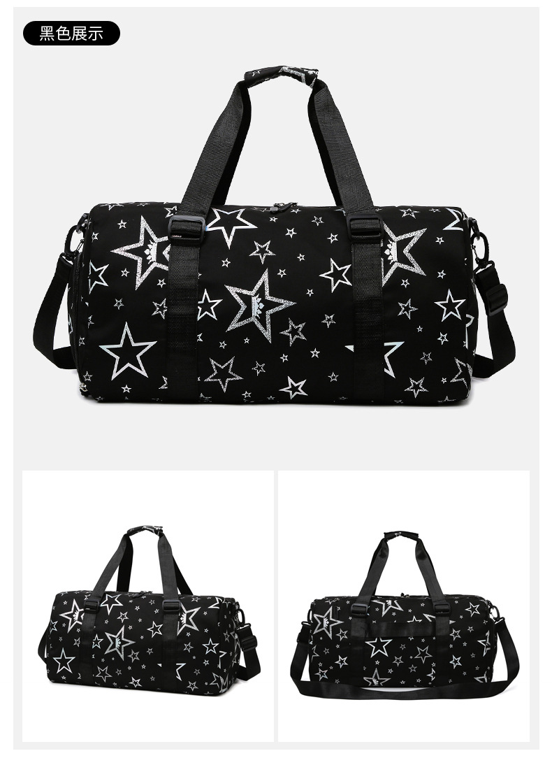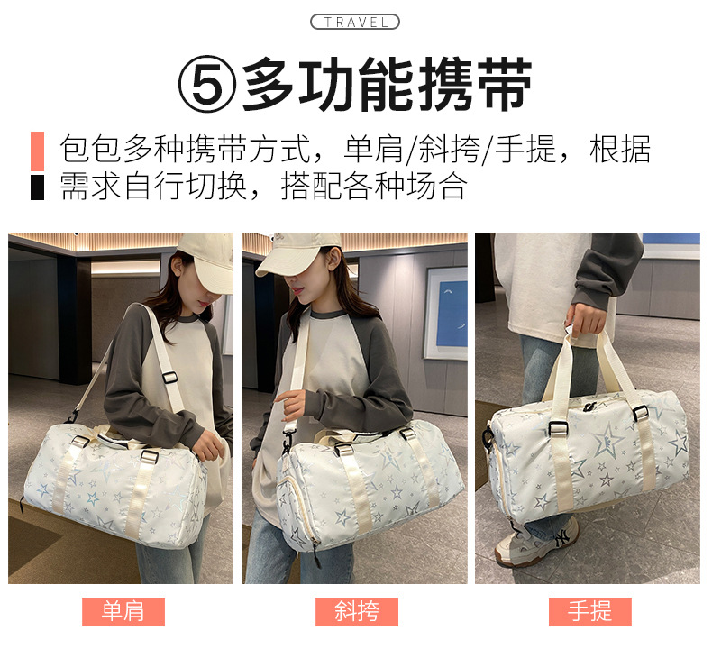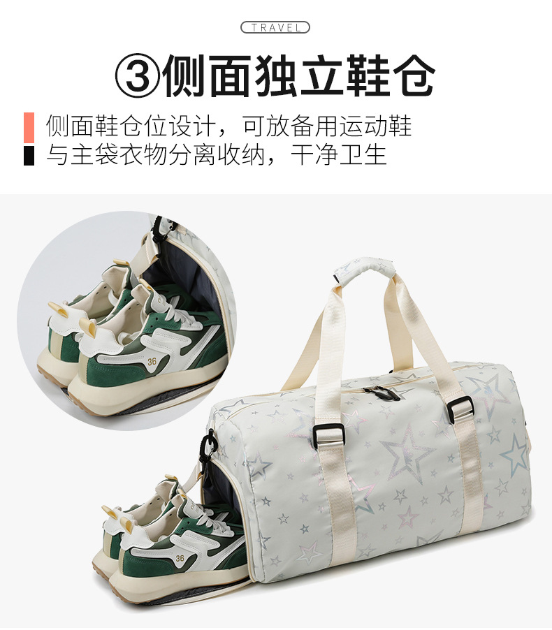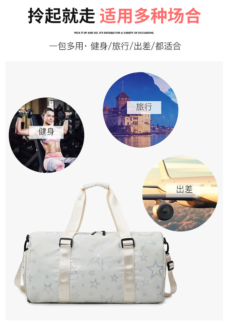 【时尚潮搭,超能装,干湿分离!】单肩手提斜挎多种背法 大容量手提旅行包 可插拉杆箱 时尚五角星短途行李包 多功能干湿分离健身包-QB