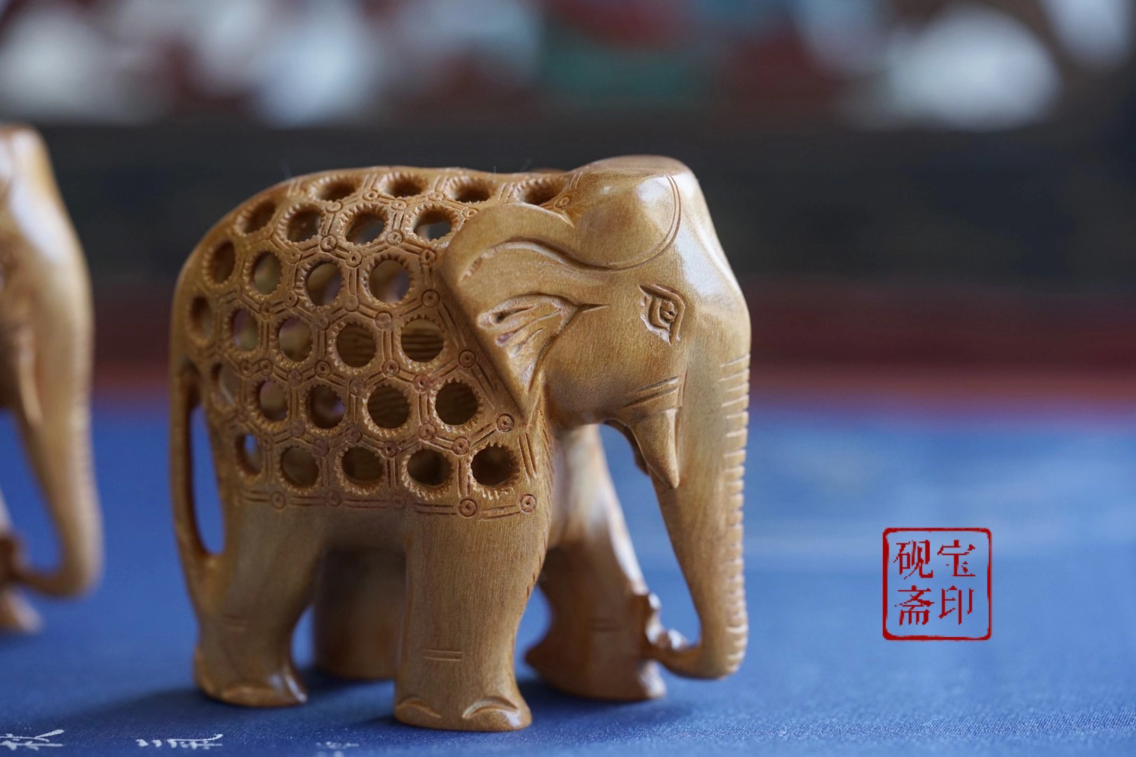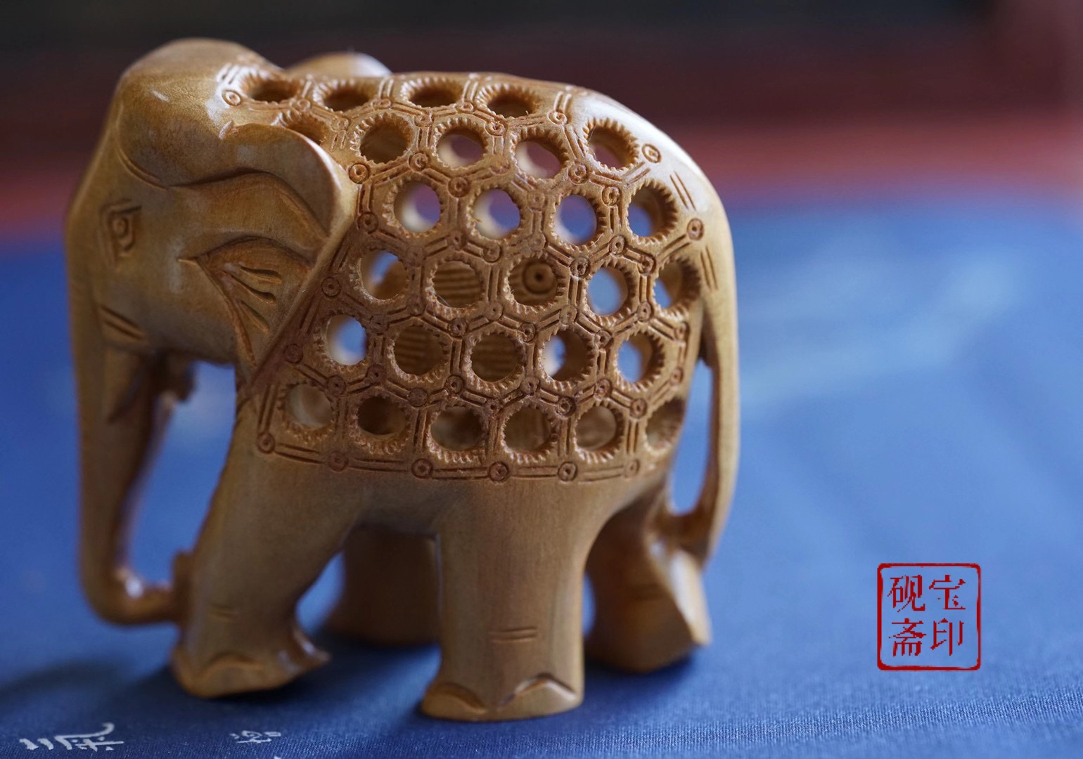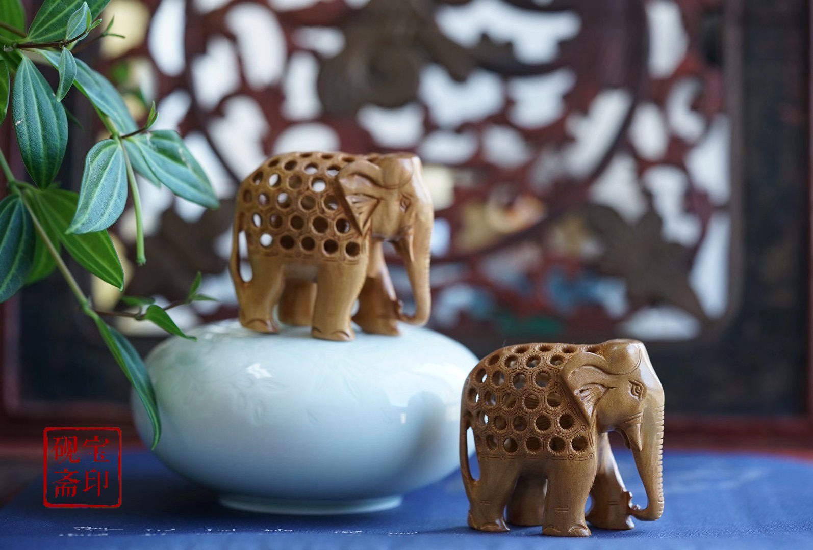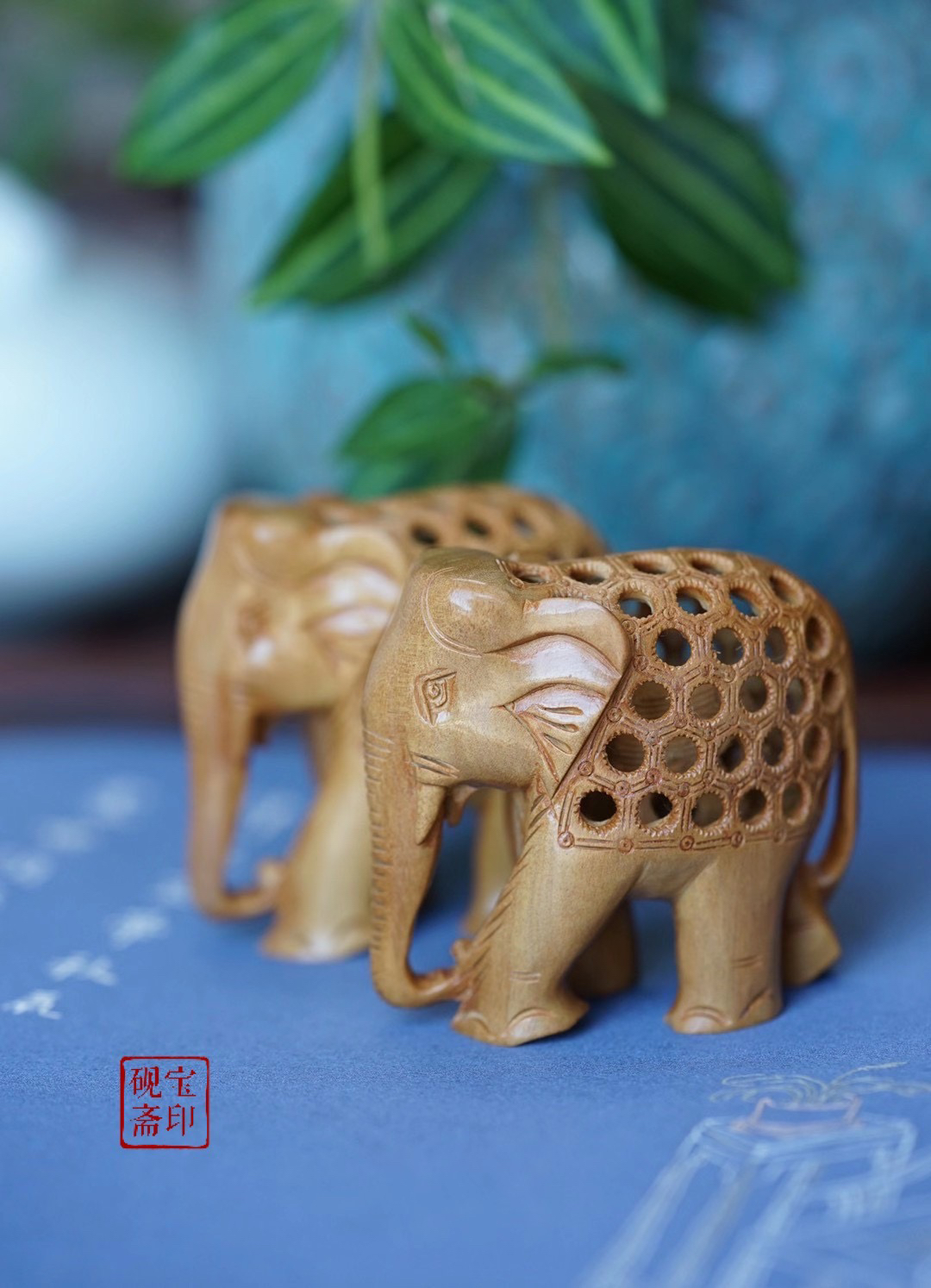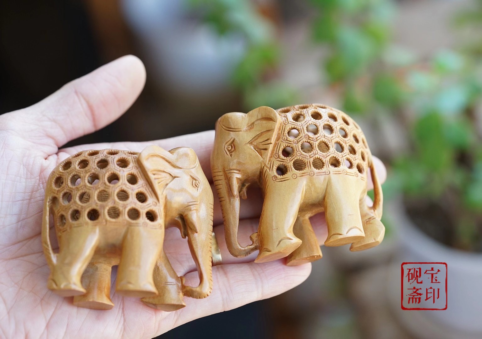 # 今日小压轴 #印度老山檀,迈索尔料子,醇化料。这一对大象对原料要求很高。需要木料大,也需要厚。对于十檀九空的老山檀来说,这种木料也就是缘分能定。大象镂空设计,里面还是一个大象,可见雕刻难度多高。