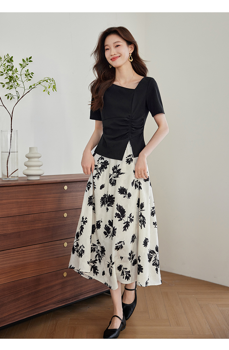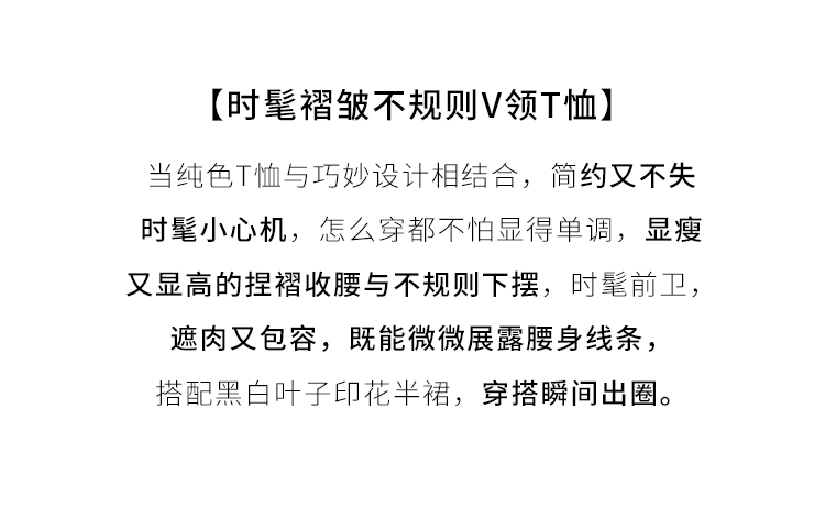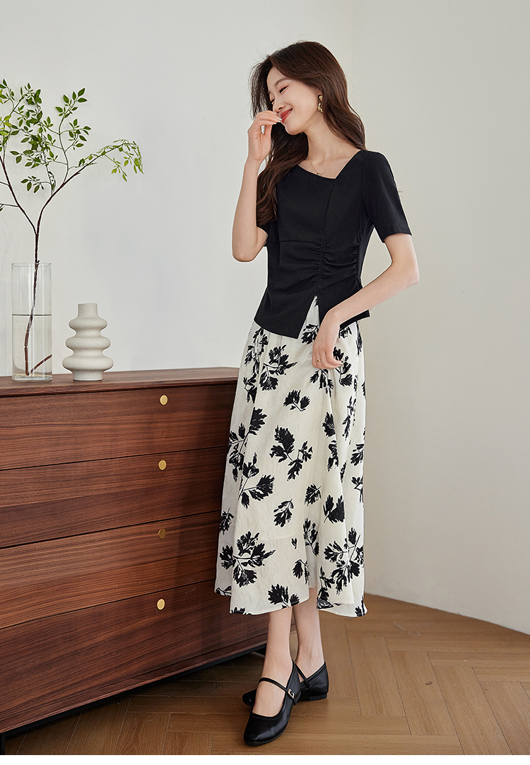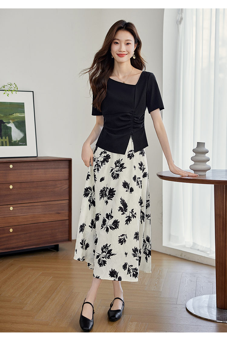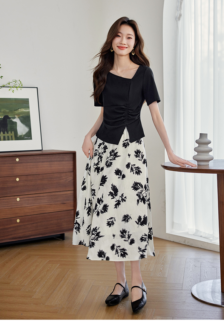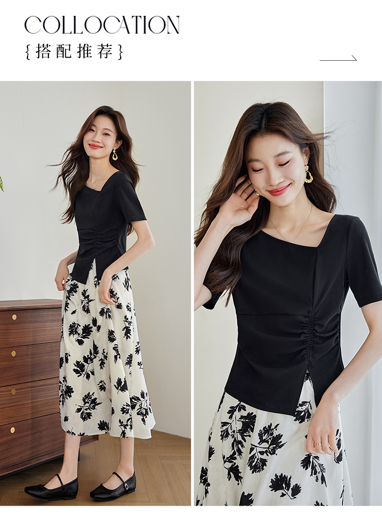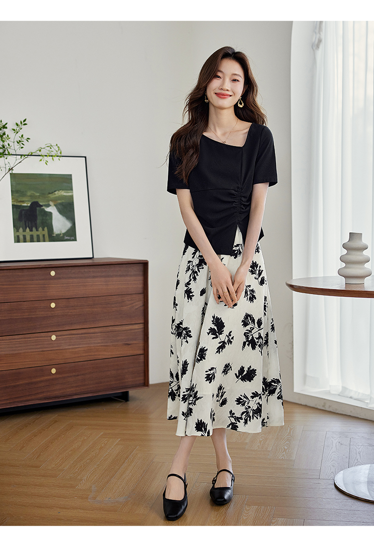 【专属特价】熙世界2025夏新款女装不规则褶皱V领短袖T恤碎花伞裙半身裙两件套