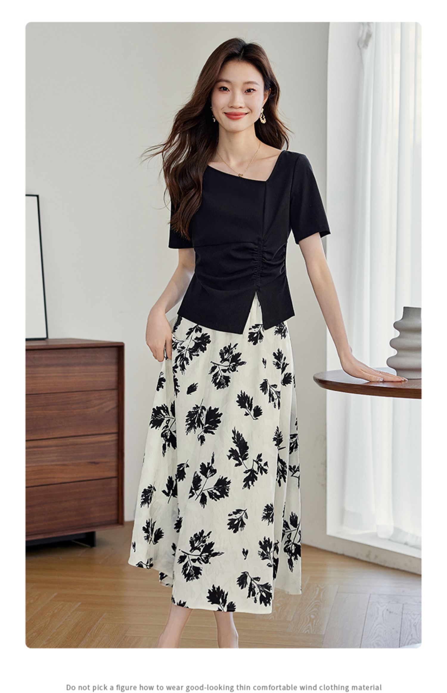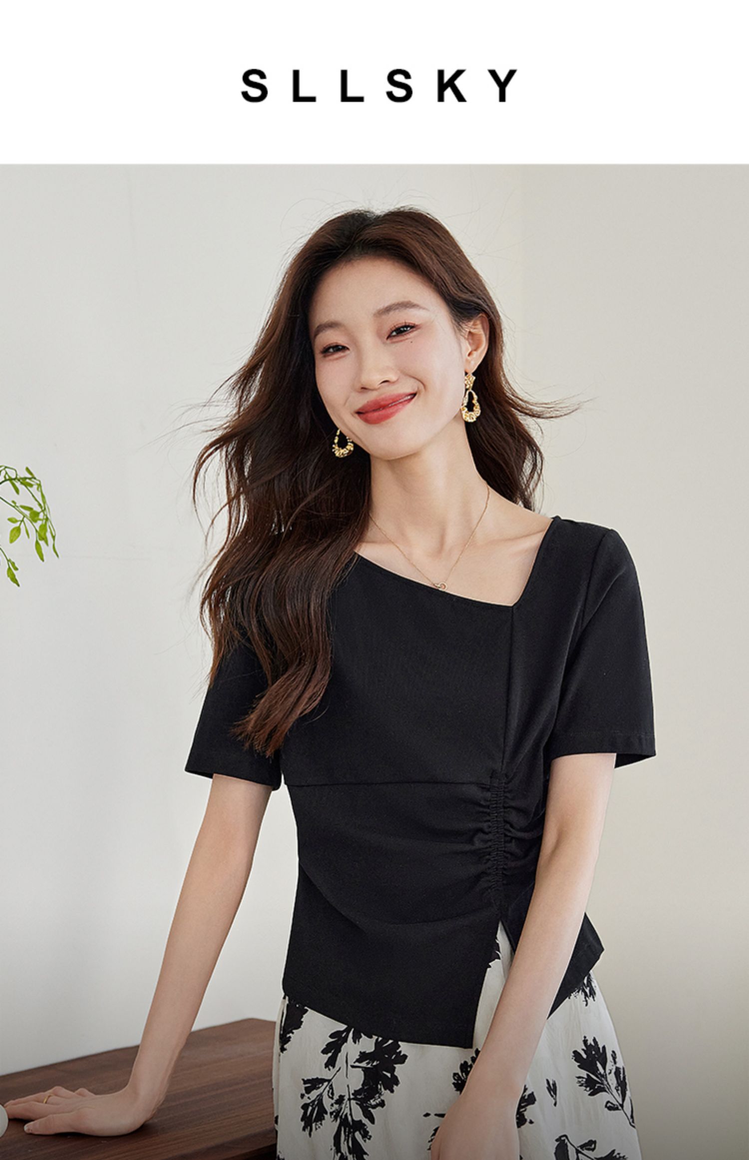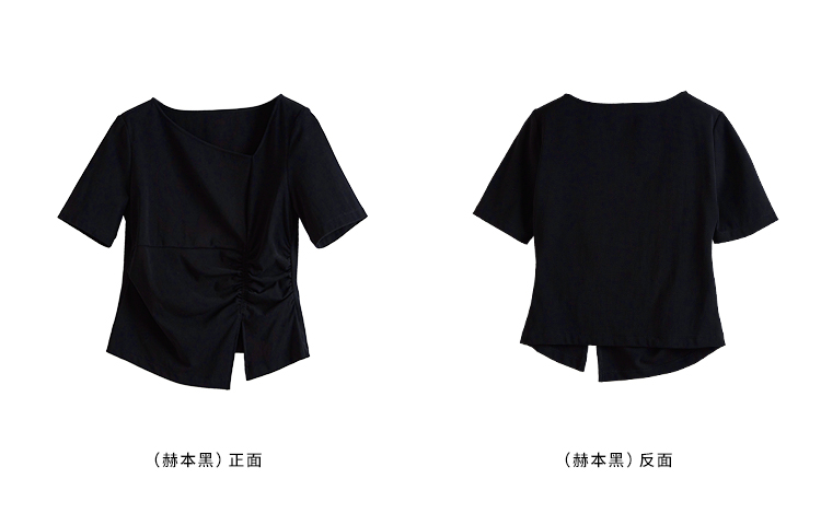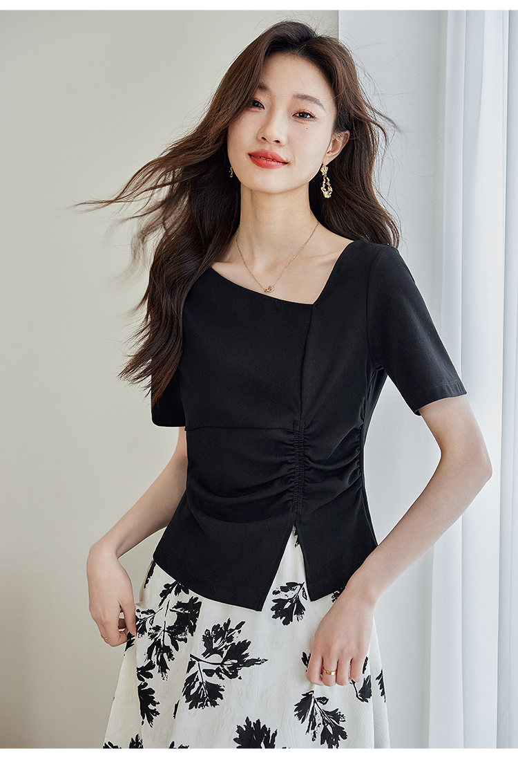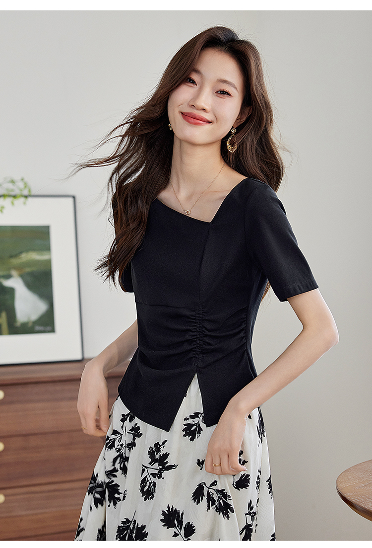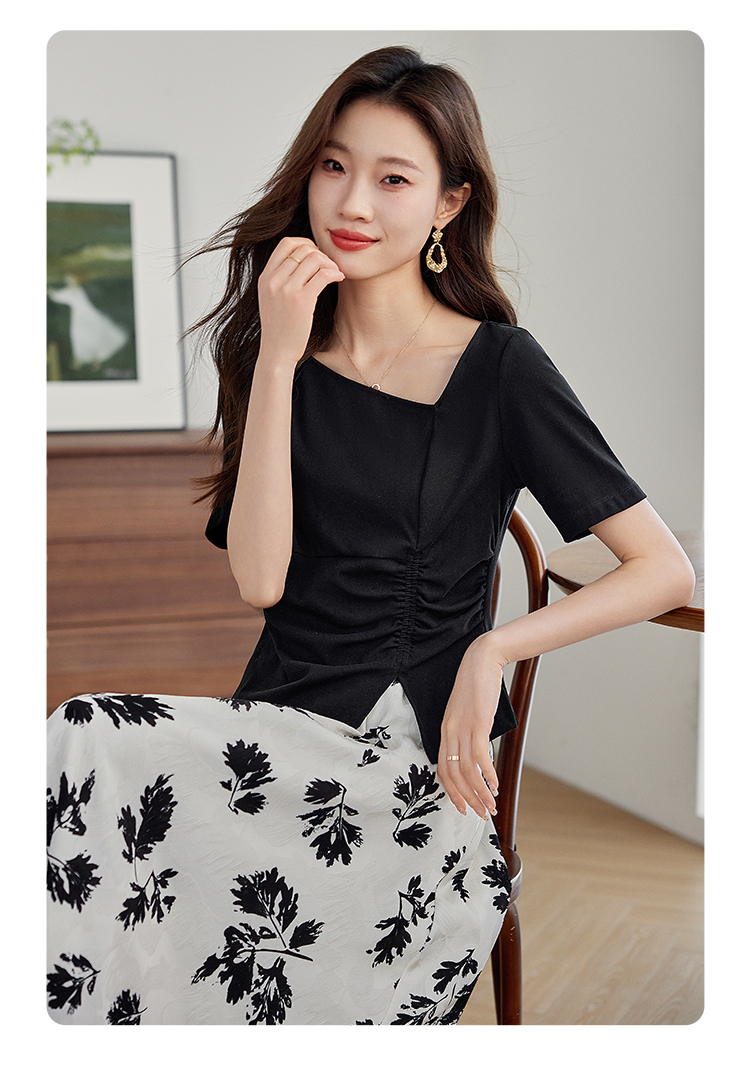 【专属特价】熙世界2025夏新款女装不规则褶皱V领短袖T恤碎花伞裙半身裙两件套