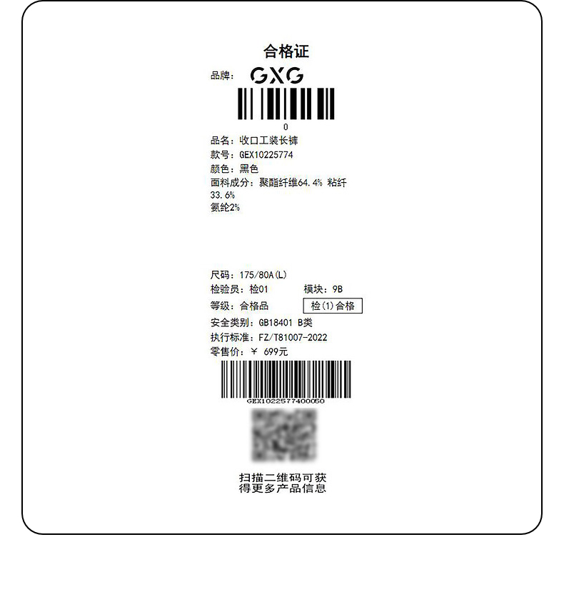 GXG男装 黑色收口工装长裤 冬季热卖GEX10225774