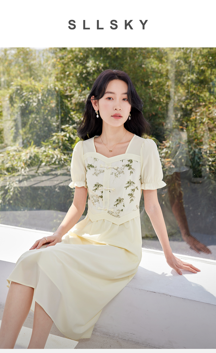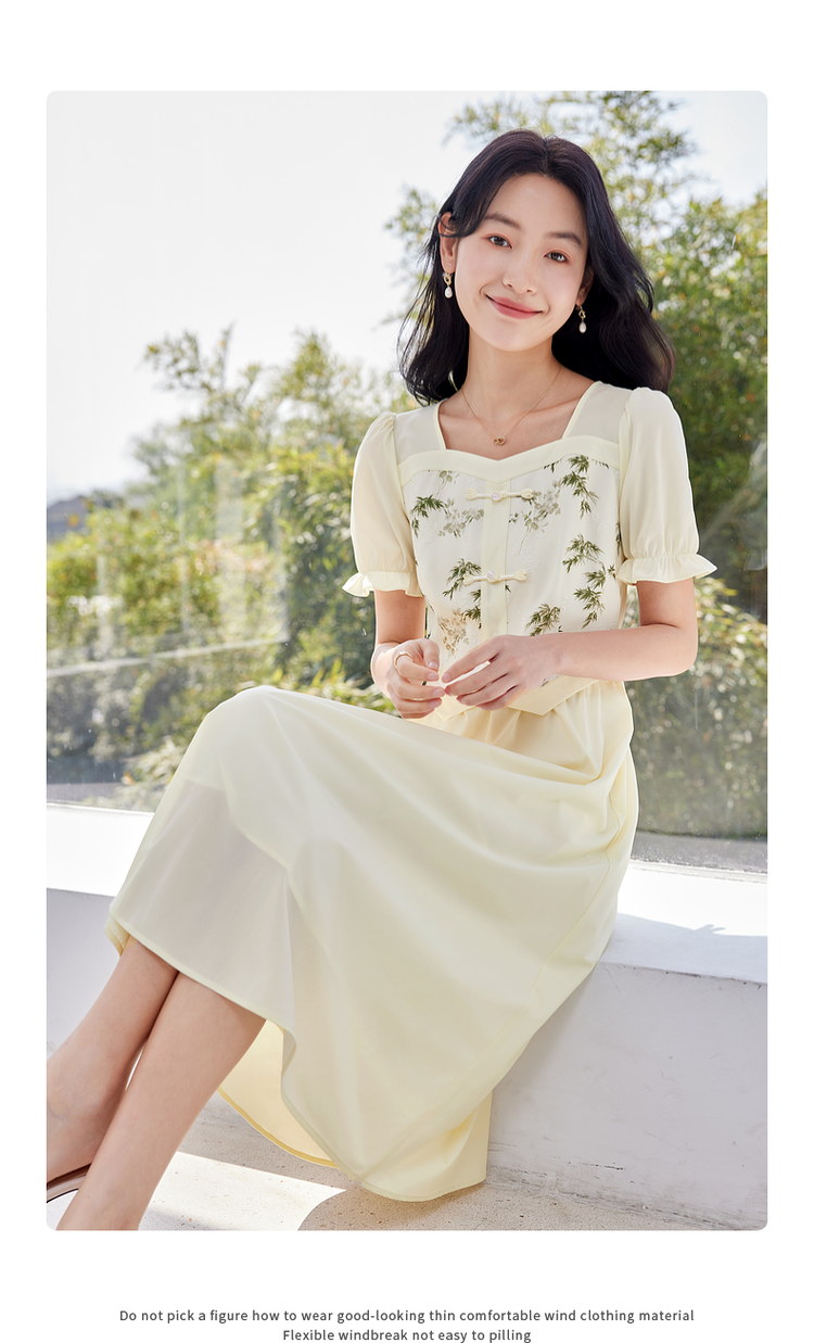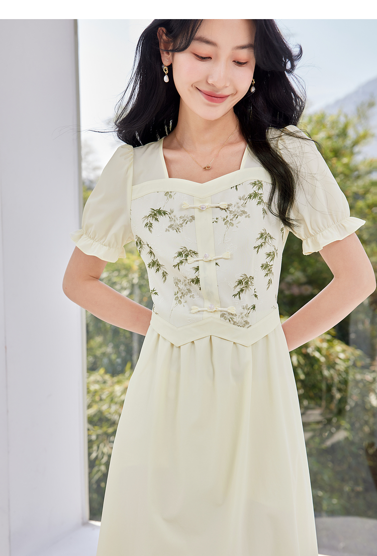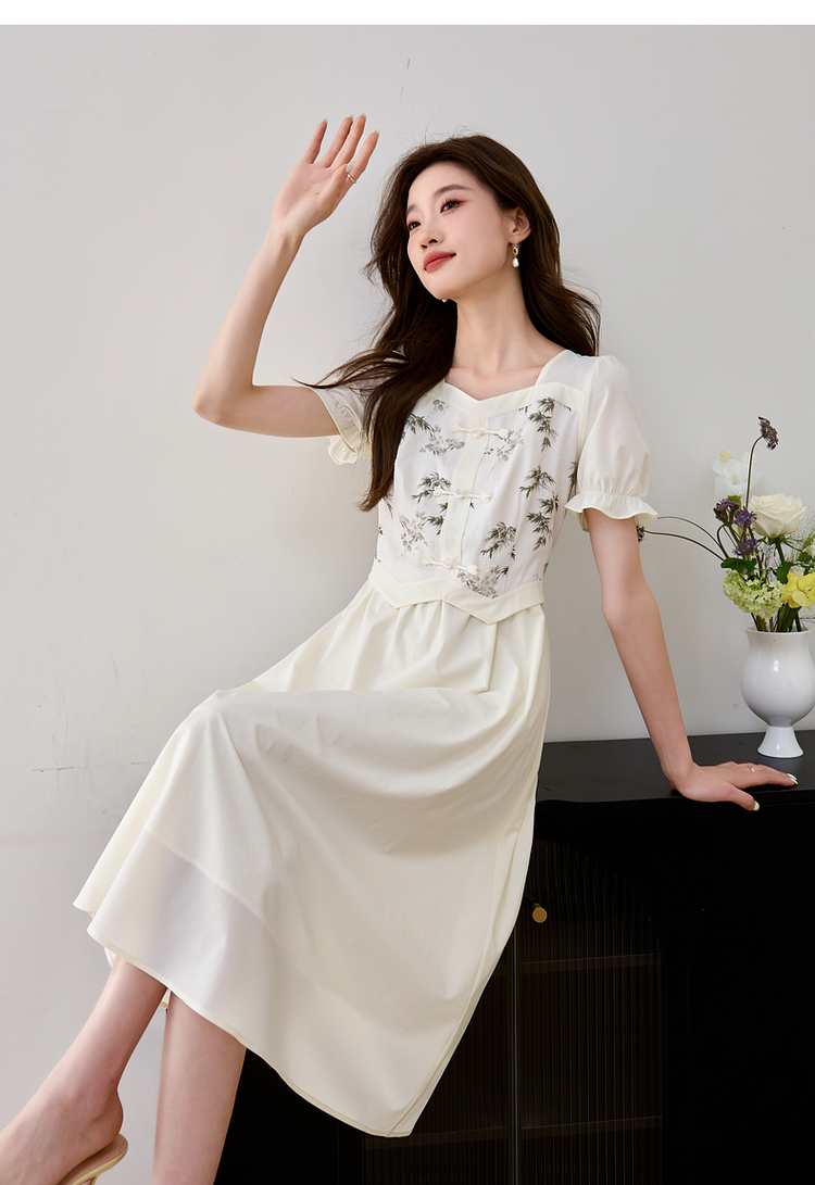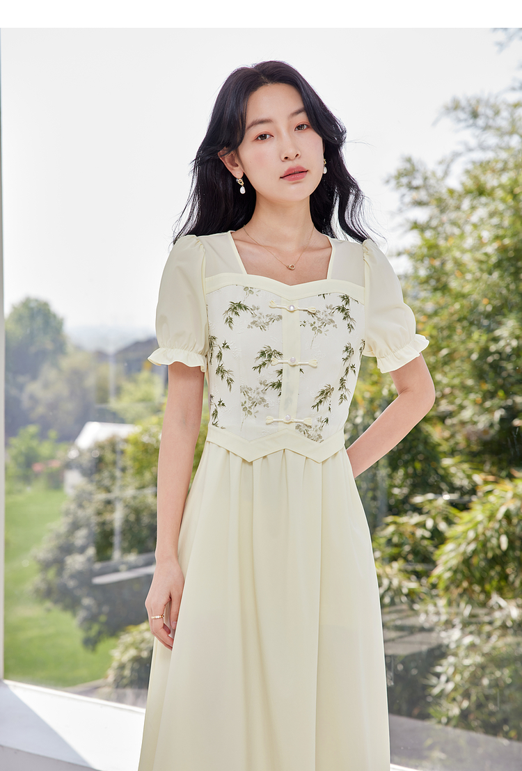 【专属特价】熙世界假两件新中式方领连衣裙夏季新款收腰显瘦水墨画国风长裙