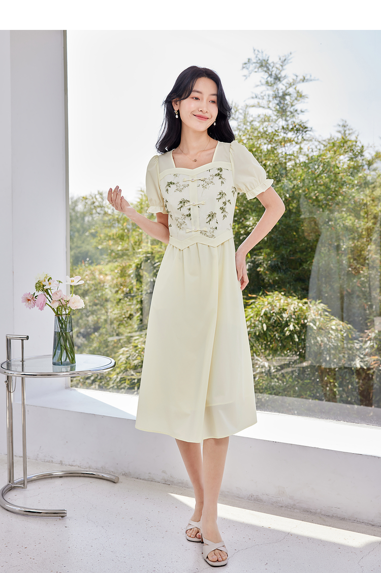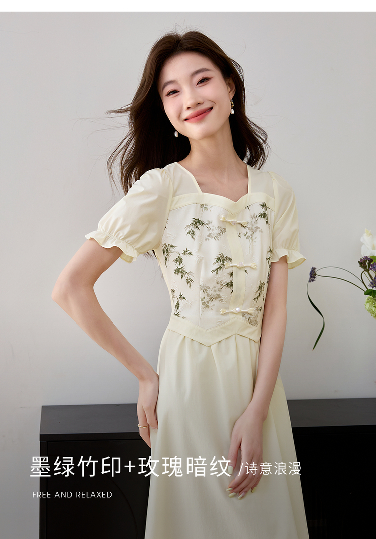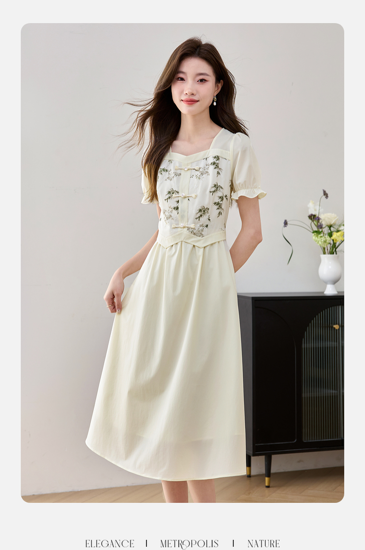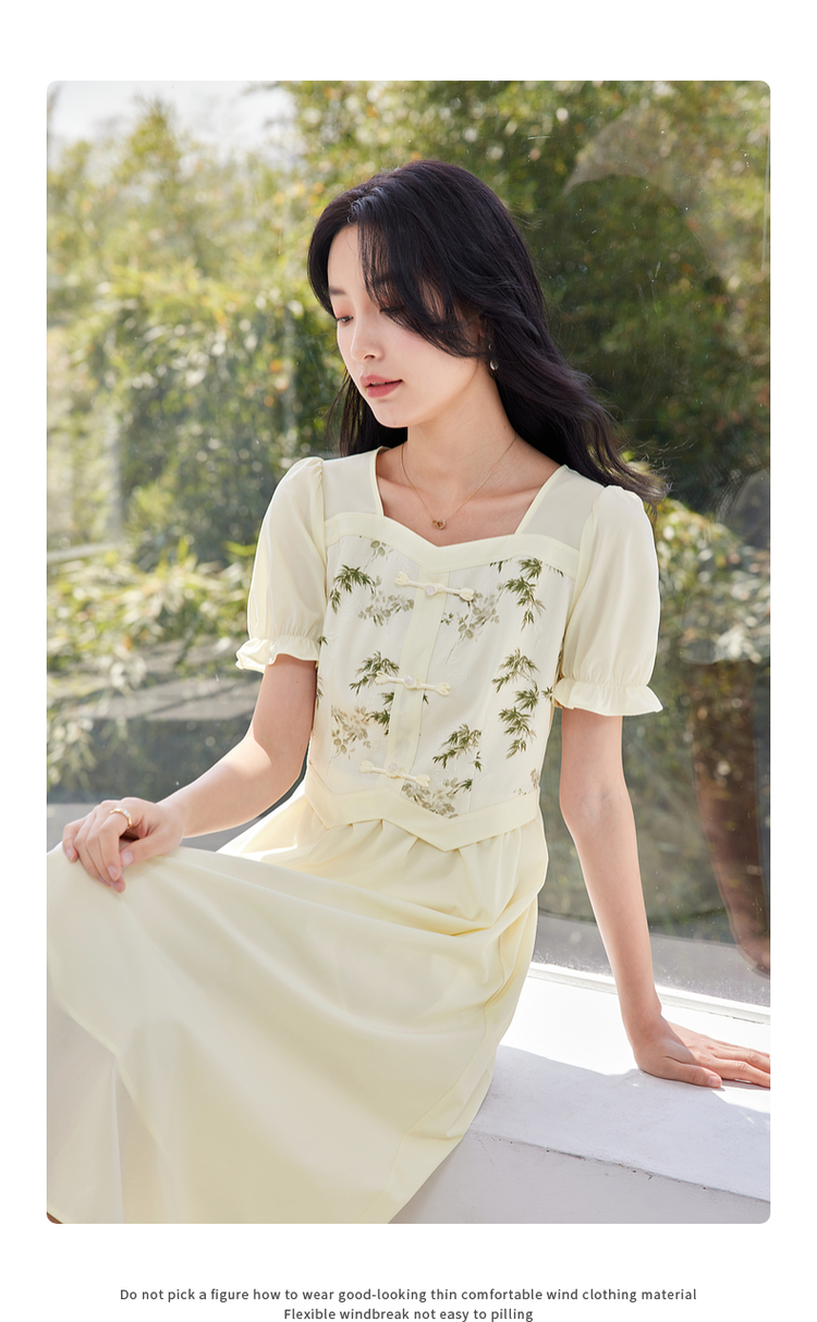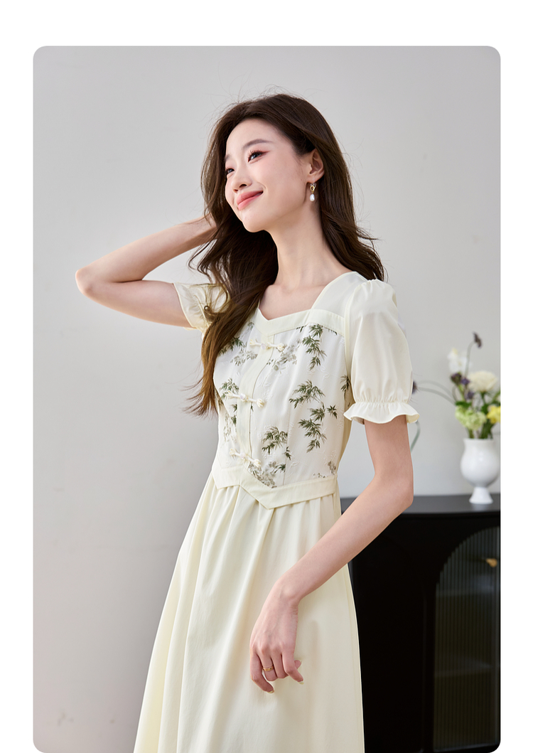 【专属特价】熙世界假两件新中式方领连衣裙夏季新款收腰显瘦水墨画国风长裙