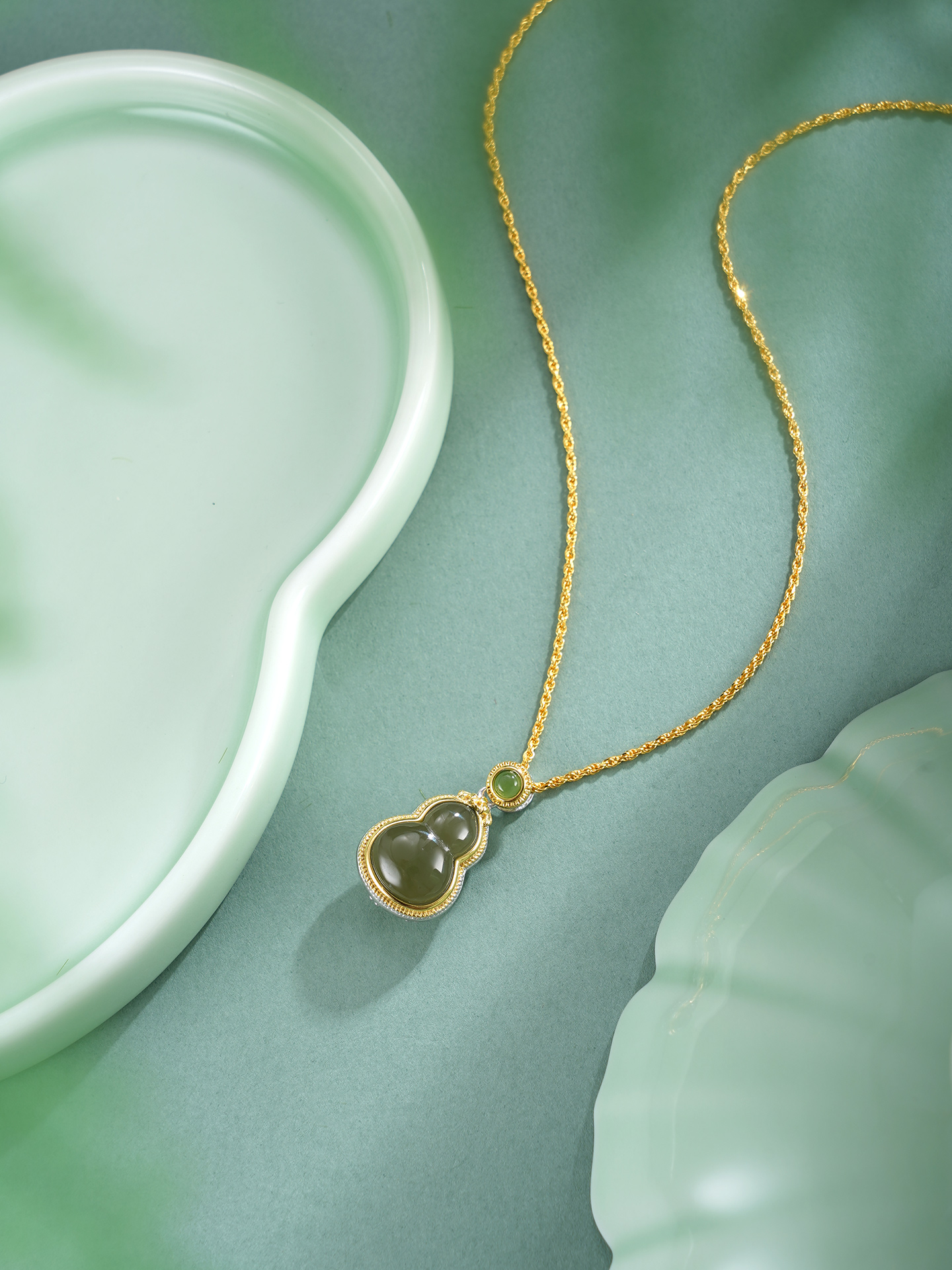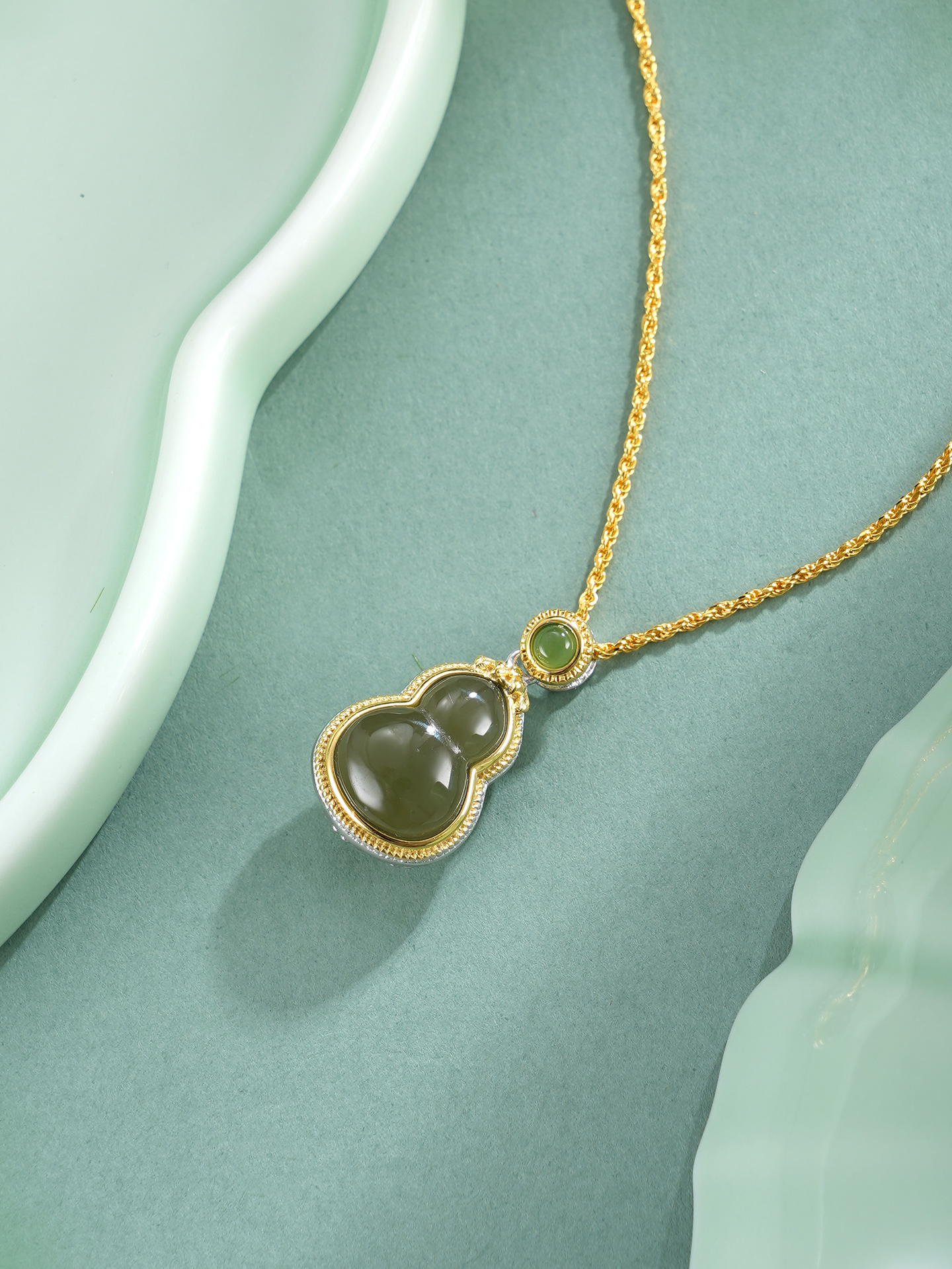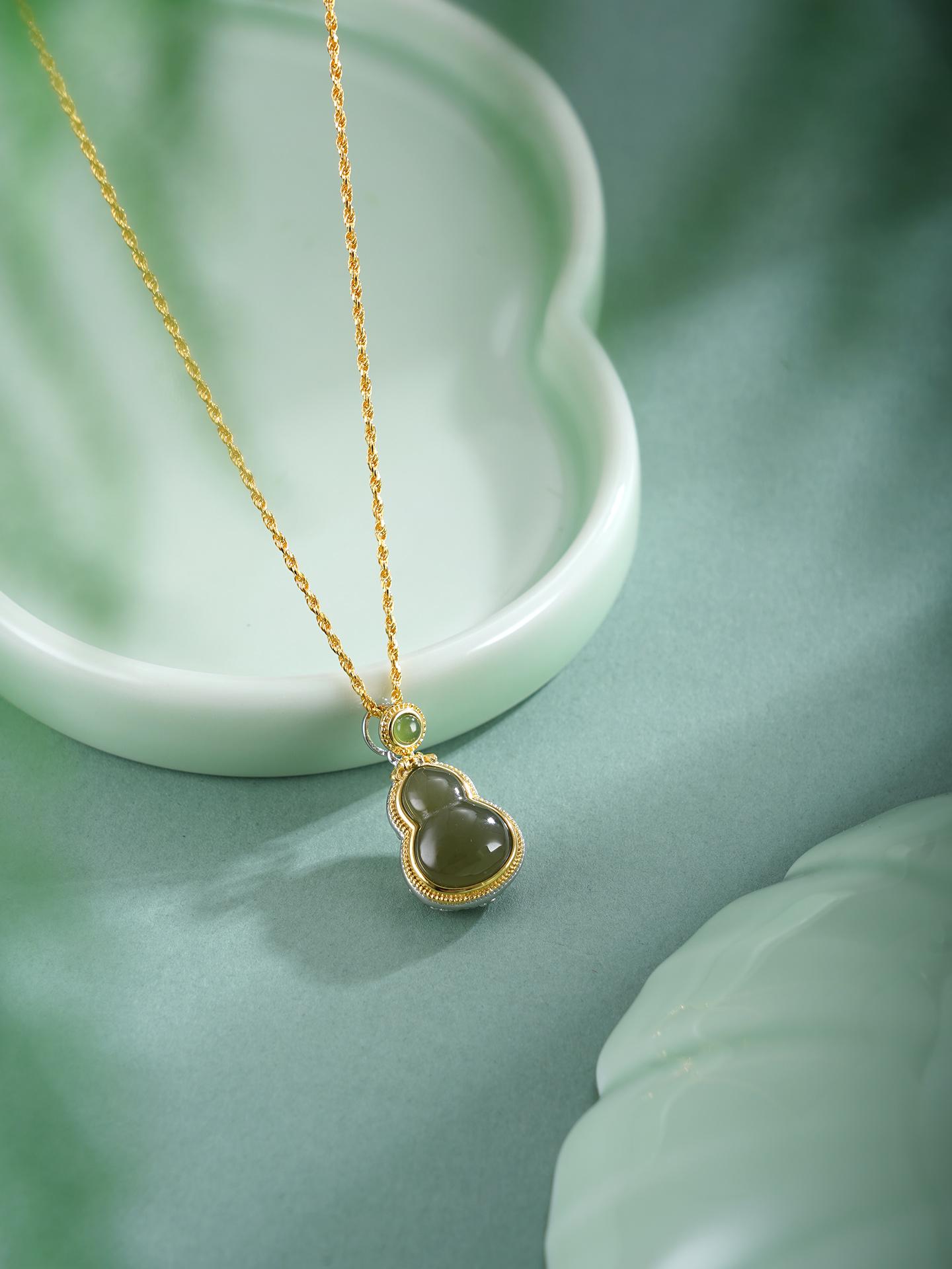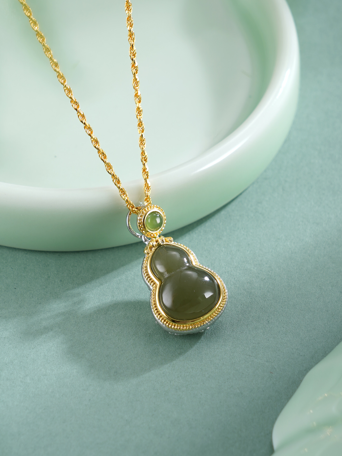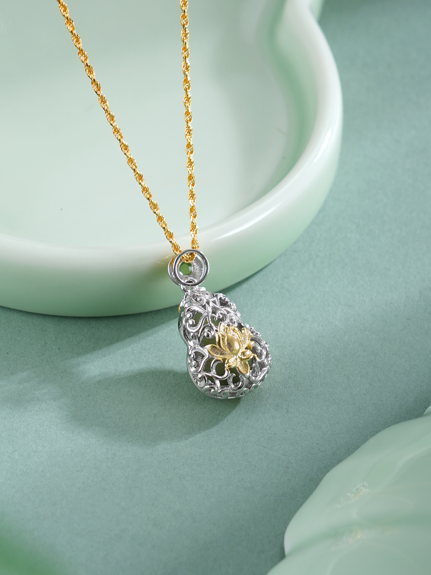 【寓意】:葫芦吊坠正面晴水玉镶嵌,背面花丝勾勒,莲花纹样点缀,寓意福禄双全、平安吉祥。