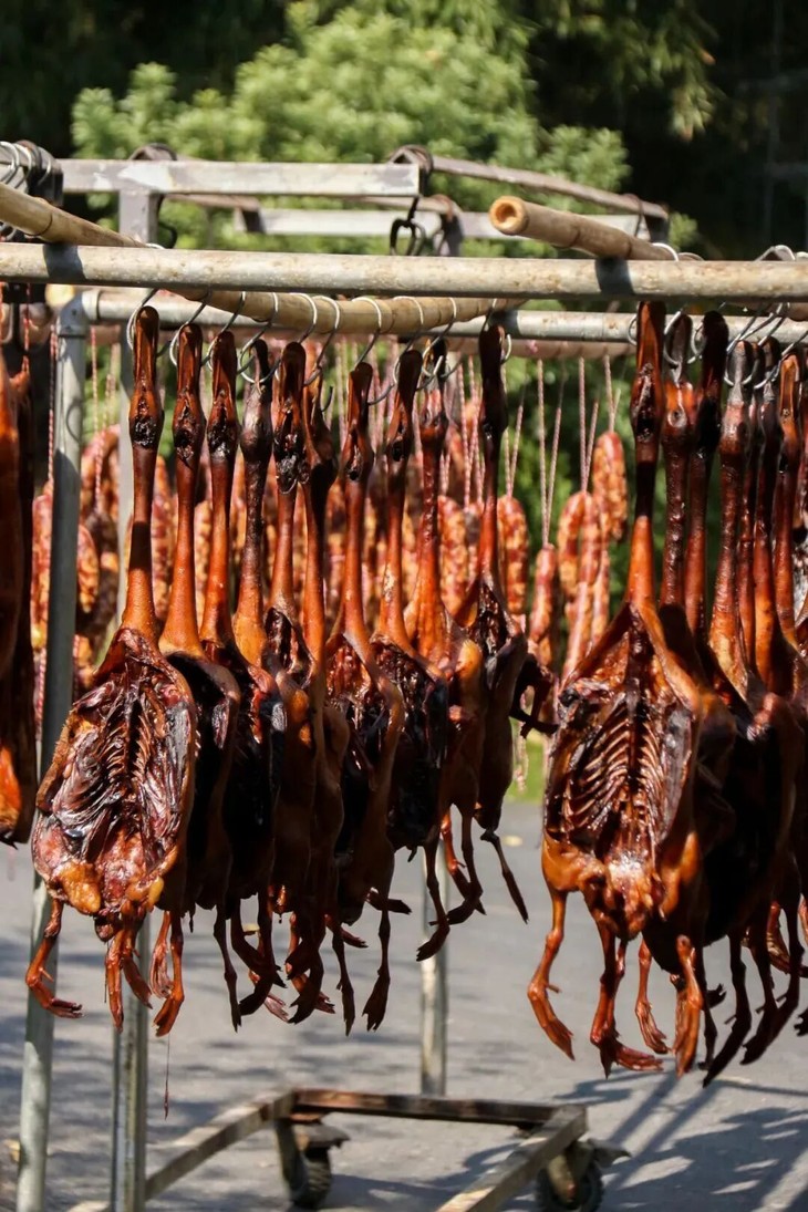 酱制完成后,还需借助时间与自然。酱鸭需要先要在低温烘房中静置14小时,让水分初步蒸发,随后转入自然环境中进行长达一周以上的晾晒。正是这“风吹日晒”的过程,逼出了多余油脂,晒出了诱人色泽,凝练了醇厚风味。