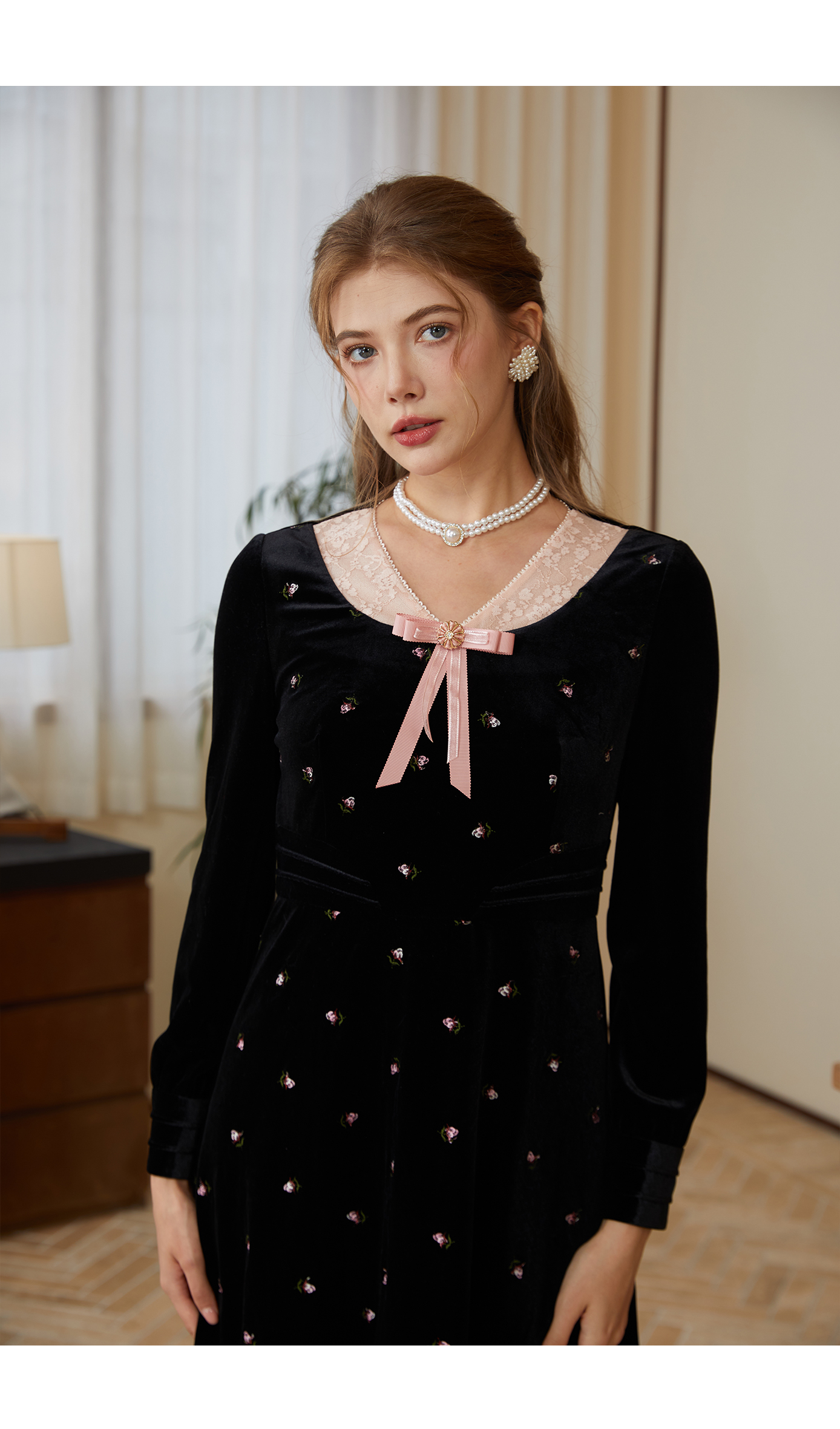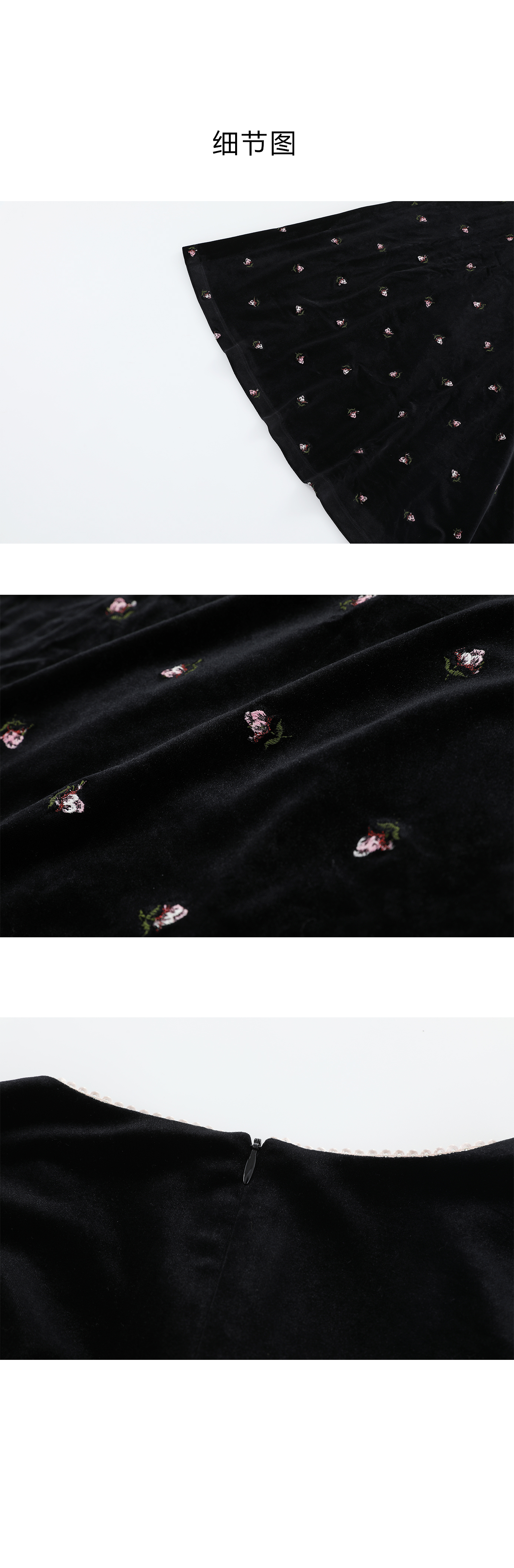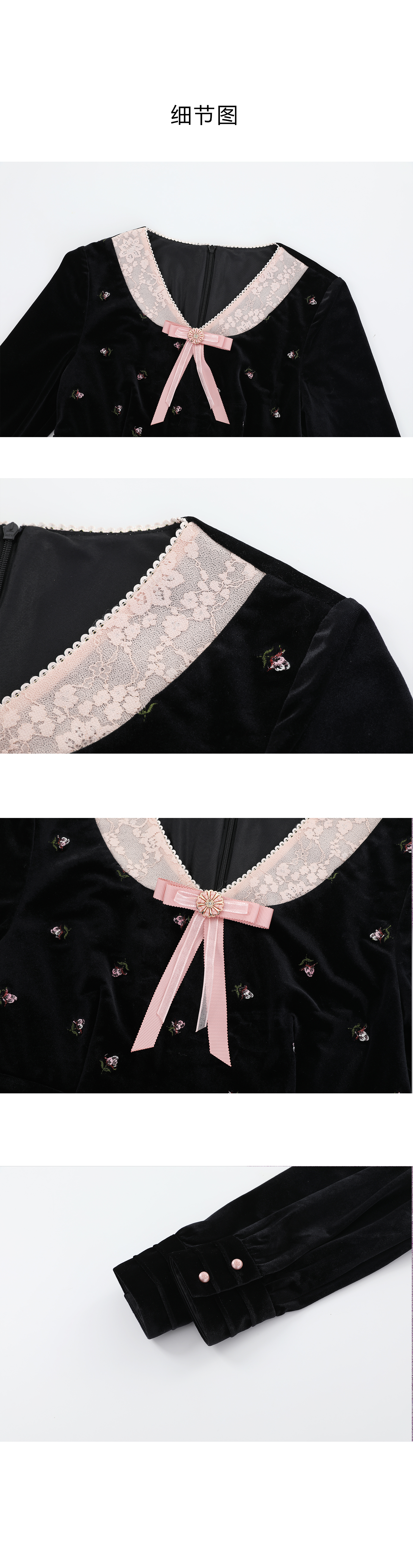 司歌丝绒绣花v领冬连衣裙收腰弹力复古气质A921233X