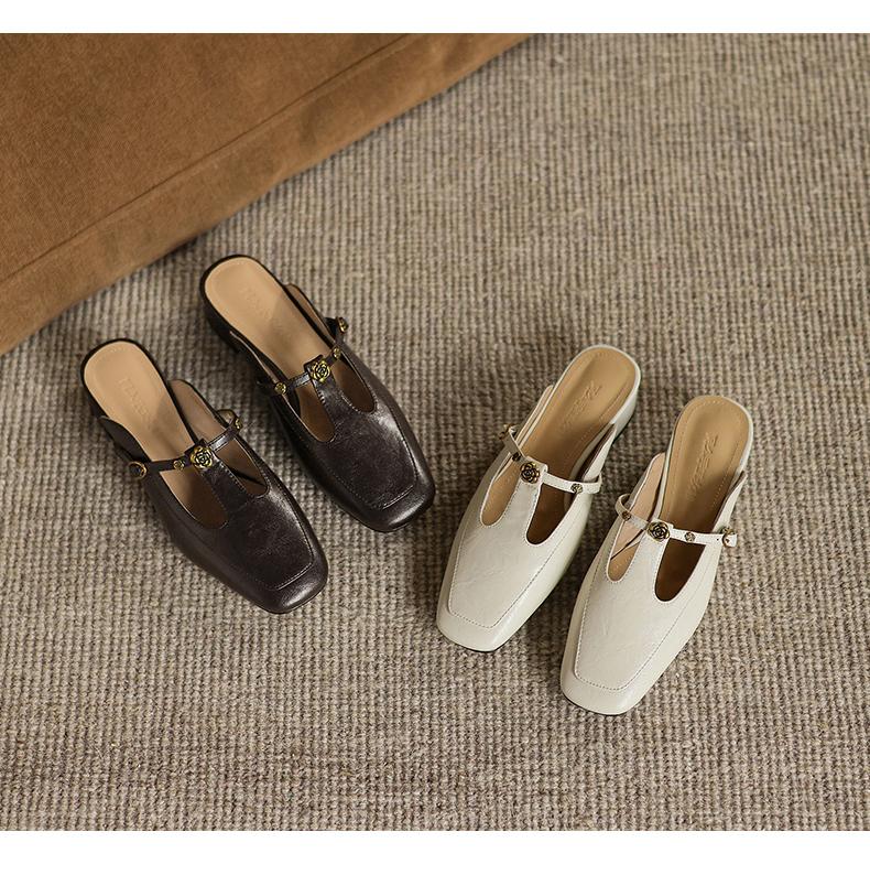 手工女鞋复古丁字扣包头穆勒鞋夏季外穿粗跟拖鞋软底软面3CM 商品图0