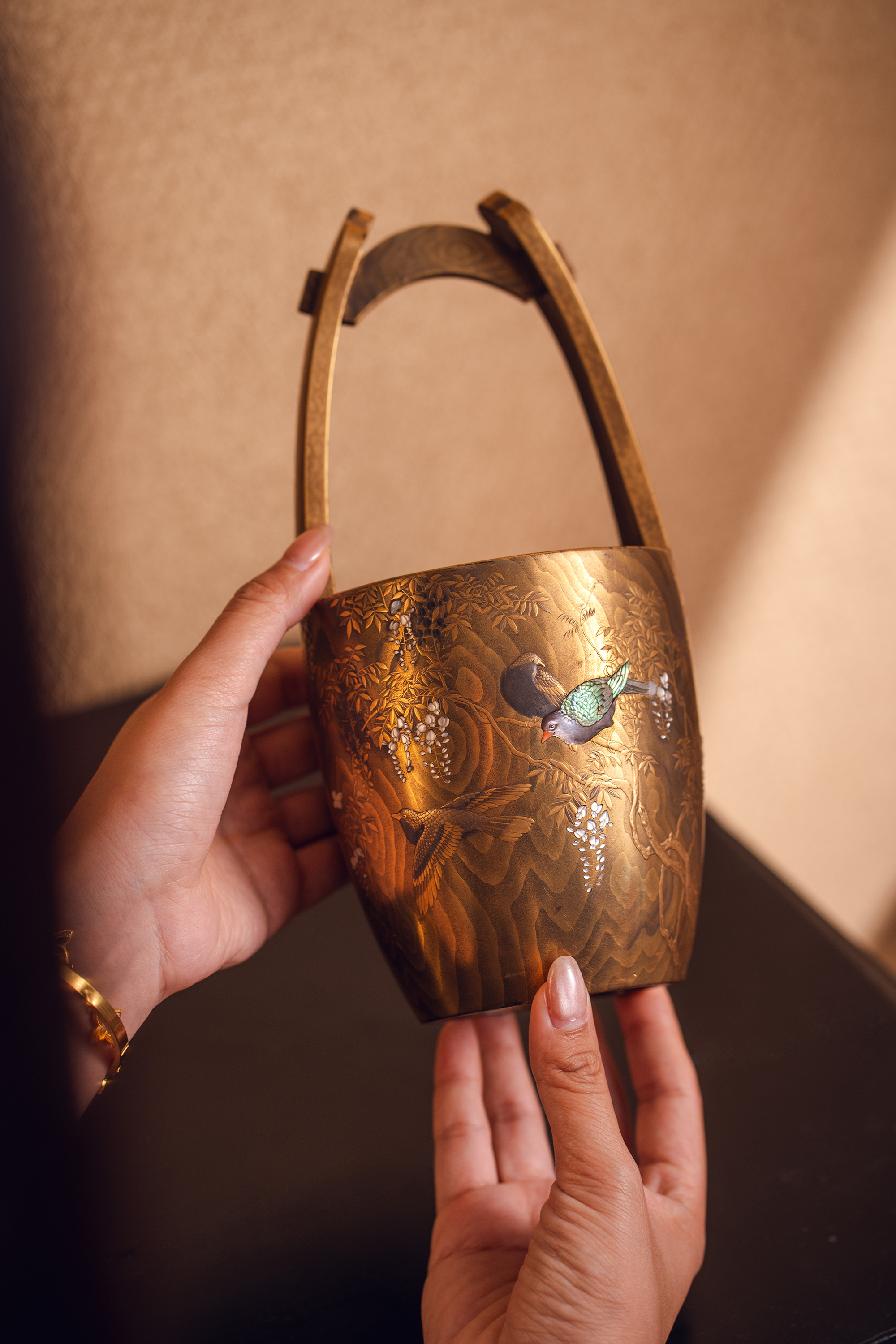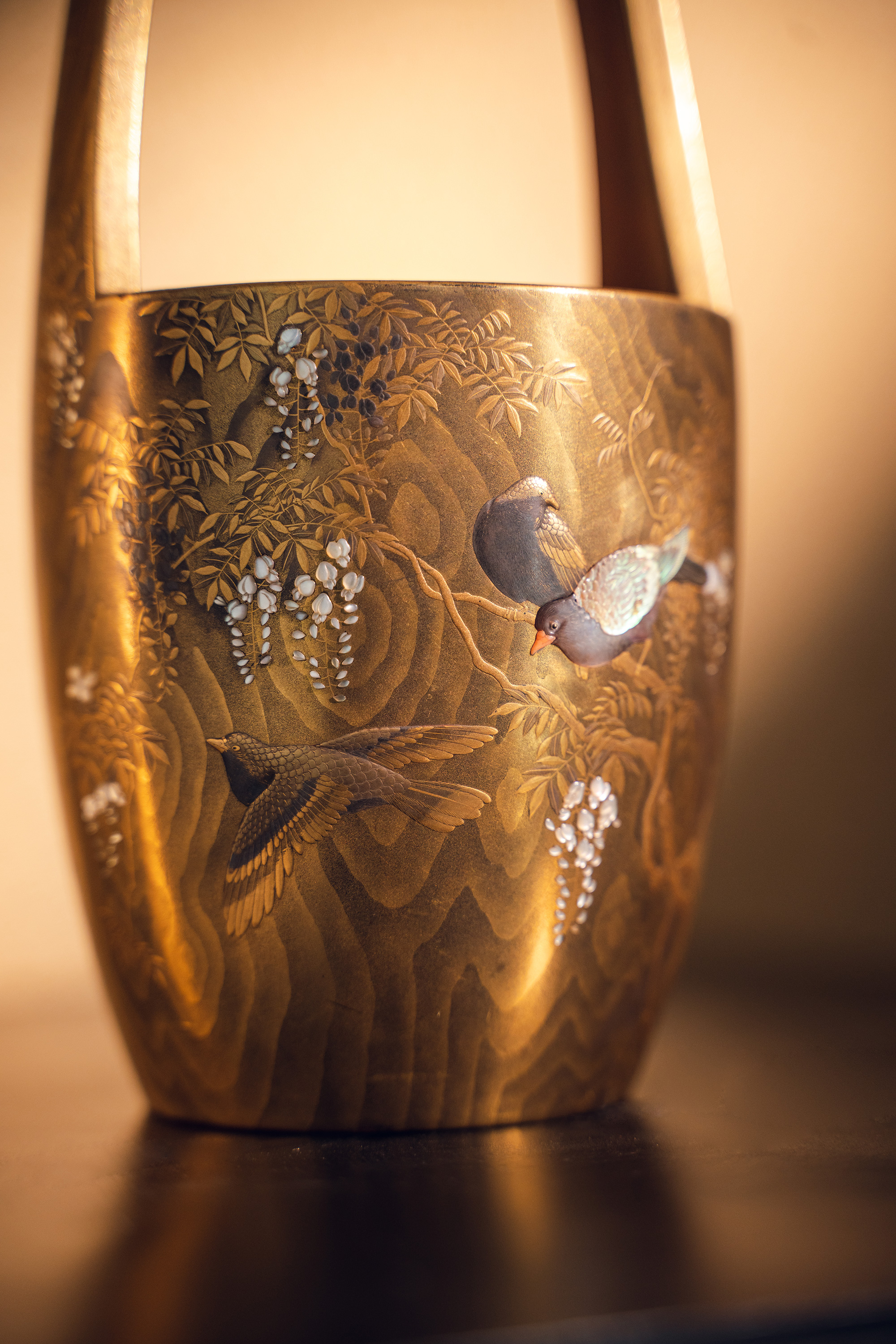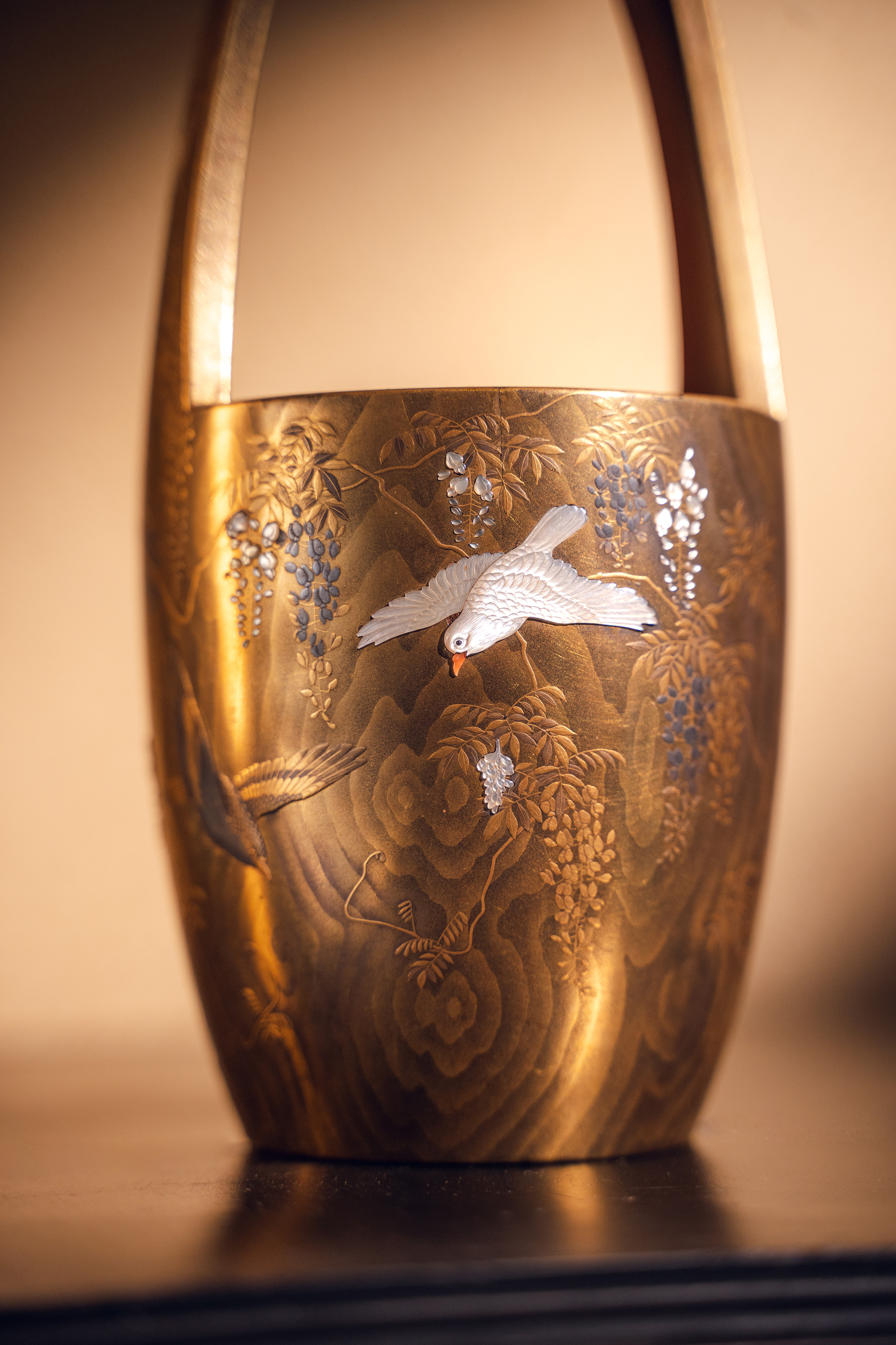 【已售】独角鹿西洋古董18世纪末日本江户时代出品「抱義斎 草鴻」款东瀛山林花鸟主题木胎金漆莳绘芝山镶嵌篮式花器