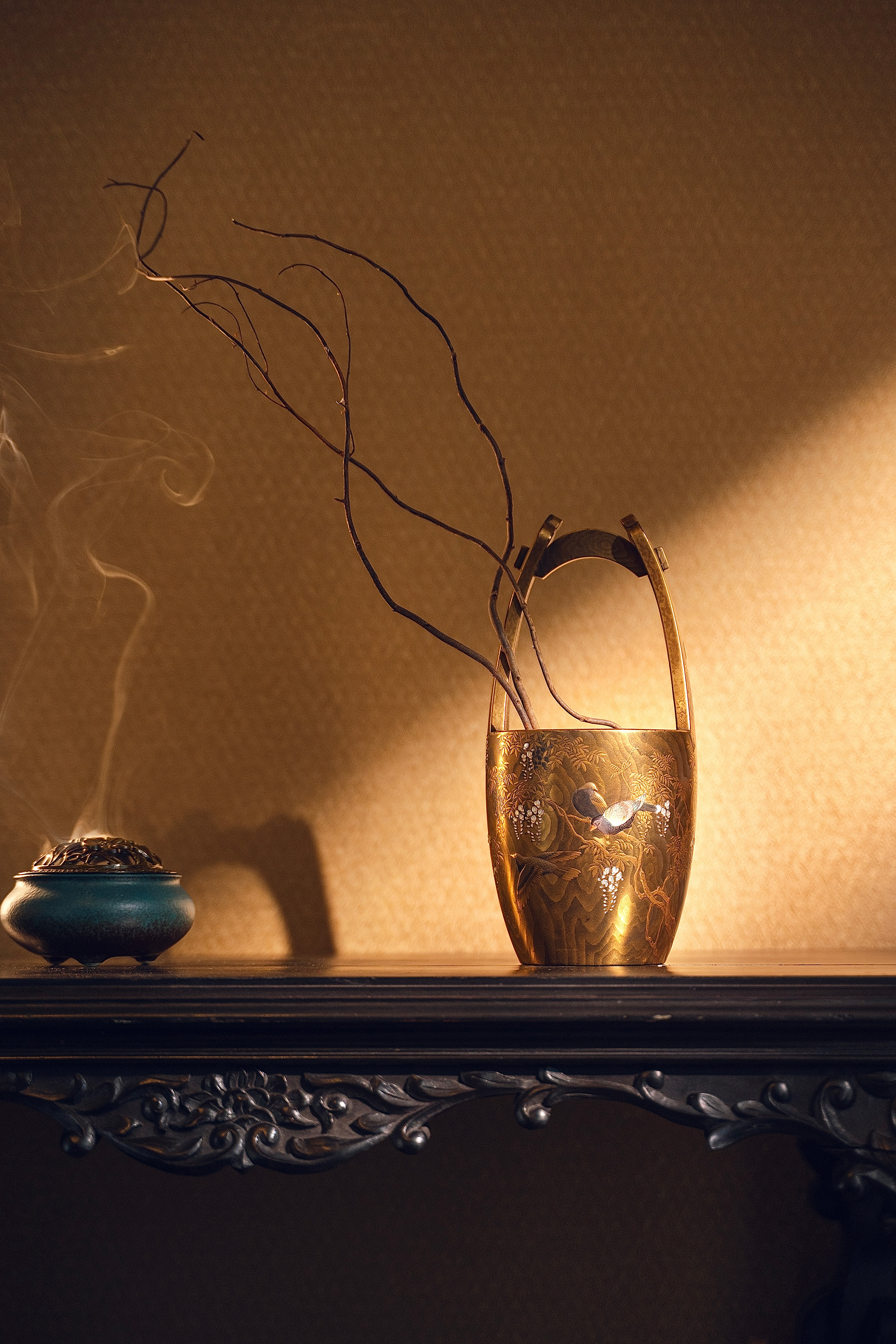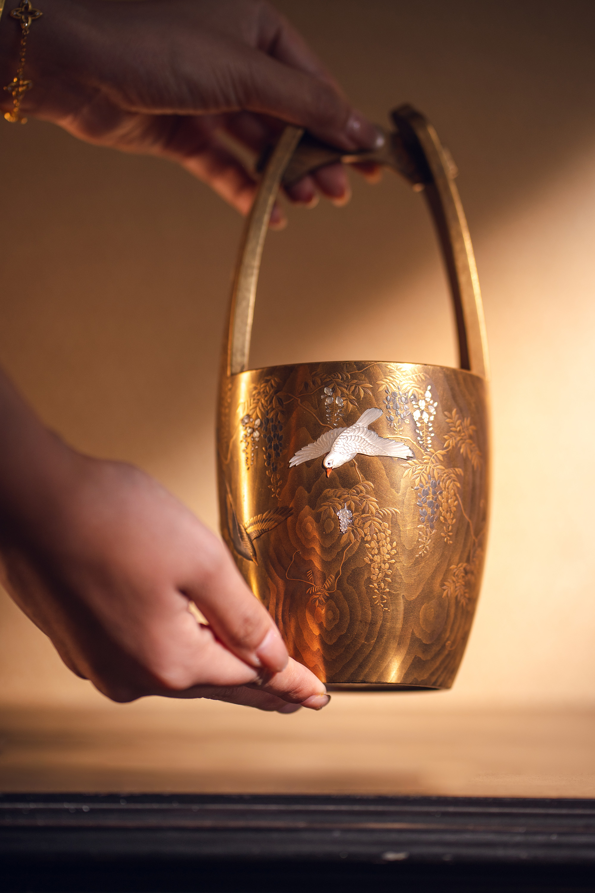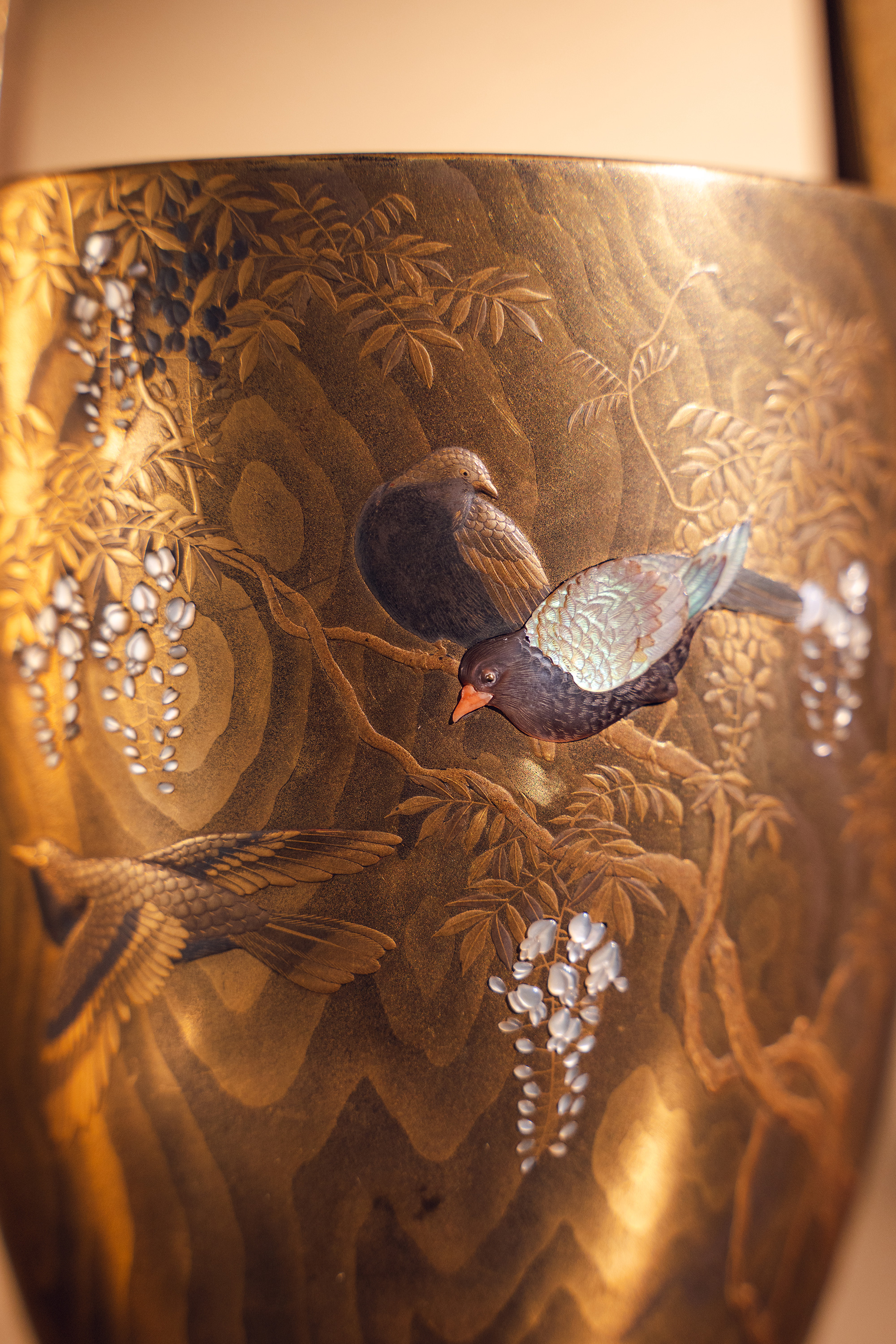 【已售】独角鹿西洋古董18世纪末日本江户时代出品「抱義斎 草鴻」款东瀛山林花鸟主题木胎金漆莳绘芝山镶嵌篮式花器
