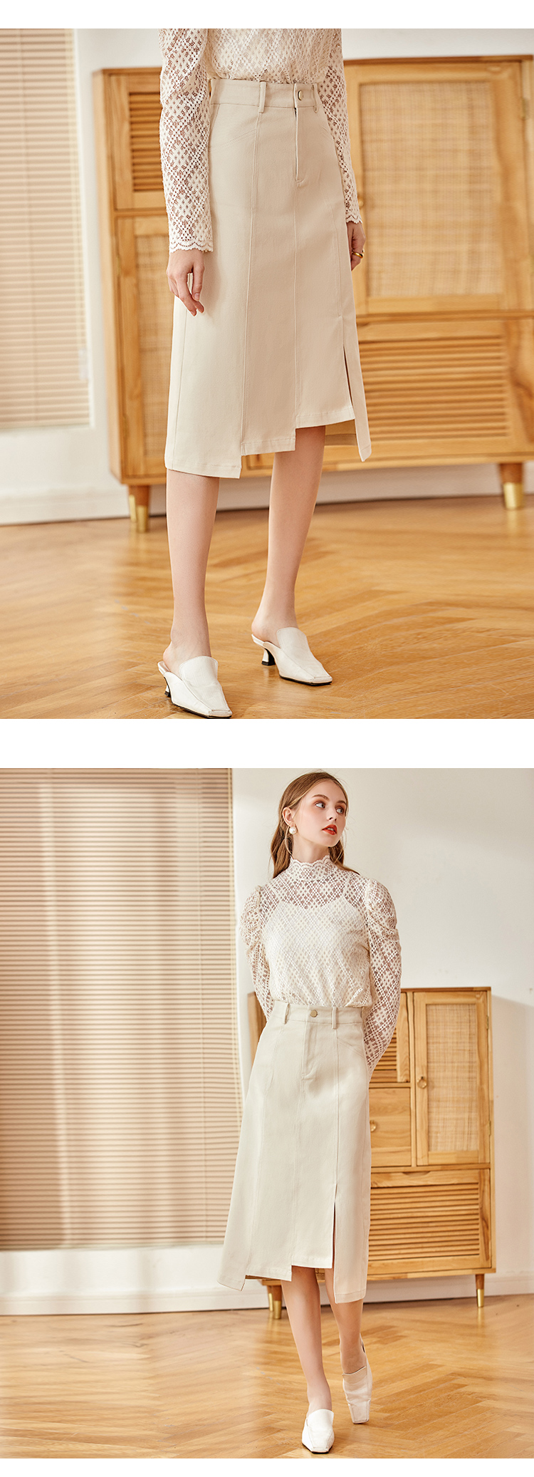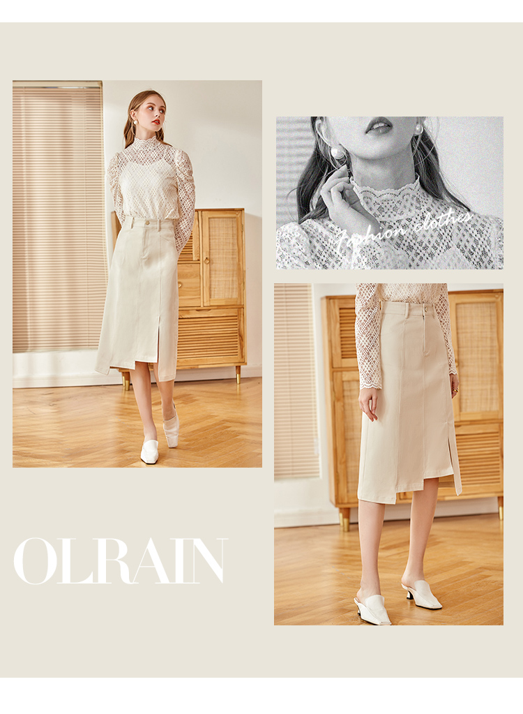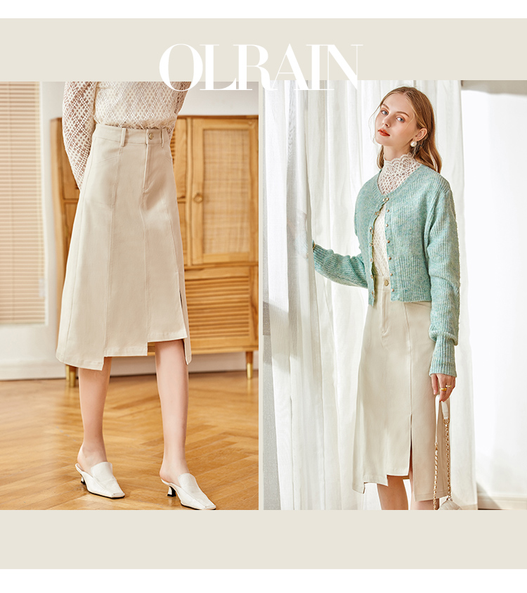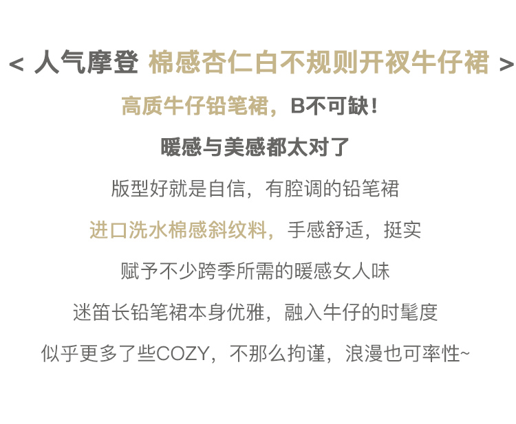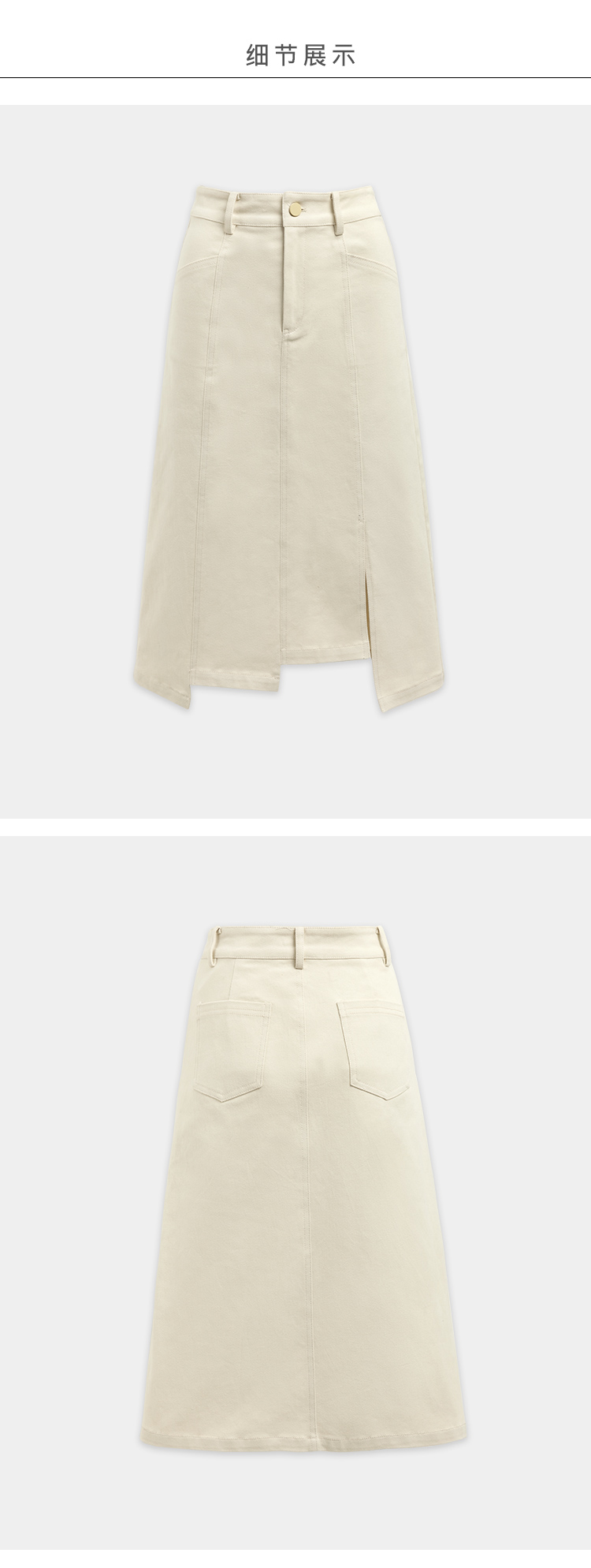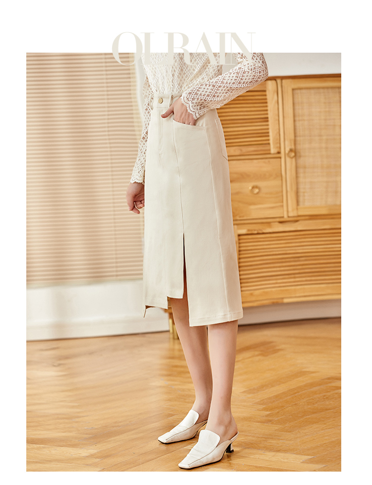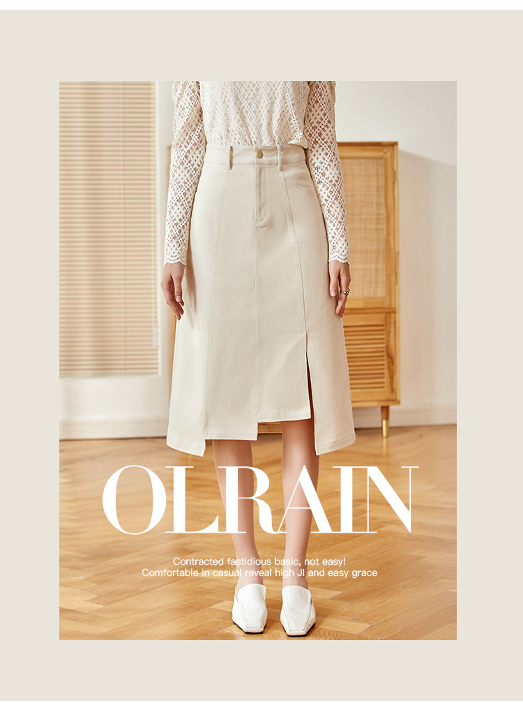 欧芮儿杏仁白半身裙女春季新款气质复古显瘦不规则开叉牛仔铅笔裙